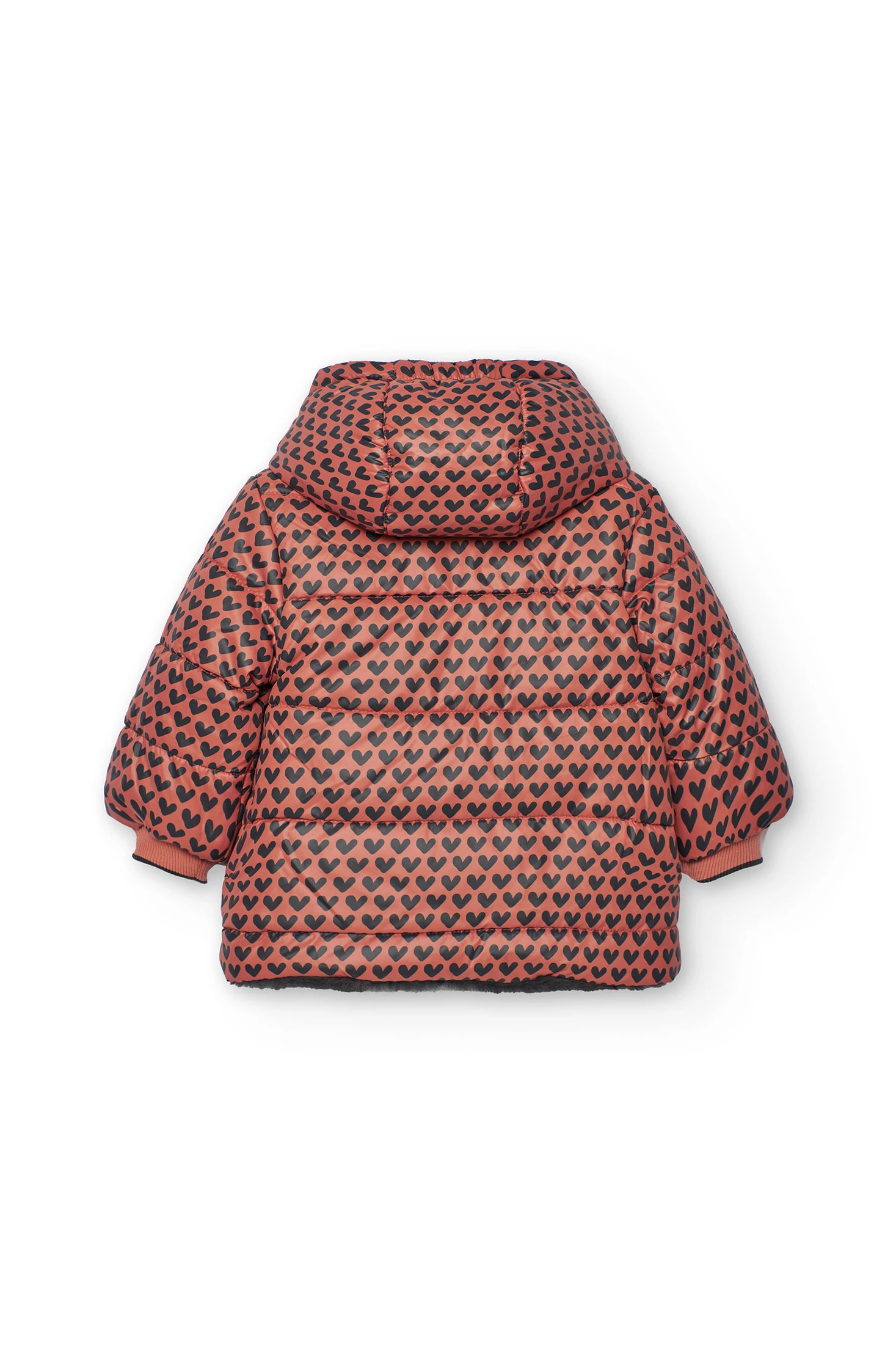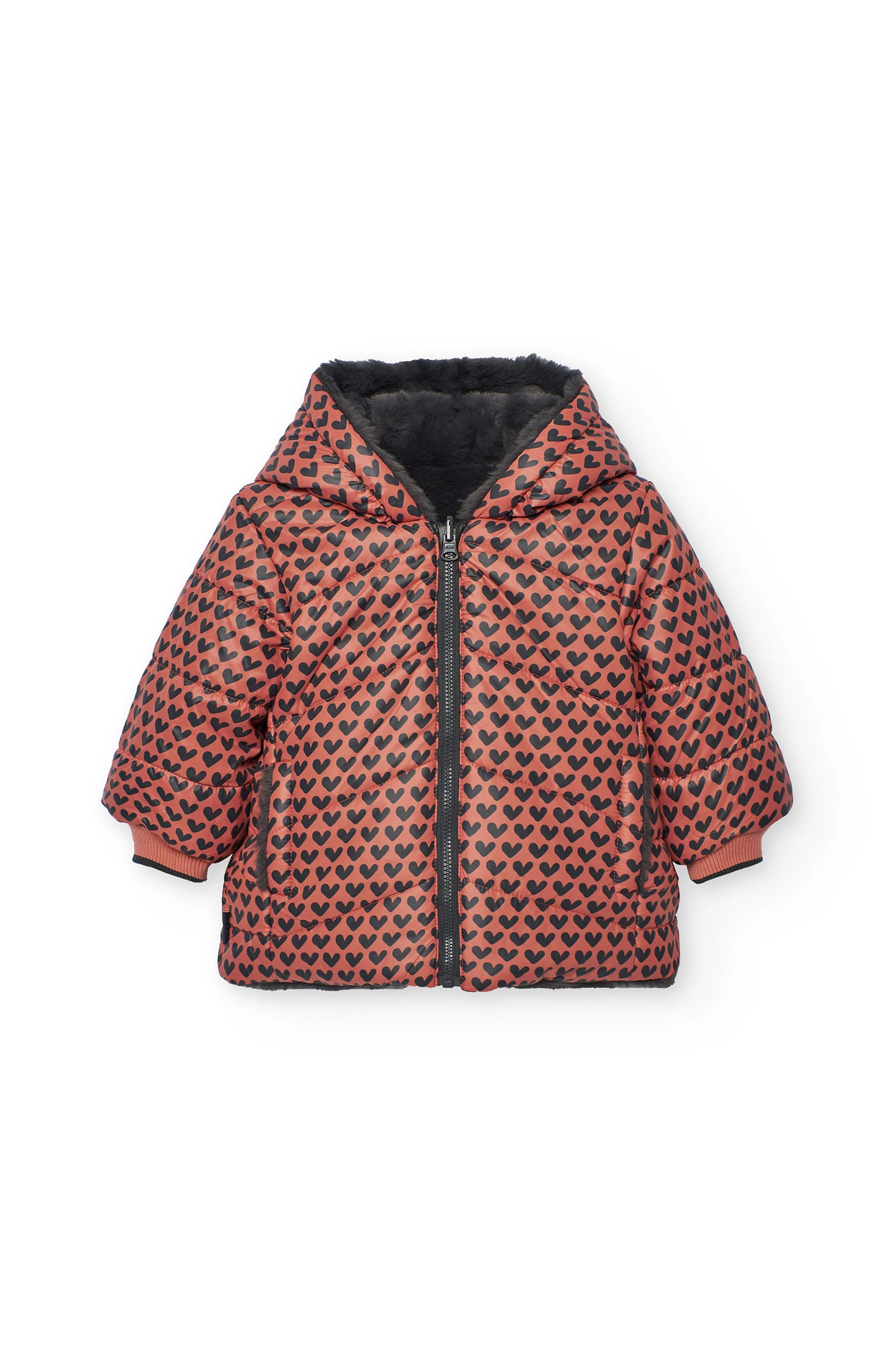 Parka reversibile per bambina, progettata per la stagione invernale, realizzata in tessuto tecnico con un incantevole motivo a cuori in rosso e nero. Il lato interno in morbido peluche grigio garantisce massima calore e comodità, proteggendo efficacemente dal freddo. Include un cappuccio per una protezione extra contro le intemperie, ideale per i giorni più ventosi. Disponibile in taglie dai 12 mesi ai 10 anni, questo capo offre versatilità e stile con il suo design reversibile e chiusura a cerniera, permettendo molteplici combinazioni con l’abbigliamento della tua piccola.