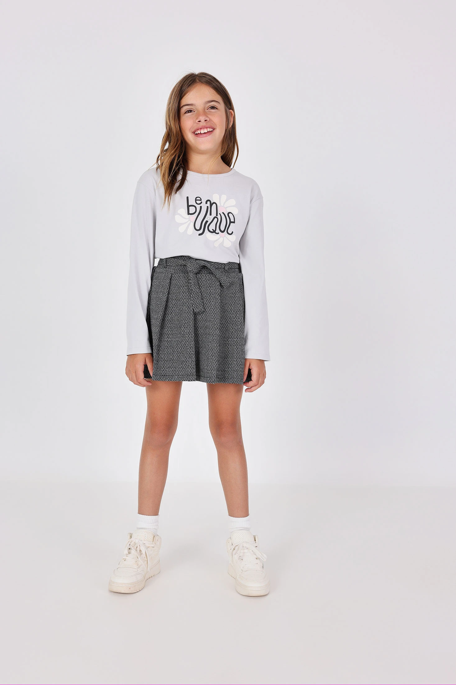 Gonna in maglia nera con un sottile motivo geometrico, perfetta per le stagioni autunnali e invernali, offre comfort e calore grazie al suo tessuto in maglia morbida. Disponibile in taglie dai 2 ai 14 anni, questo capo versatile si combina facilmente con t-shirt e bluse per ottenere un look elegante e pratico. Il suo design in nero classico la rende un capo base indispensabile che si adatta a qualsiasi occasione.