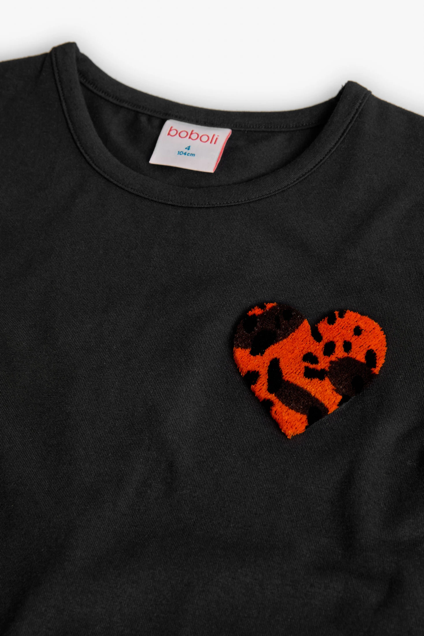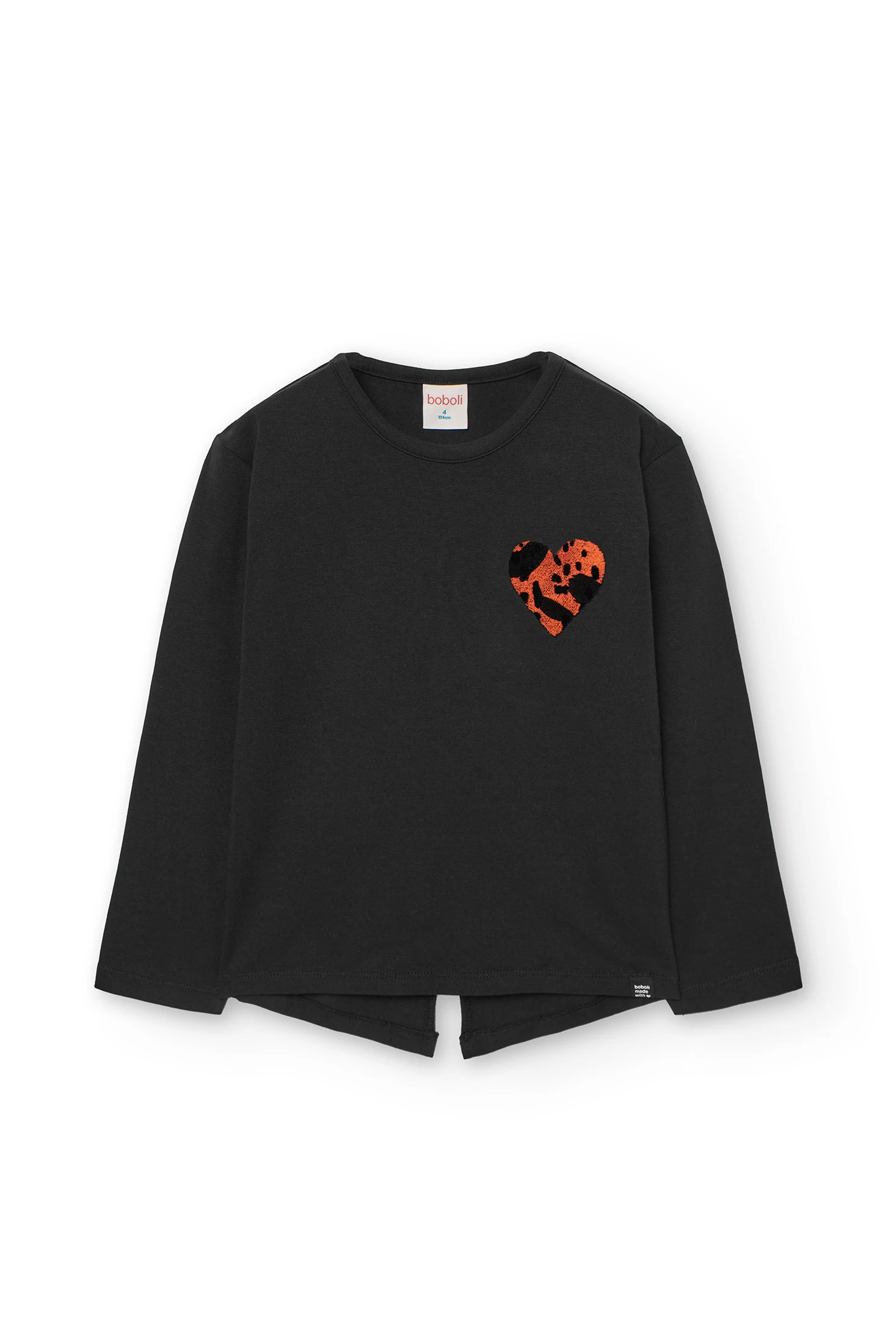 Maglietta in cotone per bambina, perfetta per le stagioni autunnali e invernali, realizzata con un tessuto morbido che offre comfort e calore. Presenta un elegante colore nero e un'applicazione a forma di cuore in tonalità arancioni e nere, che aggiunge un tocco distintivo di stile. Il suo design con maniche lunghe e collo rotondo la rende ideale per i giorni freschi. Disponibile nelle taglie dalla 2 alla 14, è un capo versatile che si adatta facilmente a diversi stili, permettendo di creare look casual e moderni.