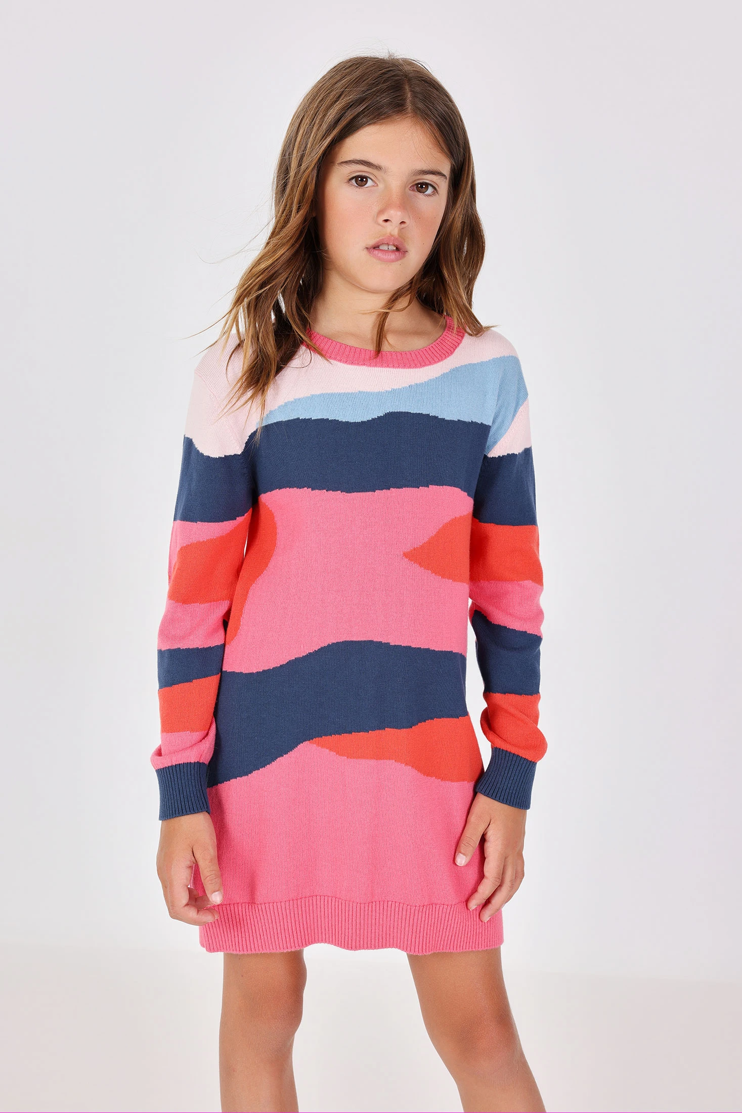 Abito per bambina combinato in vari colori, ideale per le stagioni autunnali e invernali. Realizzato in tessuto di maglia che fornisce comfort e calore, dotato di scollo rotondo e maniche lunghe. Perfetto per occasioni quotidiane ed eventi formali, può essere facilmente abbinato a collant o giacche. Disponibile in taglie da 2 a 14 anni, questo abito versatile offre un'opzione elegante per mantenere la tua bambina al caldo e alla moda.