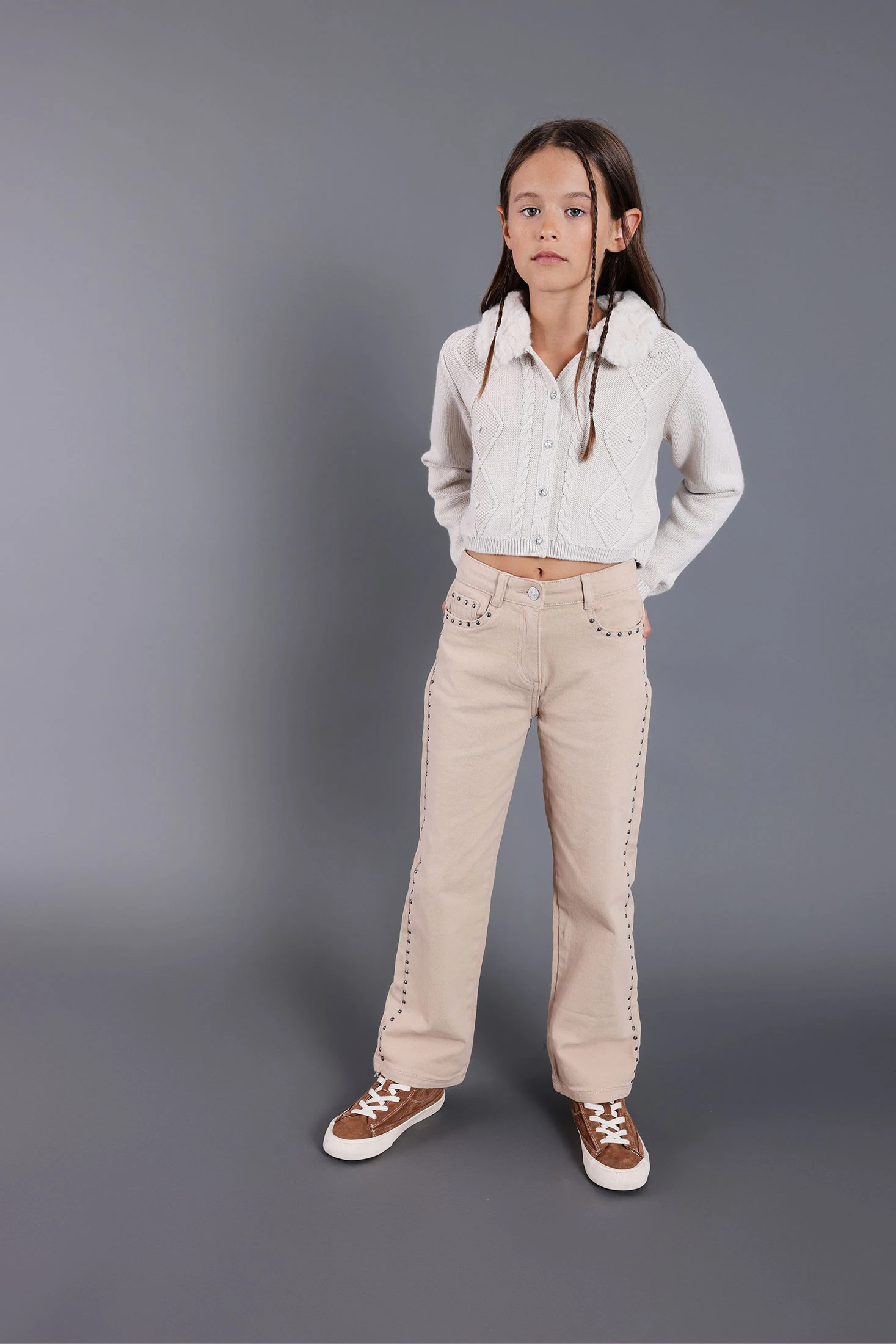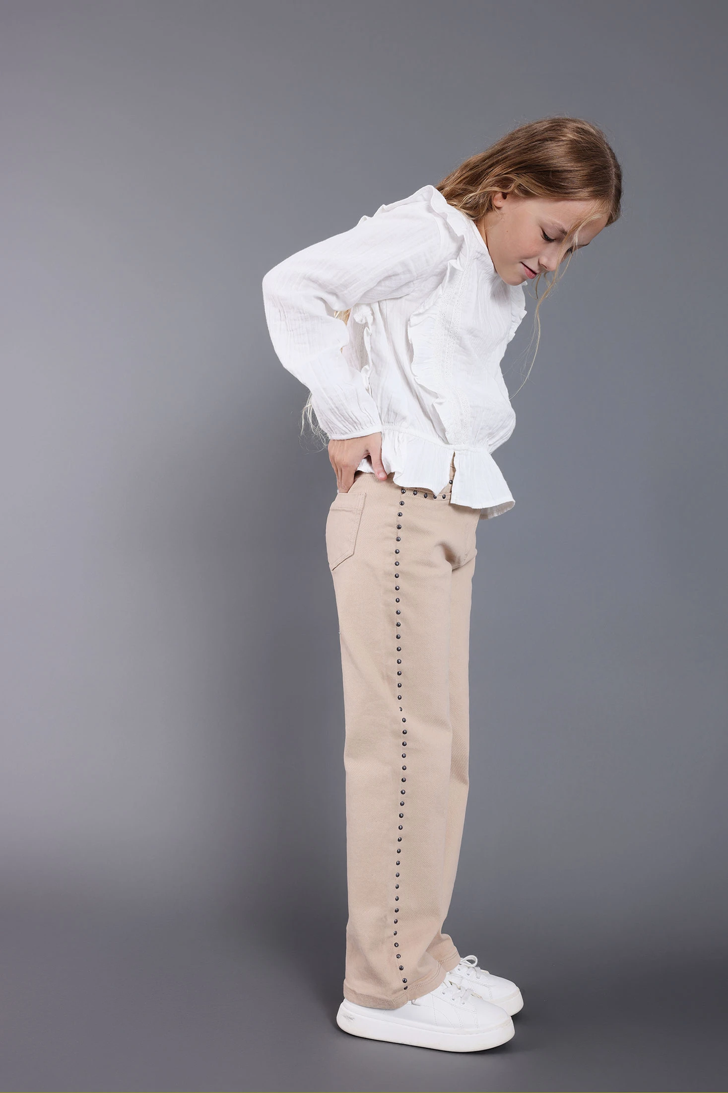 Pantaloni da bambina with studs con borchie un capo versatile e comodo, ideale per tutti i giorni. Realizzato in twill di alta qualità con un tocco elastico, offre libertà di movimento senza perdere la sua forma originale. Disponibile in varie taglie per adattarsi a bambine di diverse età, è perfetto da abbinare con magliette o bluse. Ideale per qualsiasi stagione, il suo design classico permette di creare outfit sia informali che più eleganti. I genitori apprezzeranno la sua durata e la facile manutenzione, rendendolo un'opzione pratica e stilosa per il guardaroba infantile.