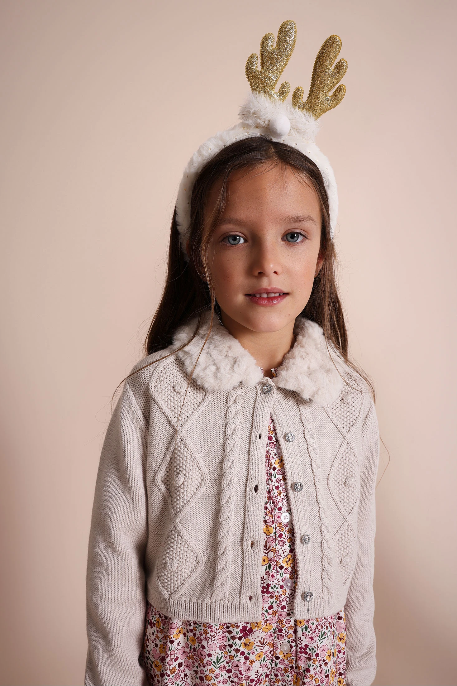Cardigan beige per bambina, perfetta per le stagioni autunnali e invernali grazie al suo tessuto morbido e caldo. Si distingue per il suo design intrecciato che aggiunge un tocco elegante e sofisticato. Il colore neutro facilita l'abbinamento con una varietà di capi, permettendo di creare look chic e confortevoli. Dotata di bottoni nella parte frontale, garantisce praticità, mentre le sue maniche lunghe offrono calore nei giorni più freddi. Disponibile in taglie dai 12 mesi ai 10 anni, è un capo essenziale nel guardaroba infantile.
