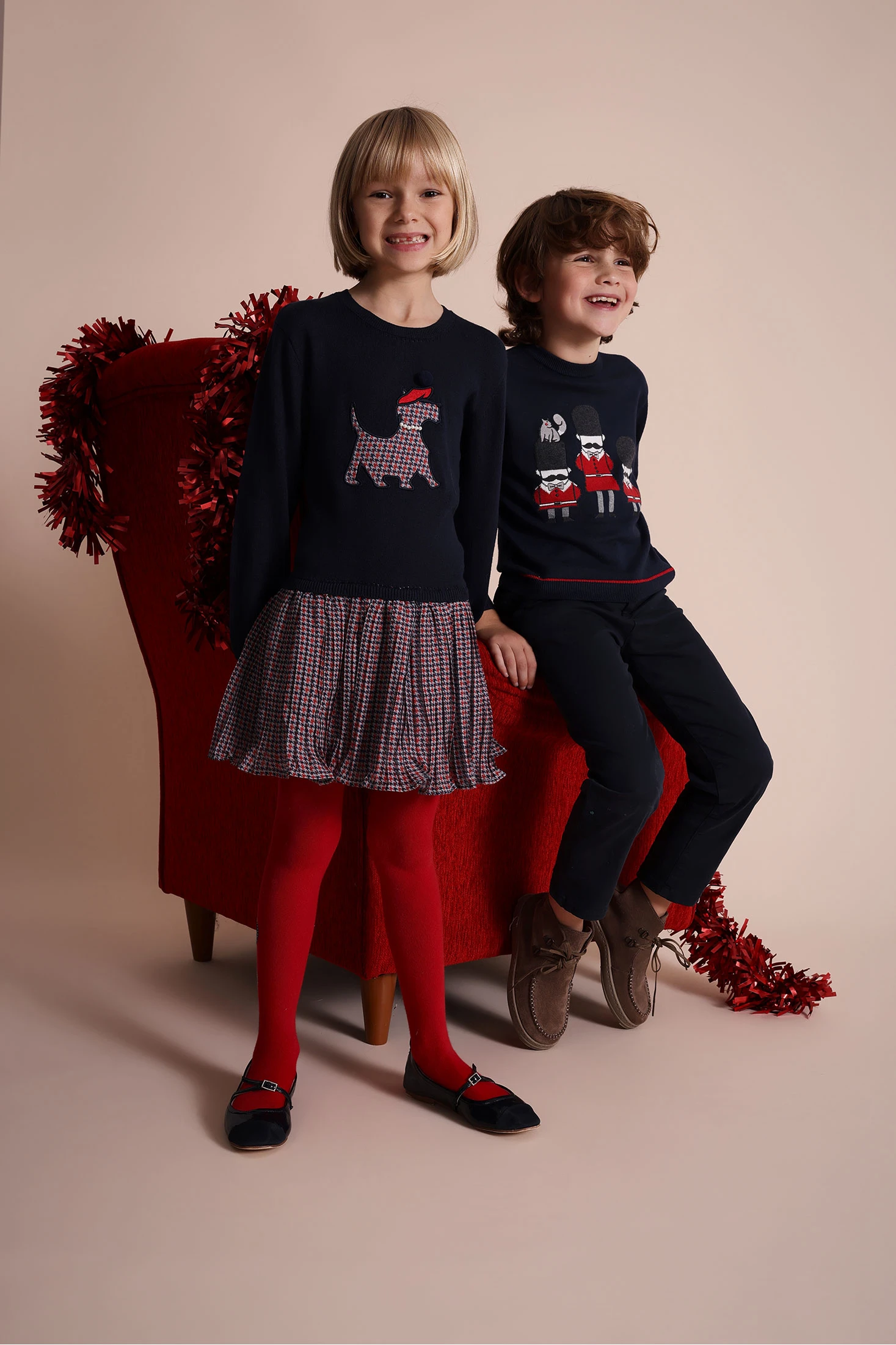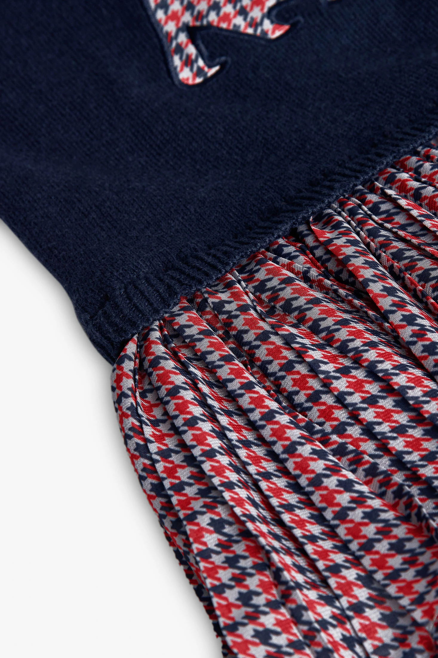 Abito per bambina, ideale per l'autunno e l'inverno, confezionato in morbido tessuto a maglia che garantisce comfort e calore. Presenta un colore blu navy con un elegante motivo a quadri, aggiungendo un tocco classico e stilizzato. Il design include un collo rotondo e maniche lunghe, perfetto per mantenere il calore nei giorni freddi. Disponibile in taglie da 12 mesi a 10 anni, può essere facilmente abbinato a collant o leggings per un outfit completo e sofisticato.