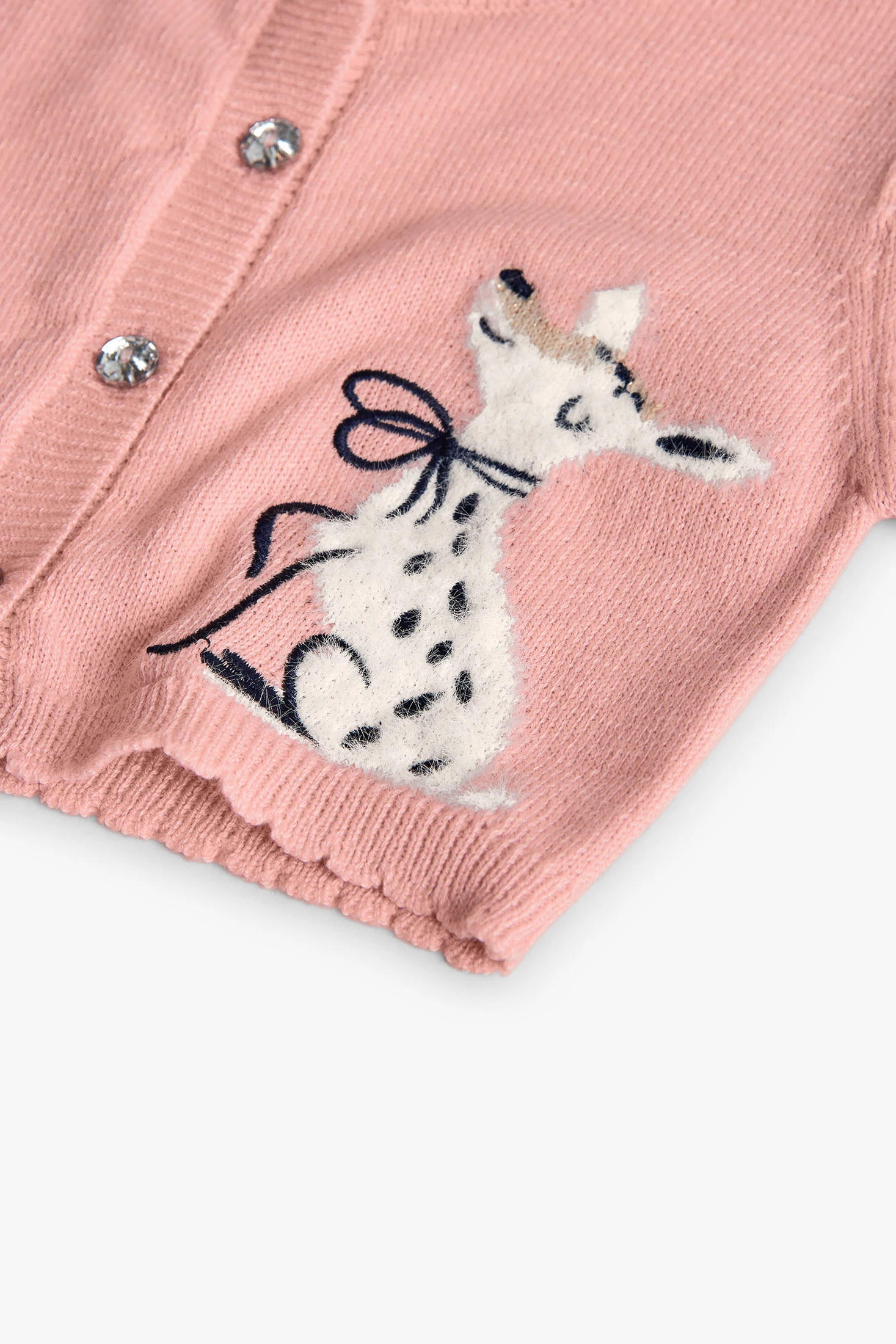 Cardigan rosa per bambina che offre calore e comfort nei mesi autunnali e invernali. Realizzato con un materiale morbido, incorpora un adorabile ricamo di animale che aggiunge un tocco divertente. Presenta un collo rotondo, chiusura con bottoni e maniche lunghe, ideali per i giorni più freddi. Disponibile nelle taglie da 12 mesi a 10 anni, completa facilmente qualsiasi abbigliamento, offrendo un look tenero e accogliente per la tua bambina.