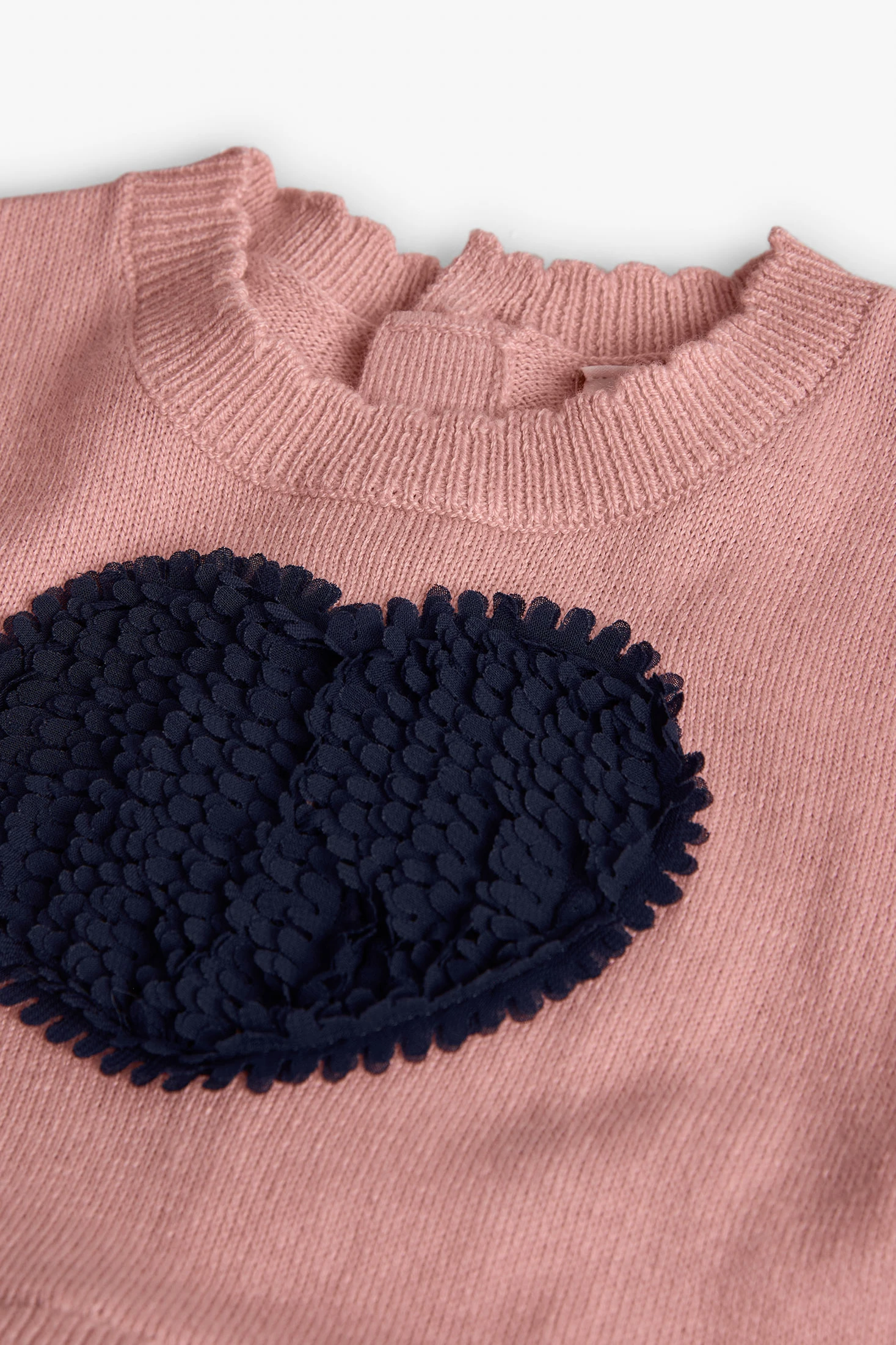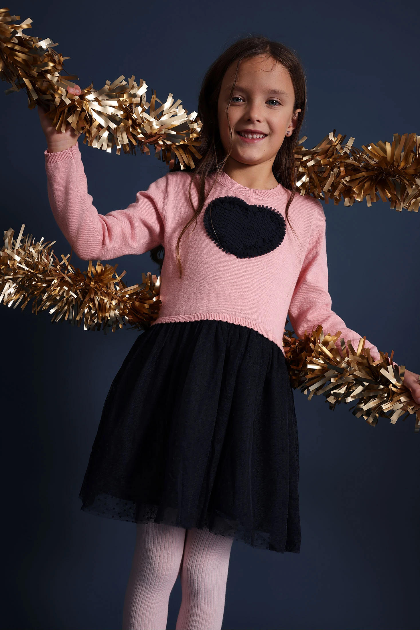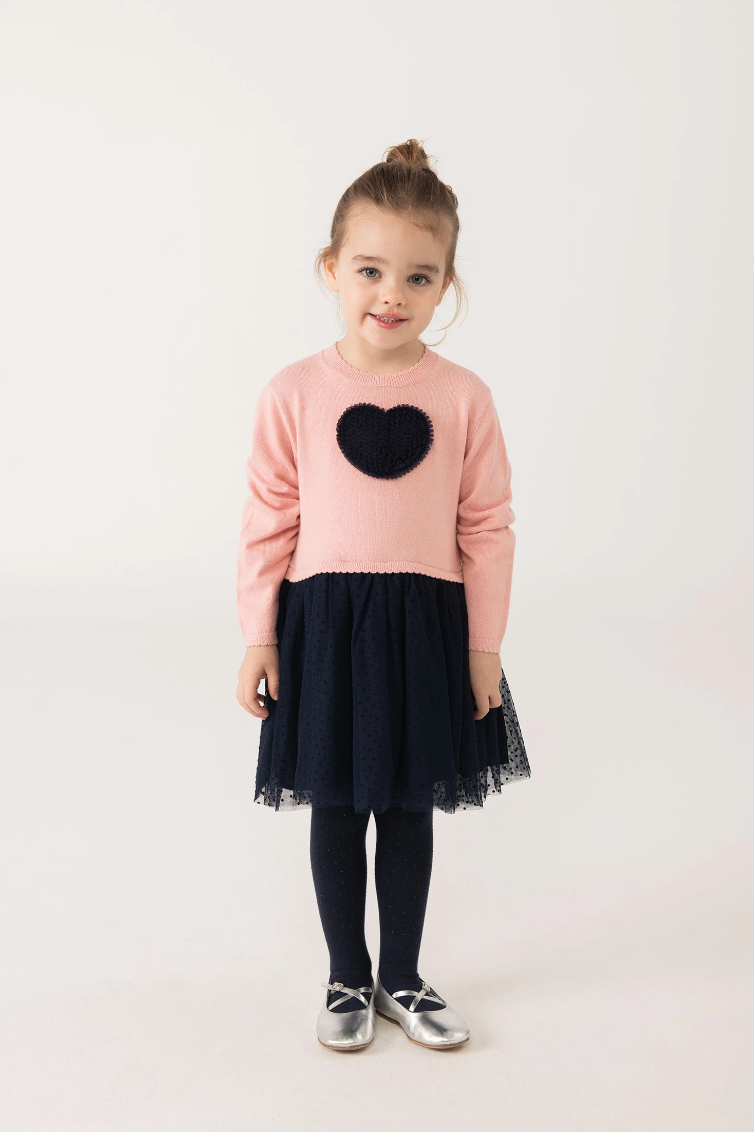 Abito in maglia rosa con cuore ideale per bambine, realizzato in maglia morbida che garantisce comfort e calore nei giorni freddi d'autunno e inverno. Design con un incantevole cuore blu scuro sulla parte anteriore, che aggiunge un tocco di tenerezza. Disponibile in taglie dai 12 mesi ai 10 anni, questo abito è perfetto per eventi speciali e occasioni formali. Completa il look con collant opachi e una giacca di lana per un insieme elegante e caldo.