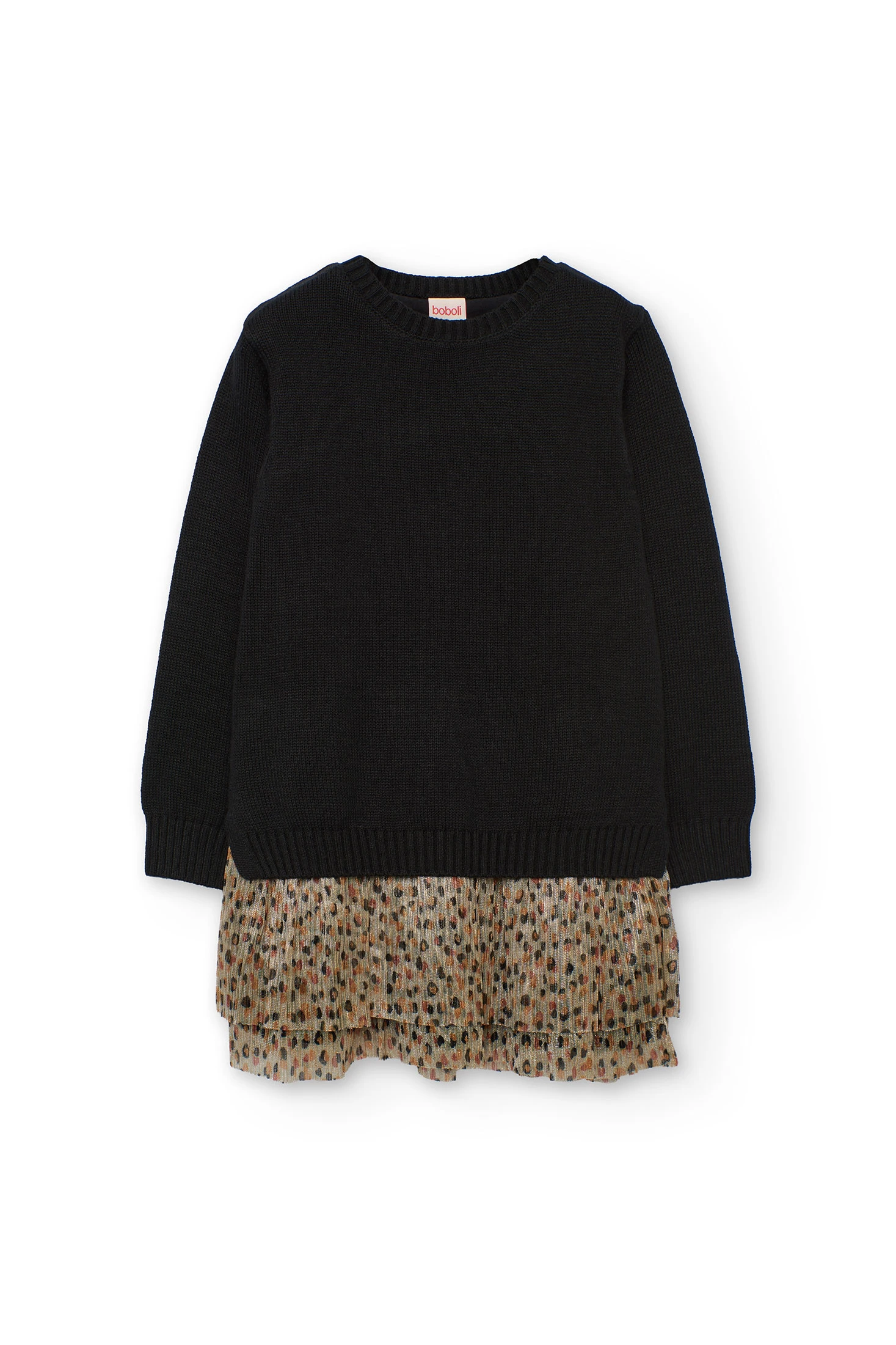Abito in maglia nero con fiori, ideale per bambine durante le stagioni autunnale e invernale, assicura calore e stile. Realizzato in un tessuto morbido, presenta un elegante design floreale in toni marroni e beige nella parte inferiore, conferendo un tocco distintivo. Collo rotondo e maniche lunghe lo rendono perfetto per i giorni freddi, disponibile in taglie da 2 a 14 anni. Abbinatelo con semplici collant per ottenere un look versatile e comodo in ogni occasione.