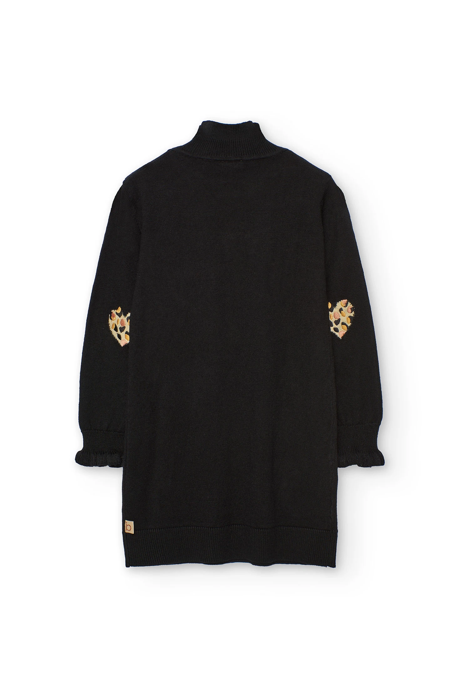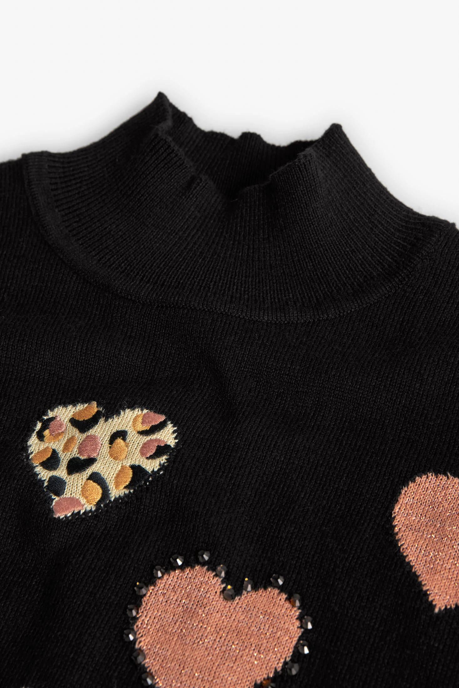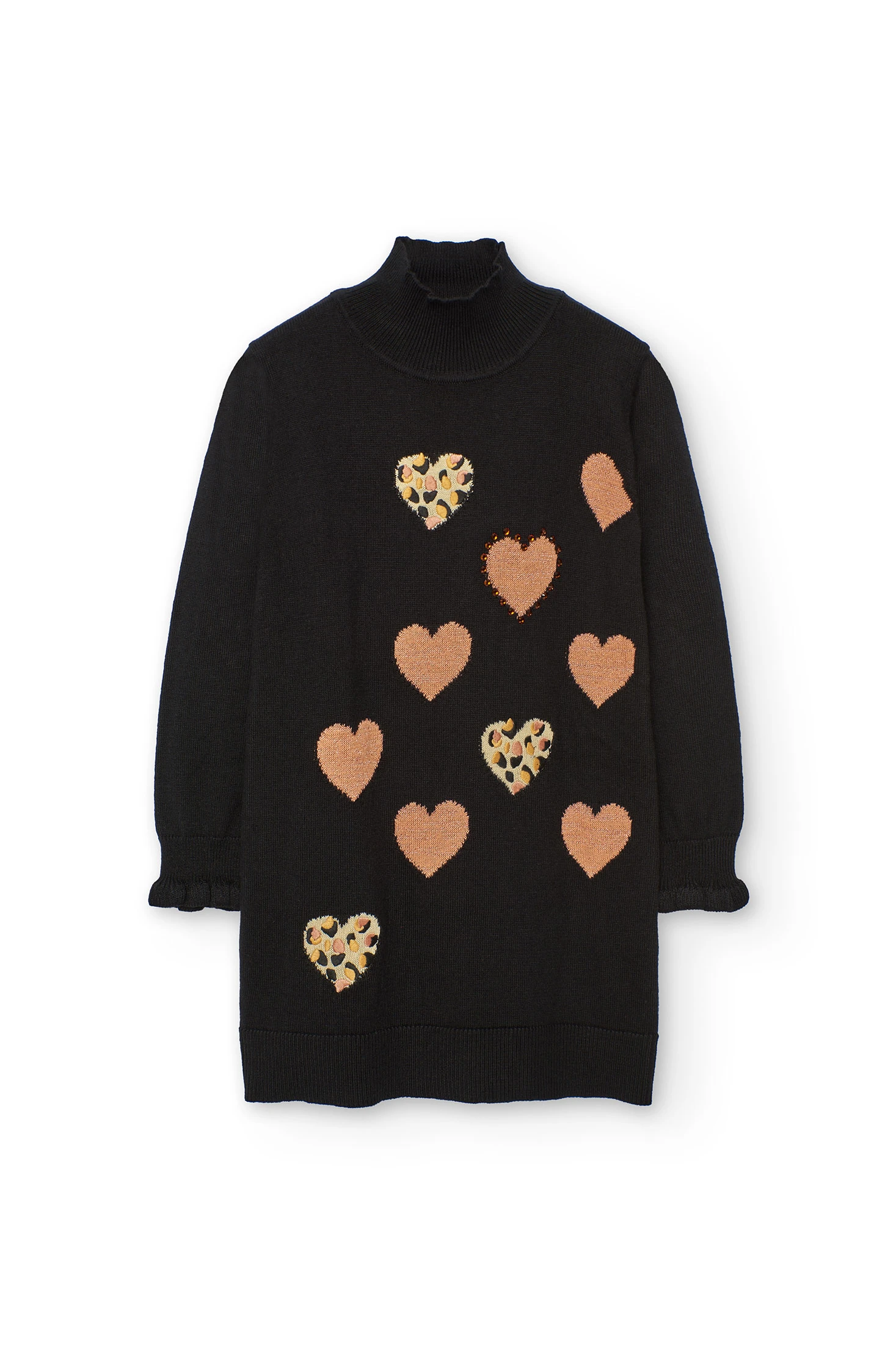 Abito a maglia nero per bambina, decorato con cuori, perfetto per le stagioni autunnali e invernali. Realizzato in un tessuto morbido e caldo, garantisce comfort e stile nei giorni più freddi. Progettato con un collo alto e maniche lunghe, è ideale per mantenere la tua piccola al caldo. I cuori in tonalità marroni aggiungono un tocco allegro e affascinante al design. Disponibile nelle taglie dalla 2 alla 14 anni, questo abito è un'opzione versatile che può essere facilmente abbinata sia per occasioni speciali che per un look casual.