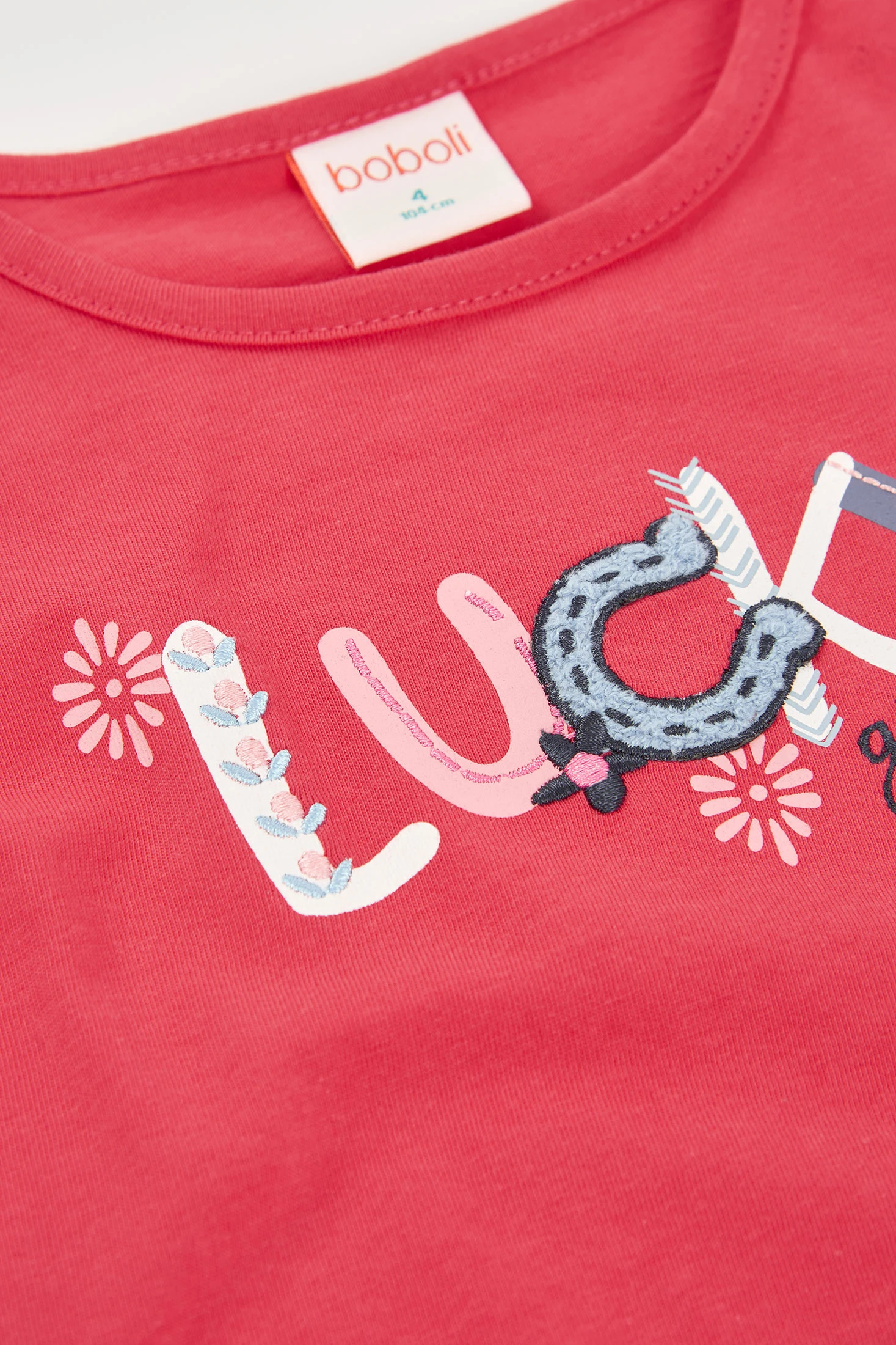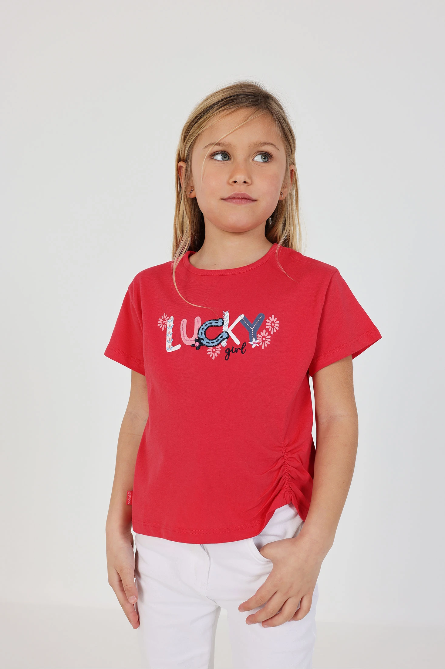 Maglietta in cotone per bambina, perfetta per un look fresco e comodo. Di colore rosa acceso, presenta un design con stampa di lettere in vari colori che aggiunge un tocco divertente. Il suo materiale in cotone assicura morbidezza e traspirabilità, ideale per l'uso quotidiano. Con collo rotondo e maniche corte. Le taglie disponibili vanno da 12 mesi a 10 anni. Questo modello è ideale da abbinare con jeans o gonne per uno stile casual e moderno.