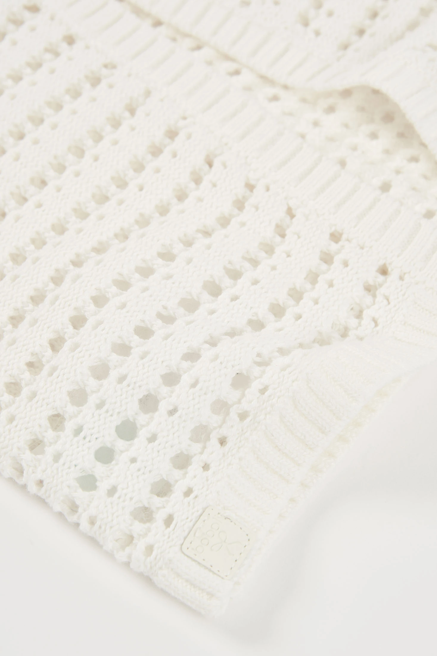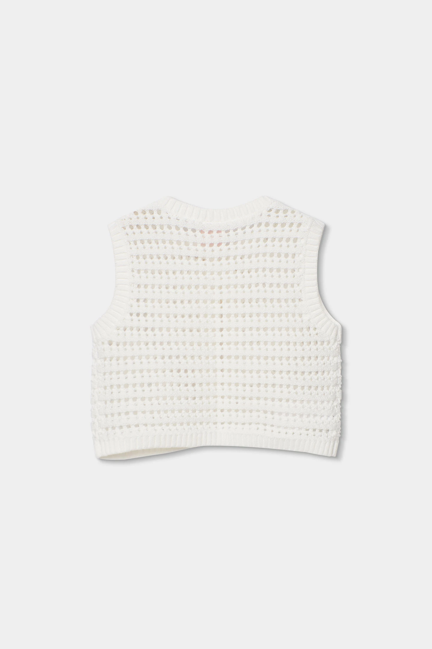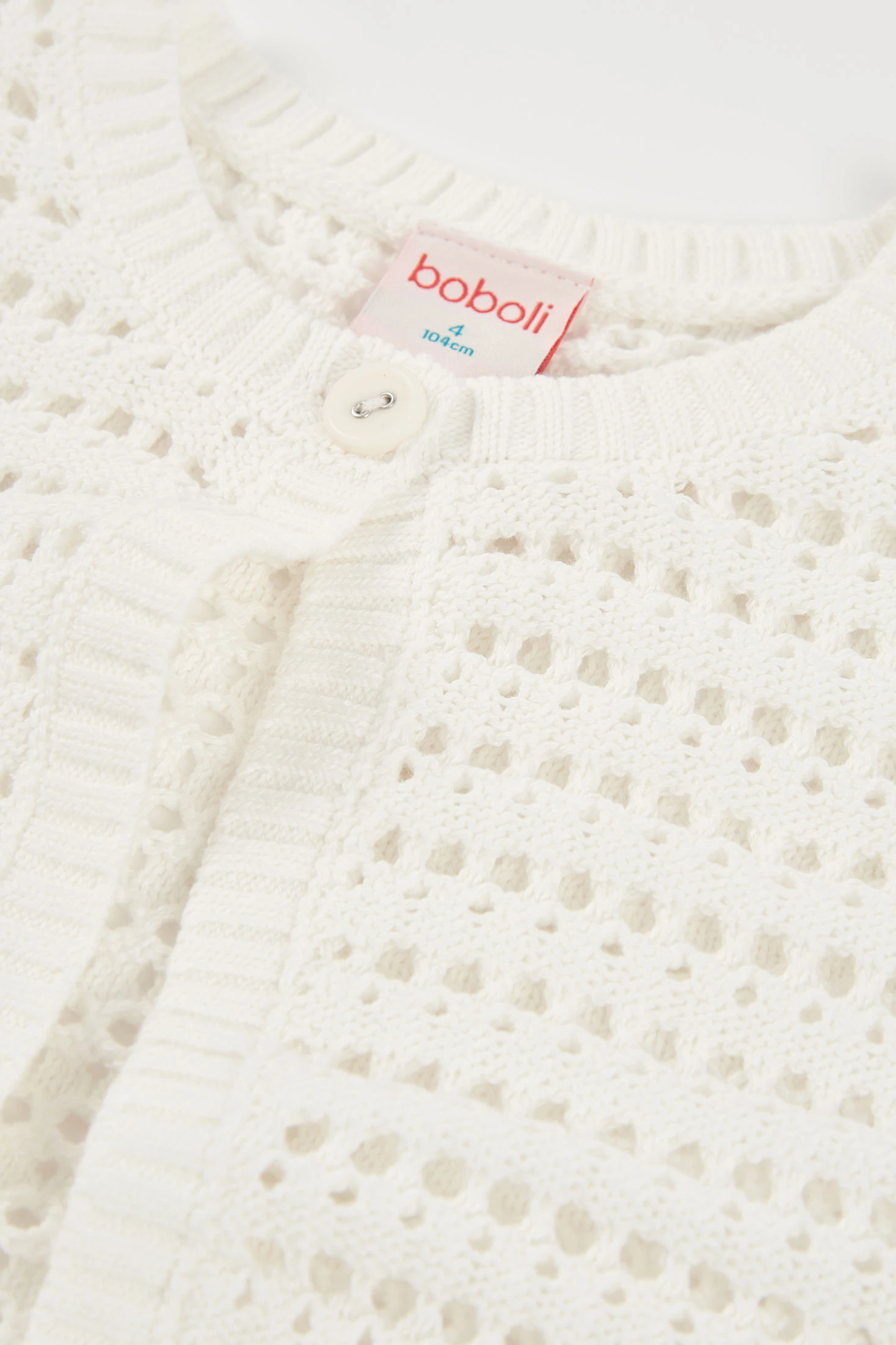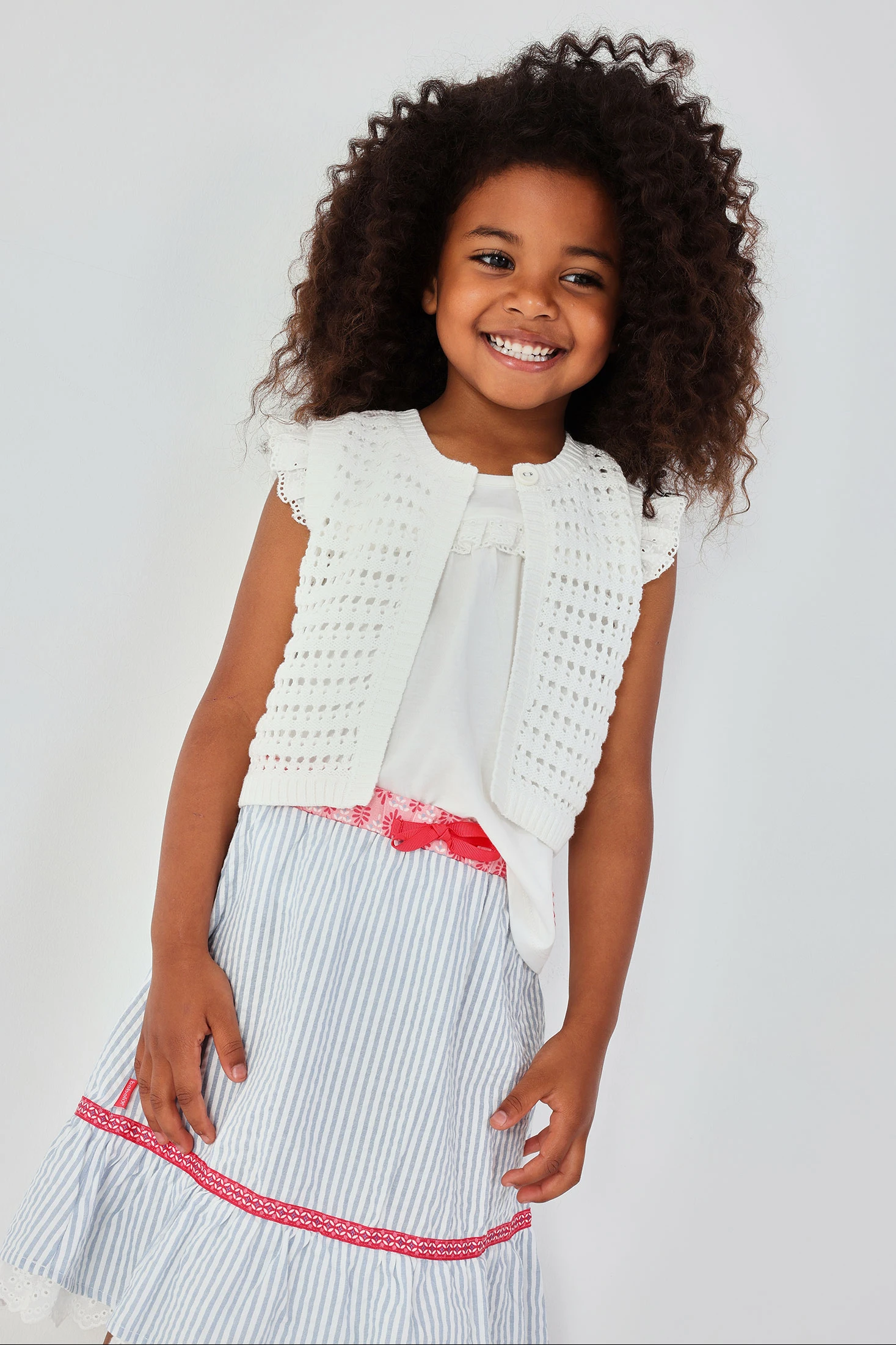 Gilet in maglia di cotone per bambina, versatile e comodo, ideale per diverse occasioni. Il design di colore bianco presenta un punto traforato che offre leggerezza e un tocco moderno. Perfetto da abbinare con bluse o vestiti. Disponibile in taglie da 12 mesi a 10 anni, si adatta a bambine di diverse età.