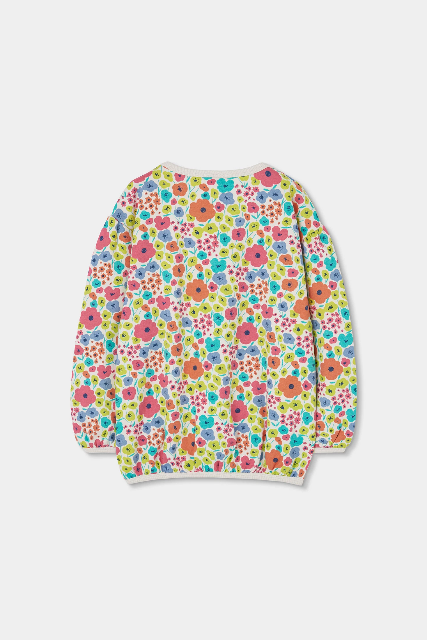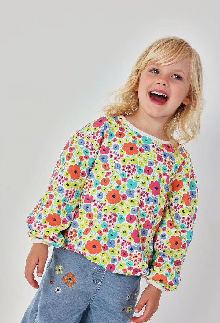 Felpa in pile per bambina, perfetta per la mezza stagione. Presenta una vivace stampa floreale in vari colori che la rende unica. Il design include scollo rotondo e maniche lunghe. Disponibile nelle taglie da 12 mesi a 10 anni, è un'opzione versatile per ogni occasione. Abbinala a jeans o leggings per un look casual e stiloso durante i giorni più freschi.