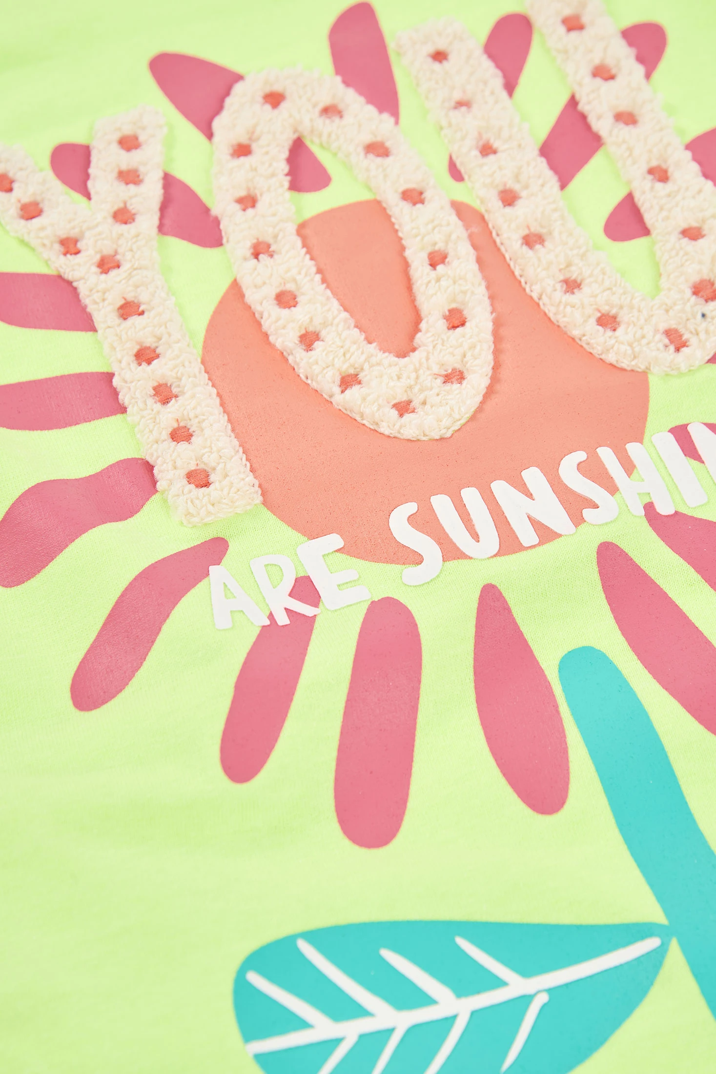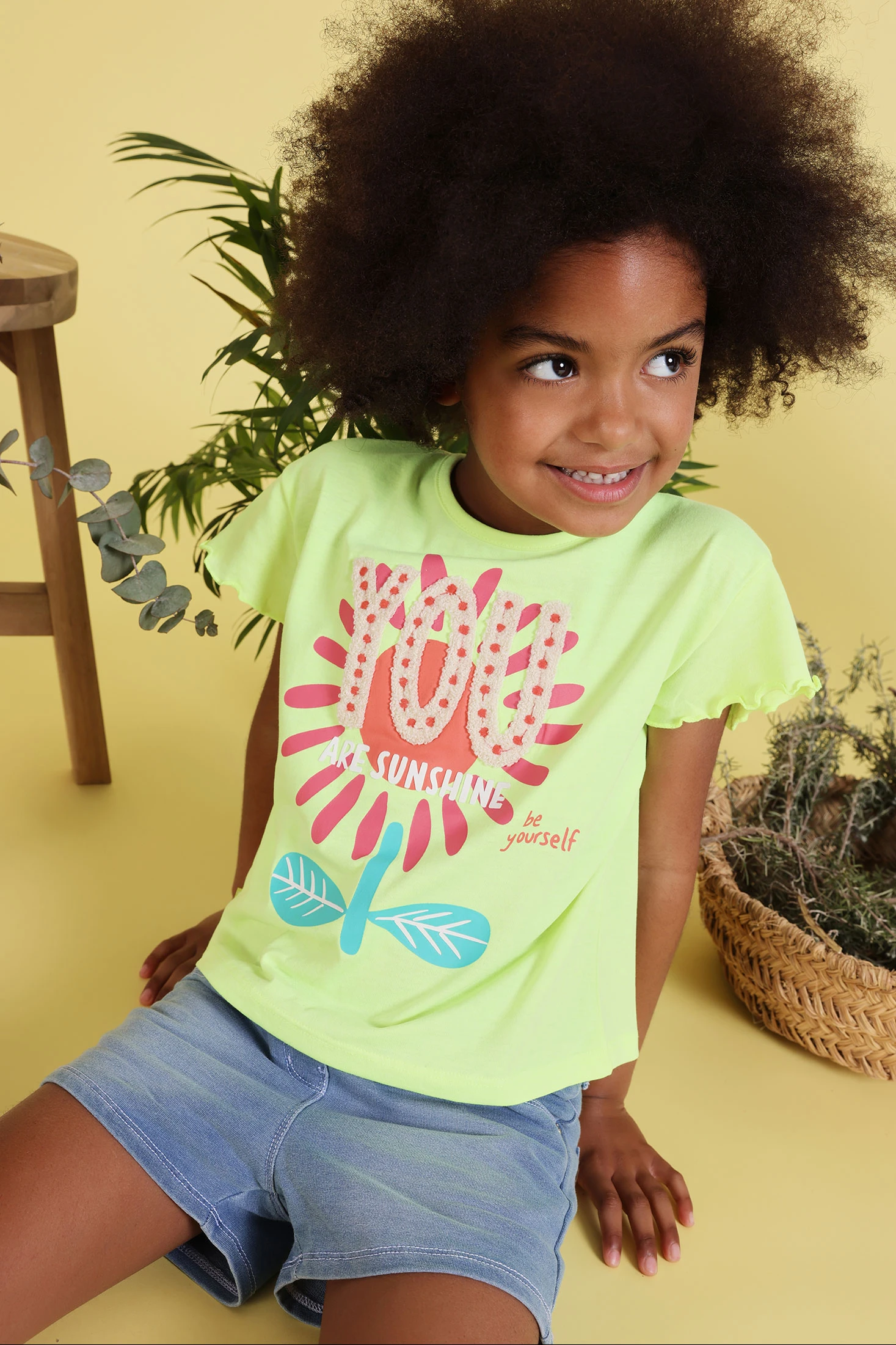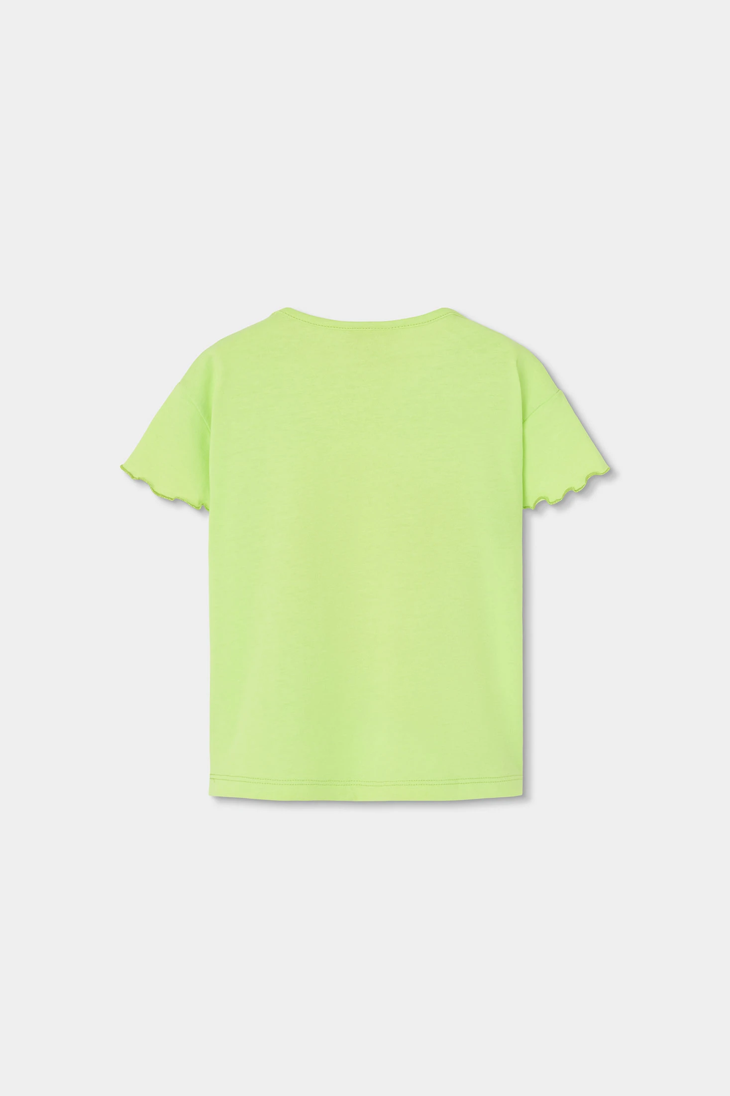 Maglietta in maglia per bambina realizzata in cotone, perfetta per l'estate. Di colore lime, presenta un design con una stampa centrale colorata, ideale per aggiungere un tocco allegro a qualsiasi outfit. Con collo rotondo e maniche corte, è comoda e fresca. Disponibile in taglie da 12 mesi a 10 anni, è perfetta da abbinare con jeans o gonne per un look casual e divertente.