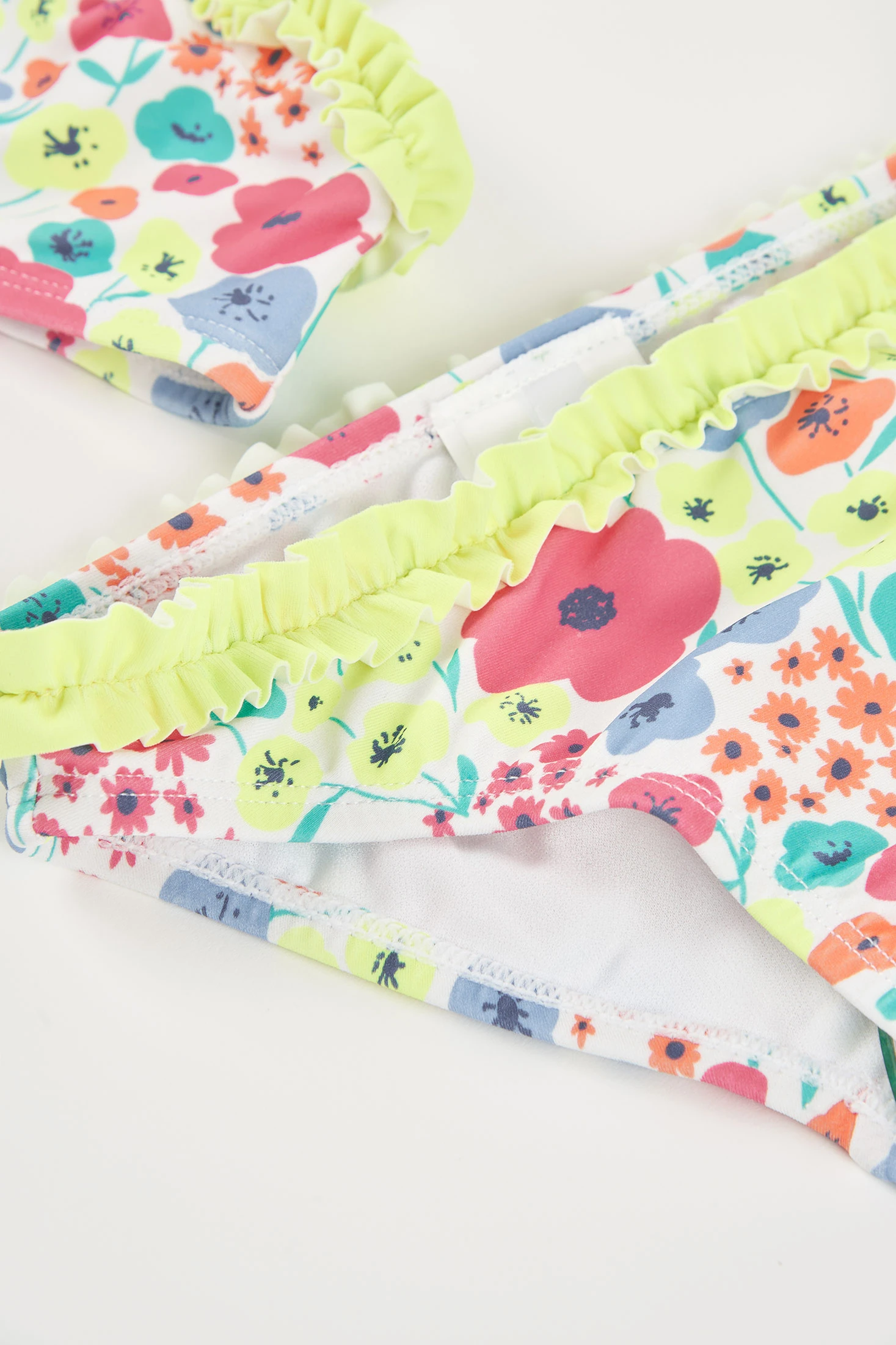 Bikini per bambina con stampa floreale multicolore. Il design del top è con scollo asimmetrico. Realizzato in un materiale elastico e resistente all'acqua, assicura comfort e durata. Le taglie disponibili vanno dai 12 mesi ai 10 anni. Ideale per godersi una giornata in spiaggia o in piscina con stile e comfort. Indumento con protezione solare UPF50.