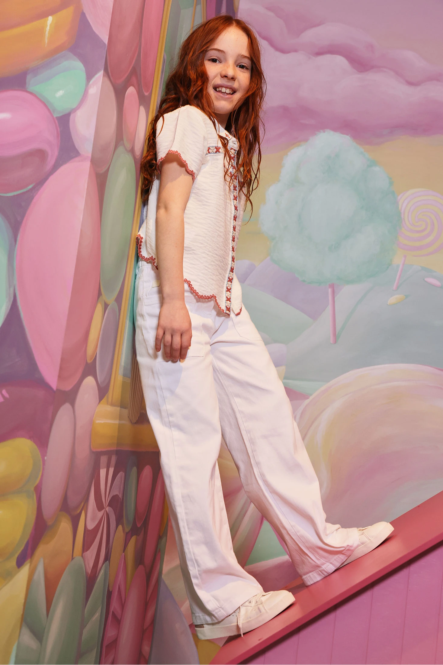 Pantalone in fustagno elasticizzato, dal design ampio di colore bianco, pensato per età dai 12 mesi ai 10 anni. Con tasche anteriori e elastico in vita per regolare secondo necessità. È un capo perfetto da abbinare con qualsiasi stile e colore. Un buon basico da avere nell'armadio.