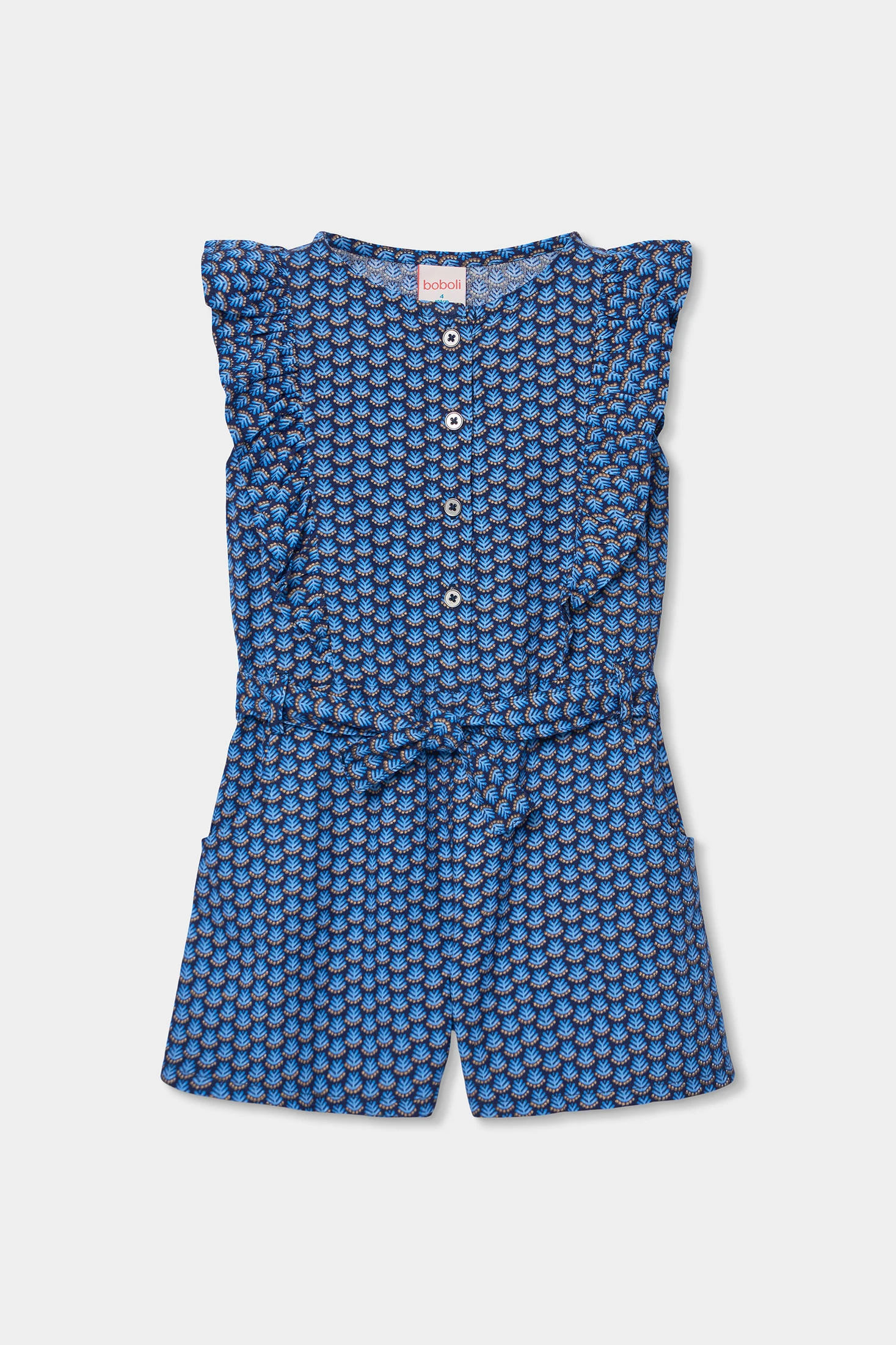 Tuta stampata per bambino ideale per la stagione primaverile ed estiva. Realizzata in tessuto tecnico, offre comfort e freschezza. Presenta un design vibrante blu con un motivo ripetitivo che aggiunge dinamismo. Questa tuta ha bottoni frontali ed è senza maniche, perfetta per i giorni più caldi. Le taglie disponibili vanno da 12 mesi a 5 anni, garantendo una vestibilità perfetta man mano che crescono. Un'opzione pratica e stilosa per mantenere i piccoli alla moda durante il clima caldo.
