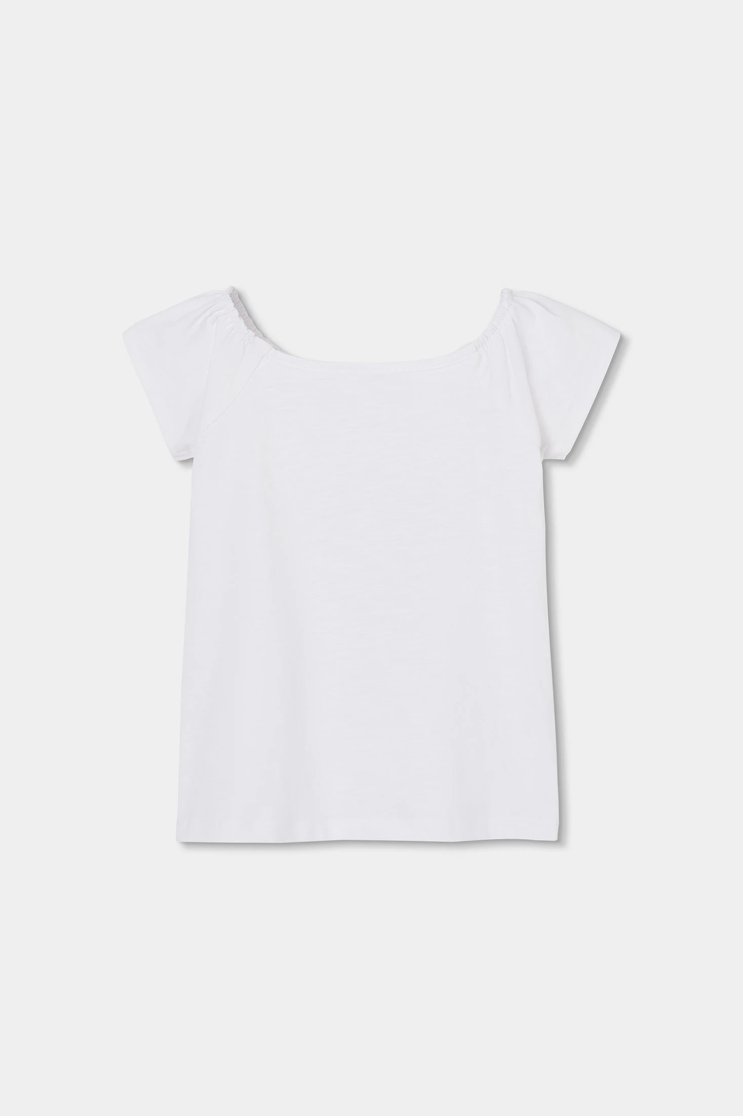 Maglietta per bambina realizzata in cotone bianco, offre comfort e morbidezza per l'uso quotidiano. Presenta un design con la frase "focus on the good" in lettere stampate, accompagnata da disegni di fiori. Ideale per la stagione estiva con il suo collo rotondo e maniche corte. Disponibile nelle taglie da 12 mesi a 14 anni, questo capo versatile può essere facilmente abbinato a pantaloni o gonne dai colori vivaci per dare un tocco allegro all'insieme.