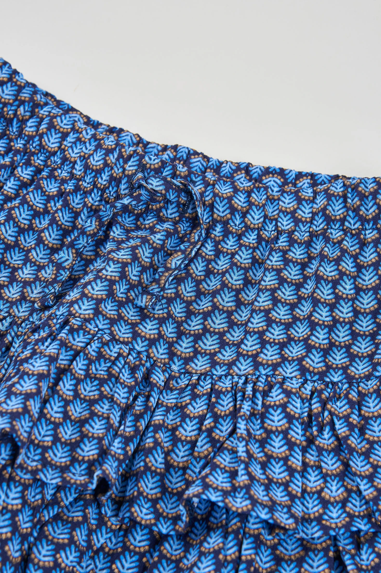 Gonna da bambina dal design allegro e moderno, realizzata in tessuto leggero che garantisce comfort e libertà di movimento. Presenta una stampa all-over nei toni del blu con piccoli dettagli a contrasto che aggiungono un tocco vivace. Il taglio leggermente svasato è arricchito da balze a strati, creando un effetto voluminoso ideale sia per look casual che più eleganti. Perfetta da abbinare a bluse semplici e sandali nelle giornate calde.