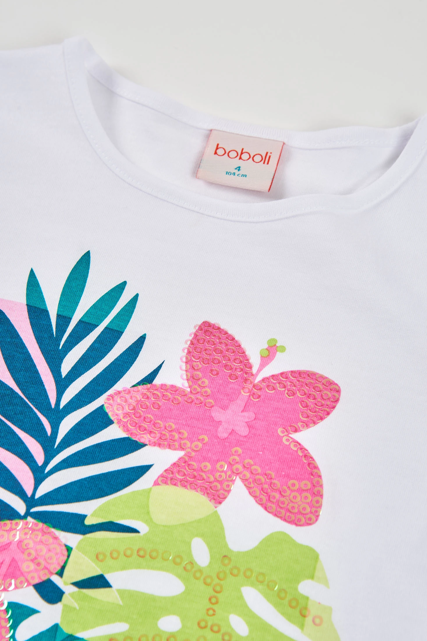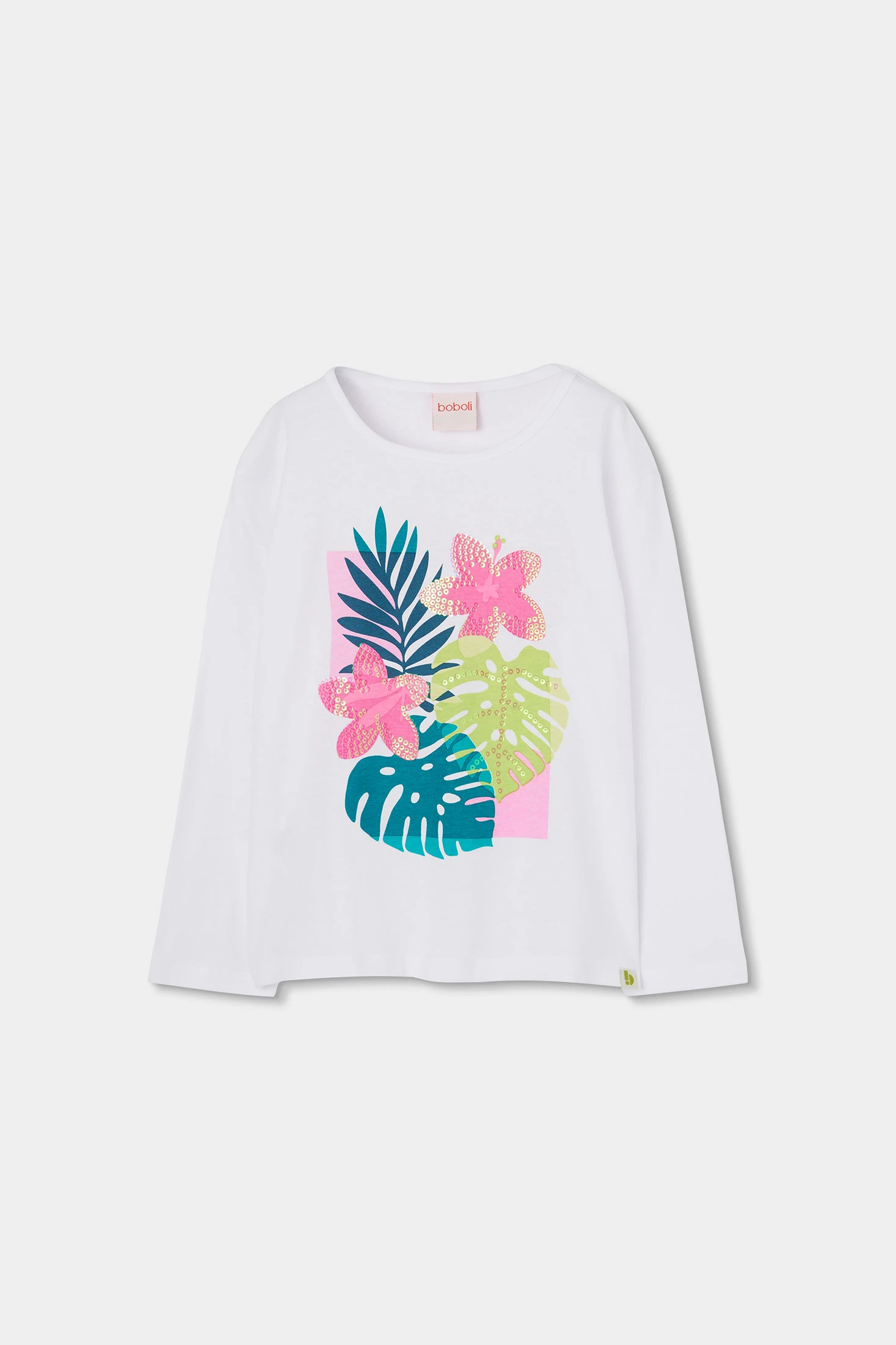 Maglietta a maniche lunghe per bambina realizzata in cotone bianco. Presenta una vivace stampa di foglie e fiori in tonalità rosa e verde, che aggiunge un tocco divertente. È comoda e morbida, perfetta per l'uso quotidiano. Le taglie disponibili vanno dai 2 anni ai 14 anni. È un capo versatile che si può abbinare a diversi indumenti, aggiungendo stile e colore al guardaroba. Ideale per mantenere il calore e il comfort nei giorni più freschi.