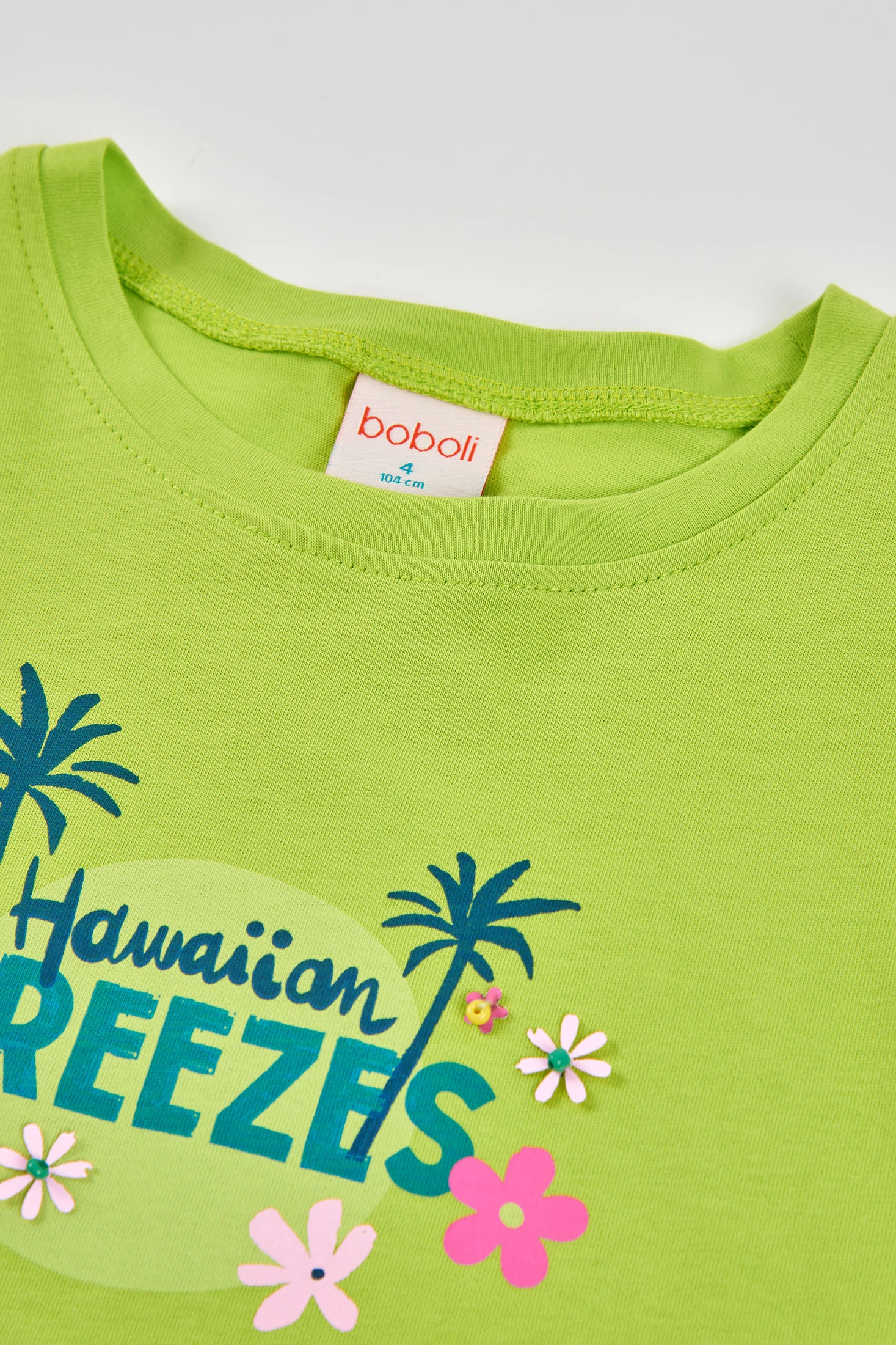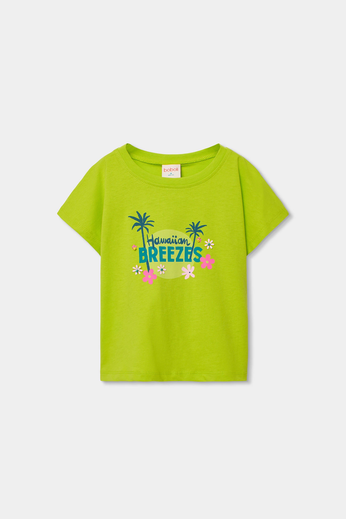 Maglietta in jersey di cotone per bambina, perfetta per la stagione primaverile ed estiva. Di colore verde vivace, presenta un design con palme e fiori che aggiunge un tocco tropicale e divertente. Il tessuto è morbido e traspirante, ideale per mantenere fresca la tua piccola. Disponibile in taglie dai 2 ai 14 anni, offre comodità ad ogni utilizzo. Il suo stile versatile permette di abbinarla facilmente a pantaloncini o gonne, essendo un capo essenziale per il guardaroba infantile.