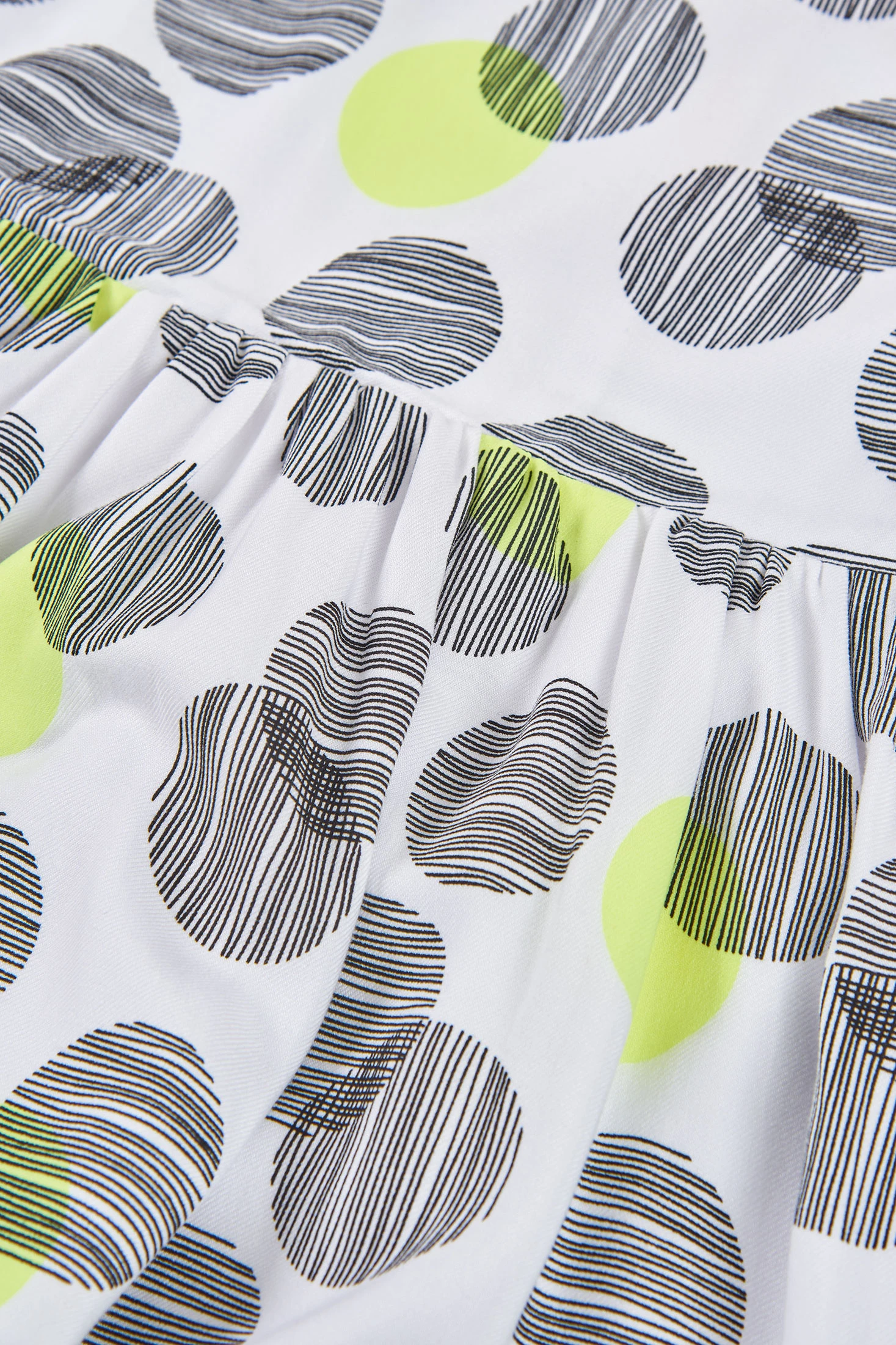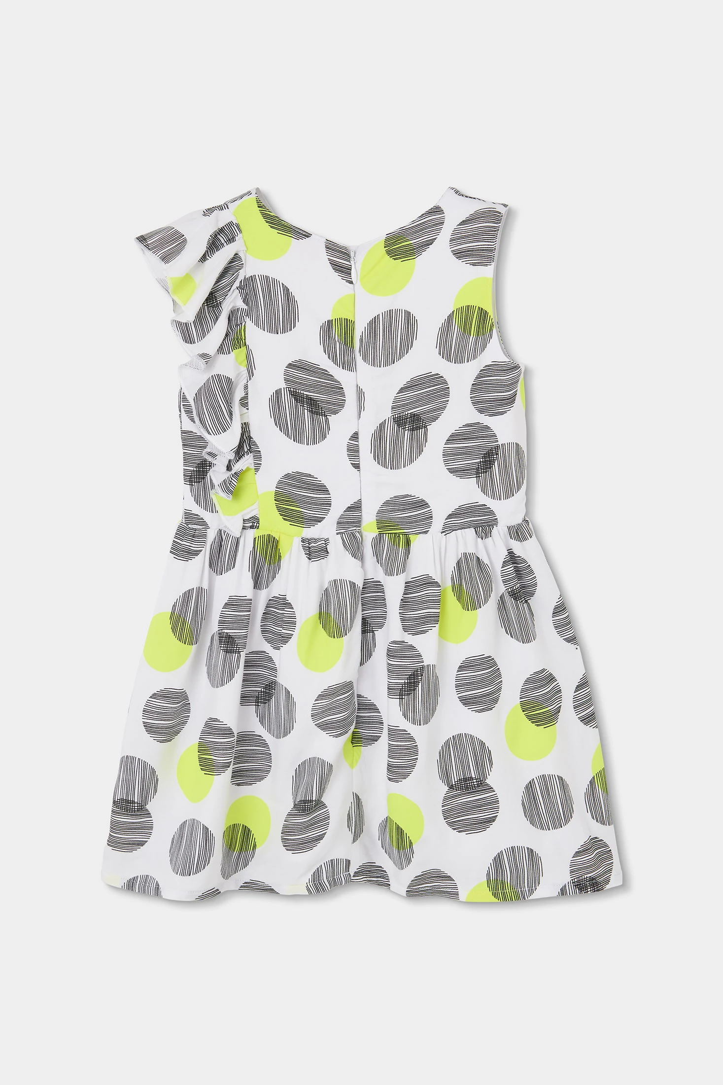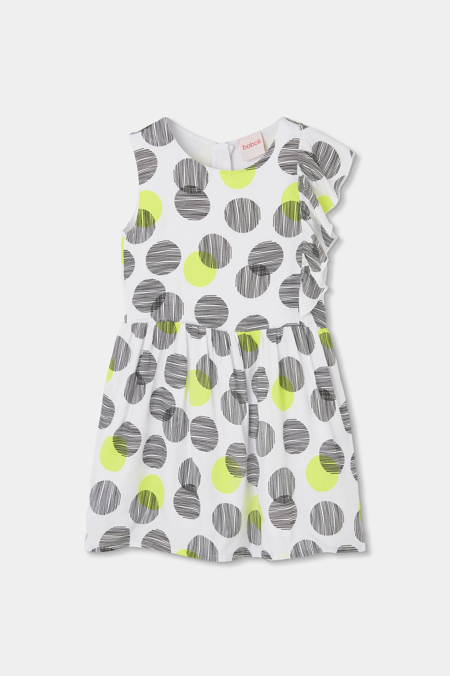 Abito per bambina che presenta una stampa di cerchi in nero e verde neon su sfondo bianco, offrendo un design moderno e divertente. Realizzato in un materiale morbido e confortevole, è ideale per l'uso quotidiano in primavera ed estate. Il suo design senza maniche e con volant laterale aggiunge un tocco distintivo. Disponibile in taglie dai 2 ai 14 anni, si adatta a diverse età. Perfetto per abbinare con accessori colorati o neutri, una scelta versatile per qualsiasi occasione speciale o per il giorno a giorno.