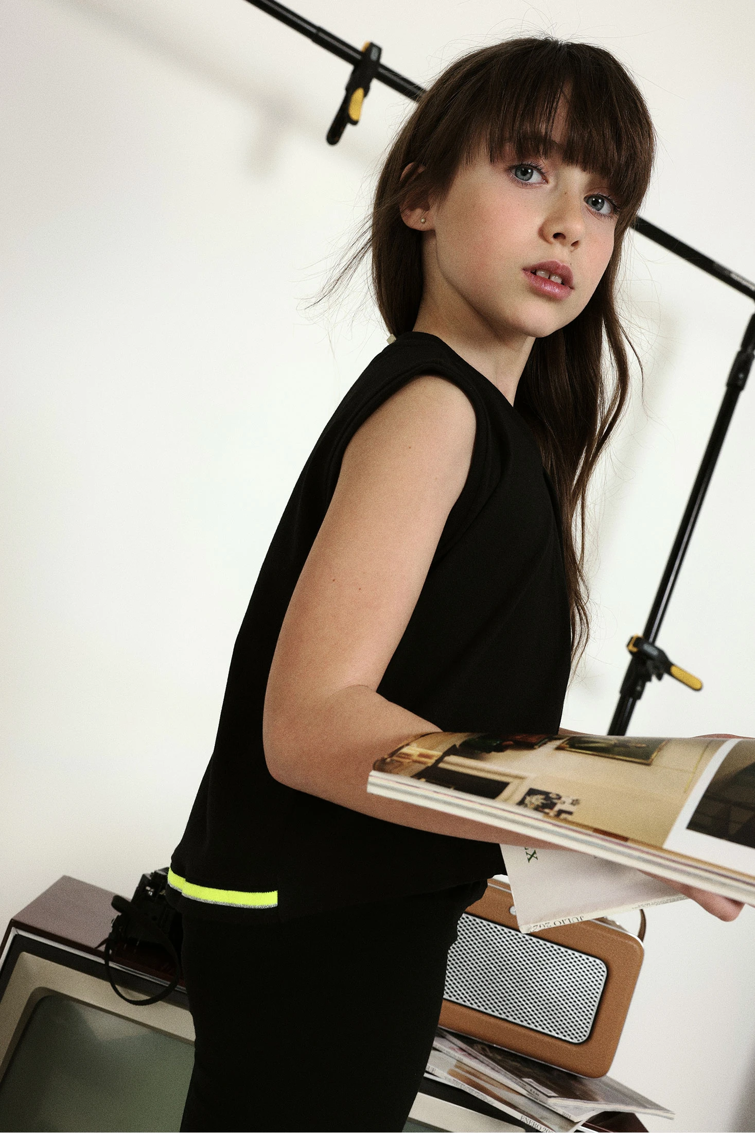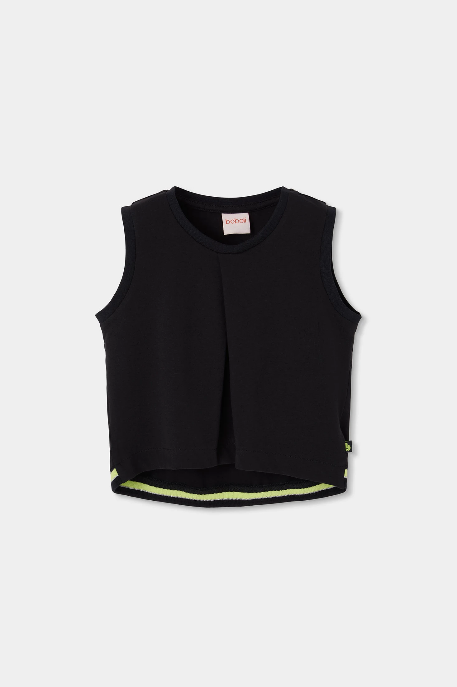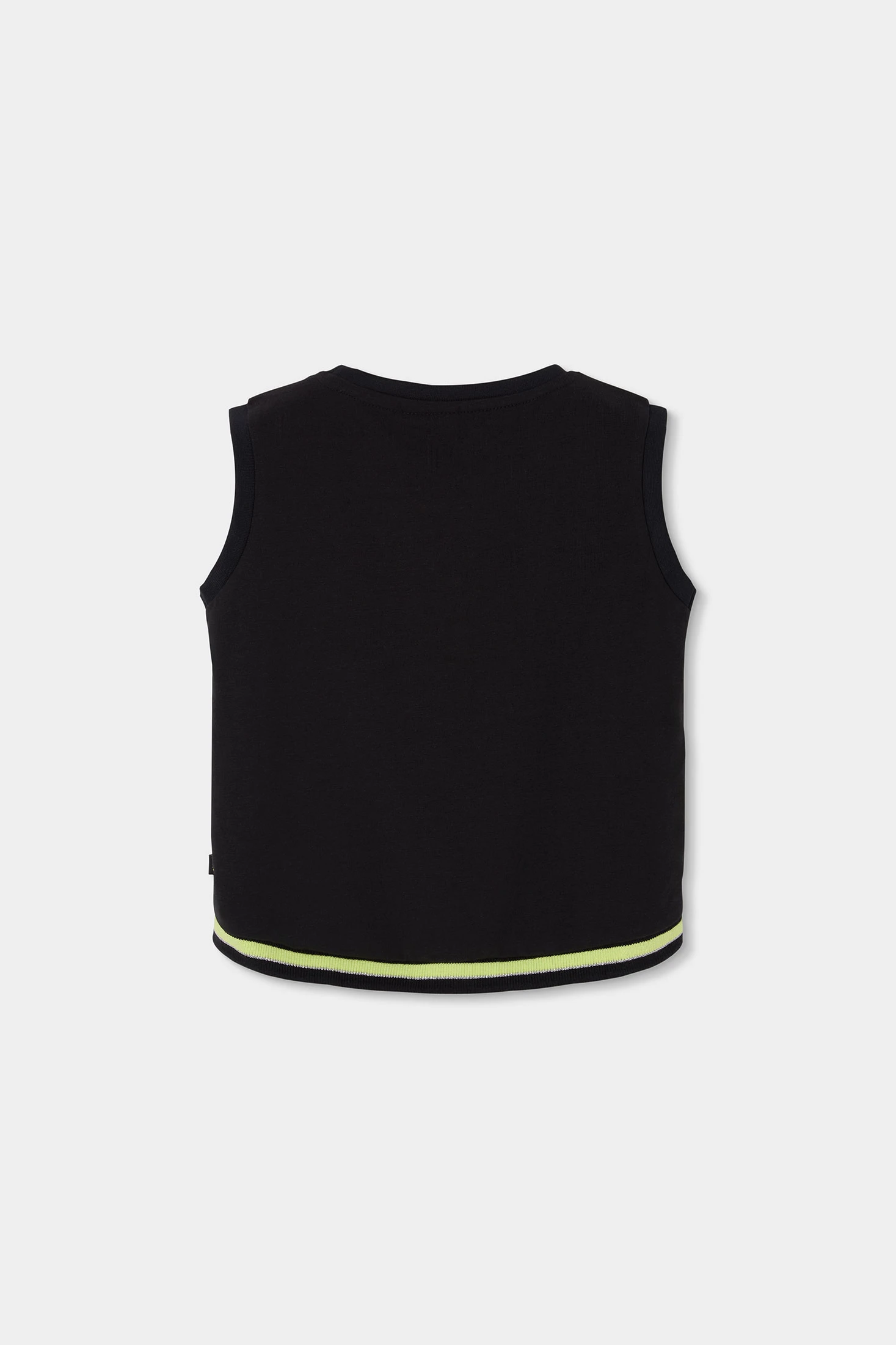 Maglietta nera per bambina, realizzata in cotone che offre comfort e versatilità nei look. Il design è semplice, senza stampe e con un bordo nero con una riga verde neon in vita. Ideale per abbinare a diversi stili. Disponibile in taglie dai 2 ai 14 anni, si adatta alle diverse fasi di crescita. Il suo taglio senza maniche e con scollo rotondo la rende perfetta per essere indossata nei giorni più freschi insieme a una giacca o in climi caldi. Un capo base indispensabile nel guardaroba di qualsiasi bambina, adatto per ogni stagione.