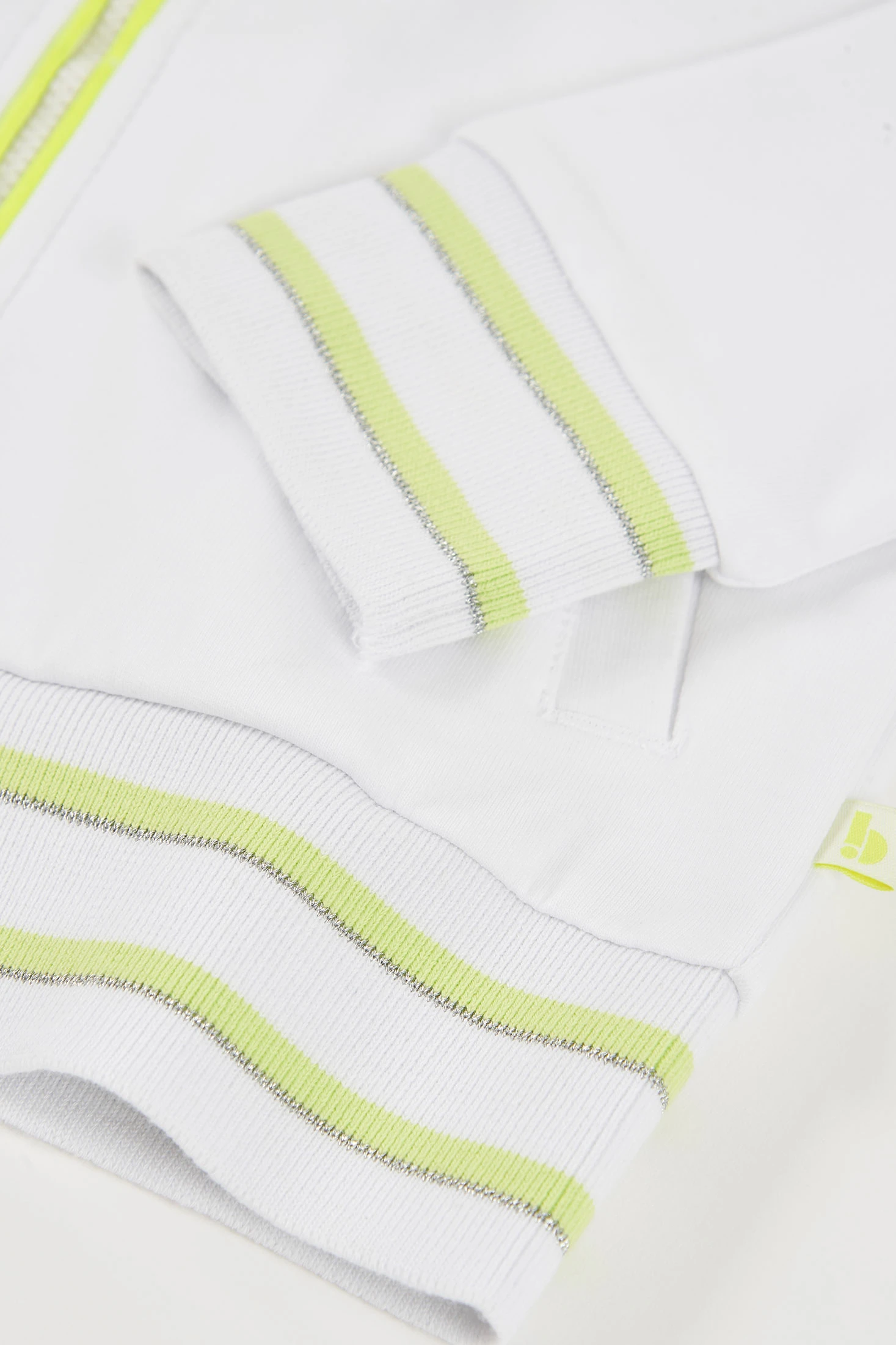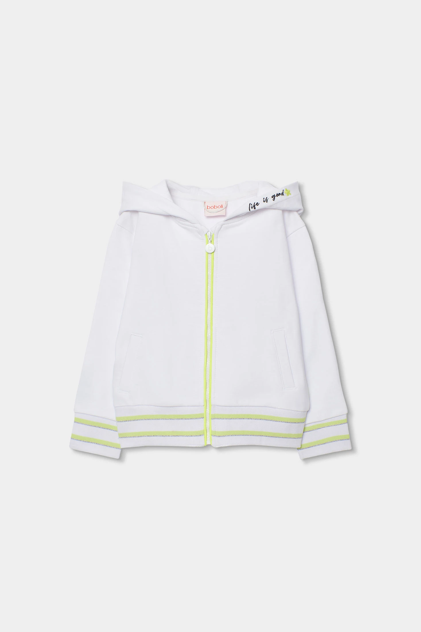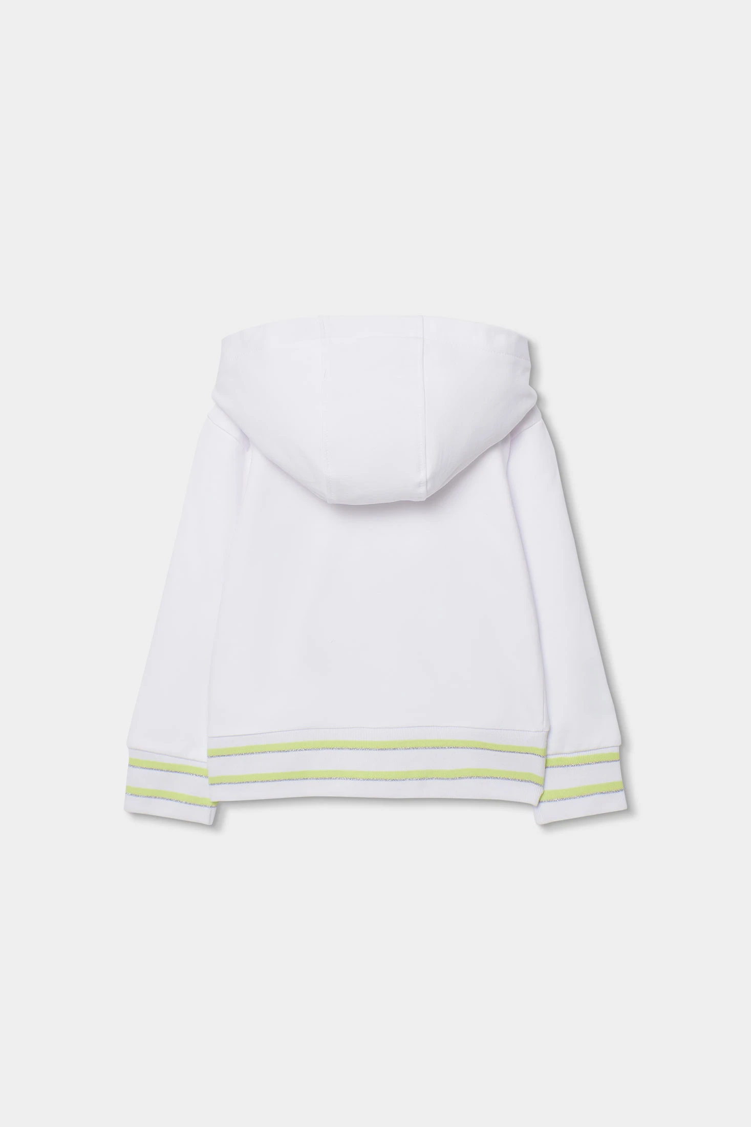 Giacca in felpa bianca per bambina, ideale per l'uso quotidiano. Realizzata in un materiale morbido, offre comfort e calore. Il suo design comprende un cappuccio e una chiusura con cerniera che ne facilita l'uso. Presenta dettagli a righe verde neon e argento sui polsini e in vita, aggiungendo un tocco moderno. Disponibile in taglie dai 2 ai 14 anni, adattandosi alla crescita della bambina. Perfetta da abbinare a jeans o leggins, è un capo molto versatile e funzionale.