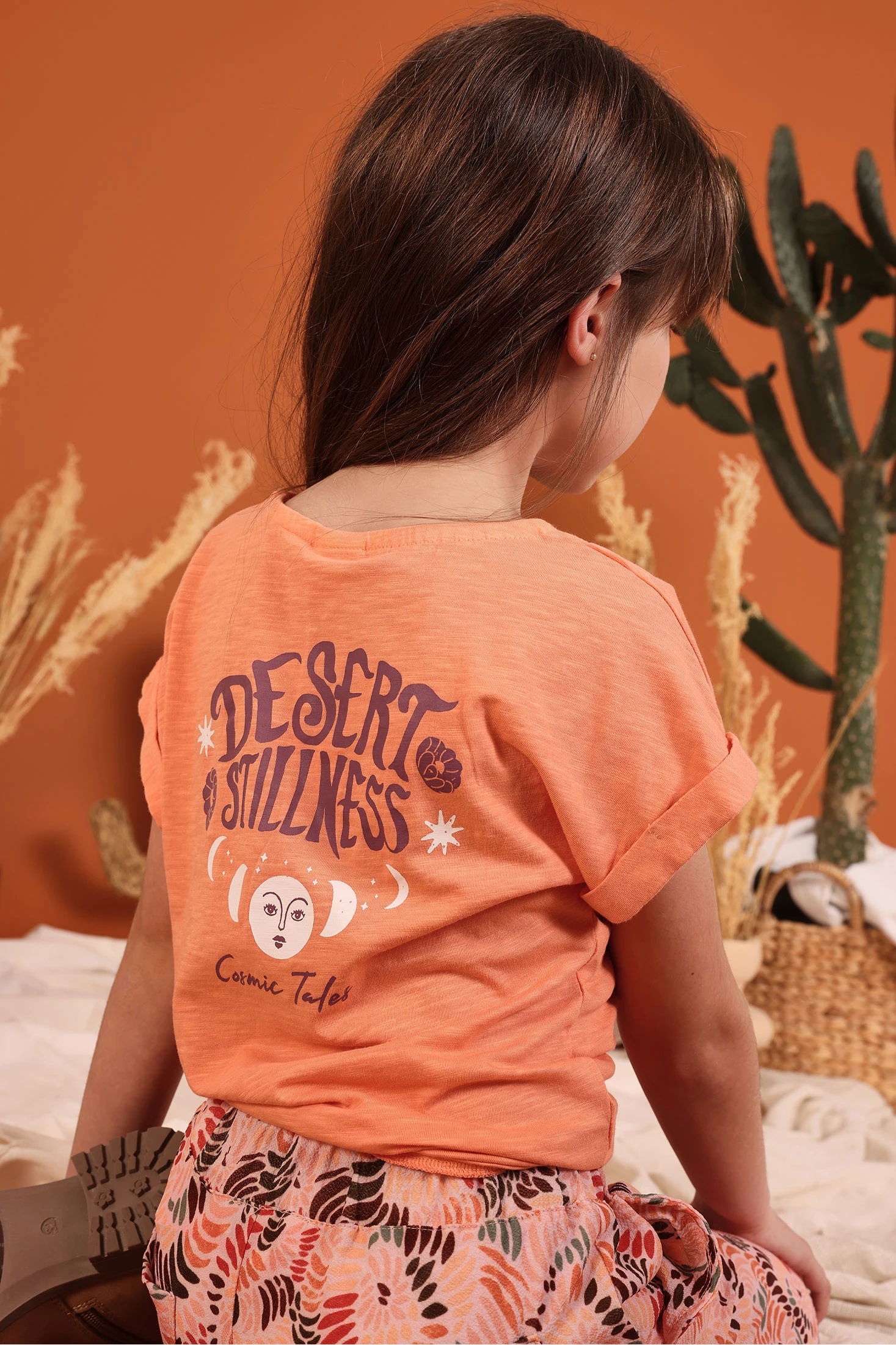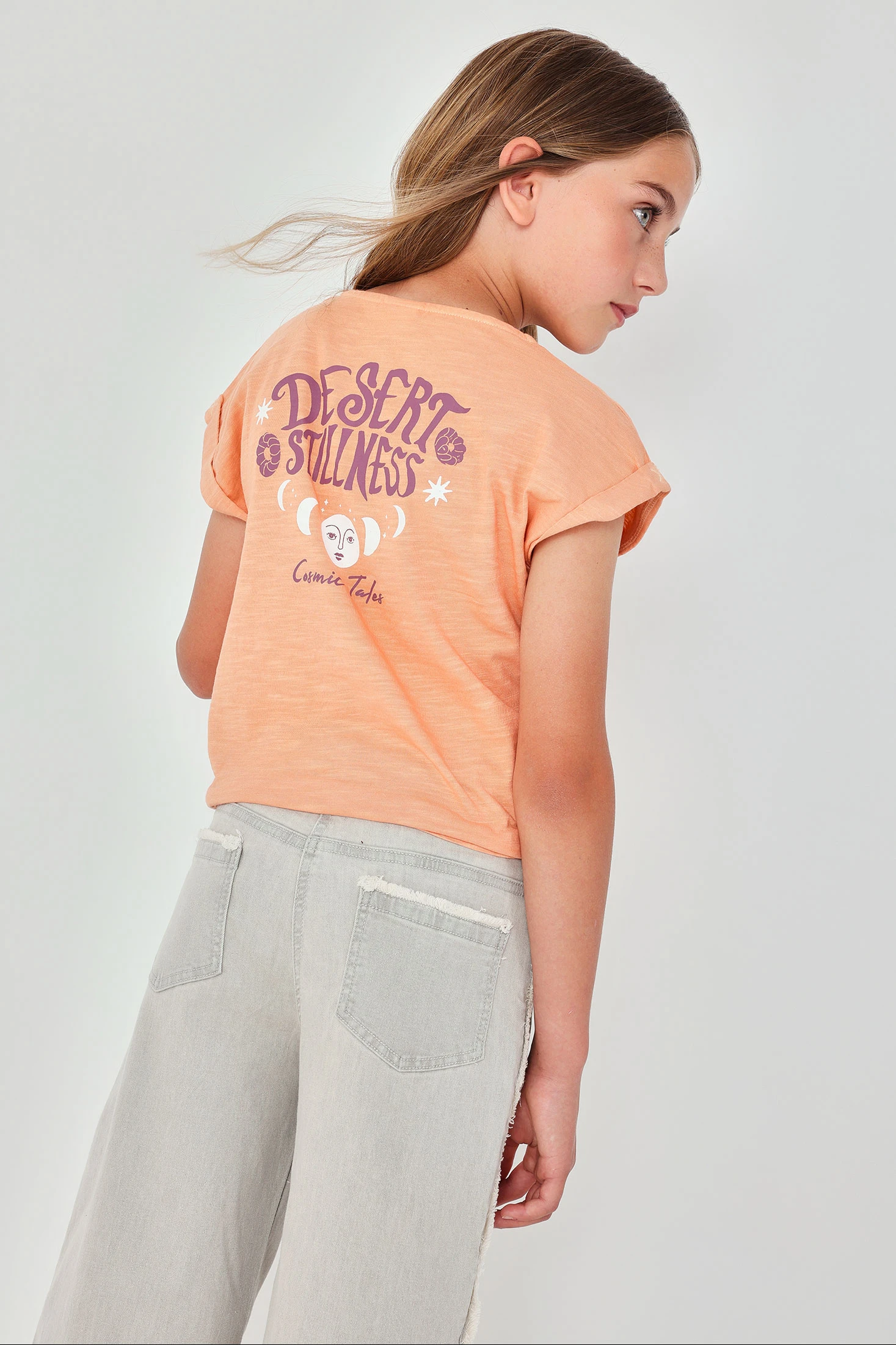 Maglietta da bambina in jersey fiammato di cotone color salmone, perfetta per la stagione primaverile ed estiva. Il suo tessuto leggero e traspirante offre comfort per tutto il giorno. Con un design annodato sull'orlo, aggiunge un tocco moderno e divertente. Include un dettaglio di testo sul davanti che le conferisce stile. Disponibile nelle taglie da 2 anni a 14 anni, è ideale da abbinare a jeans o gonne per look casual. Un capo versatile e fresco per il guardaroba dei bambini.