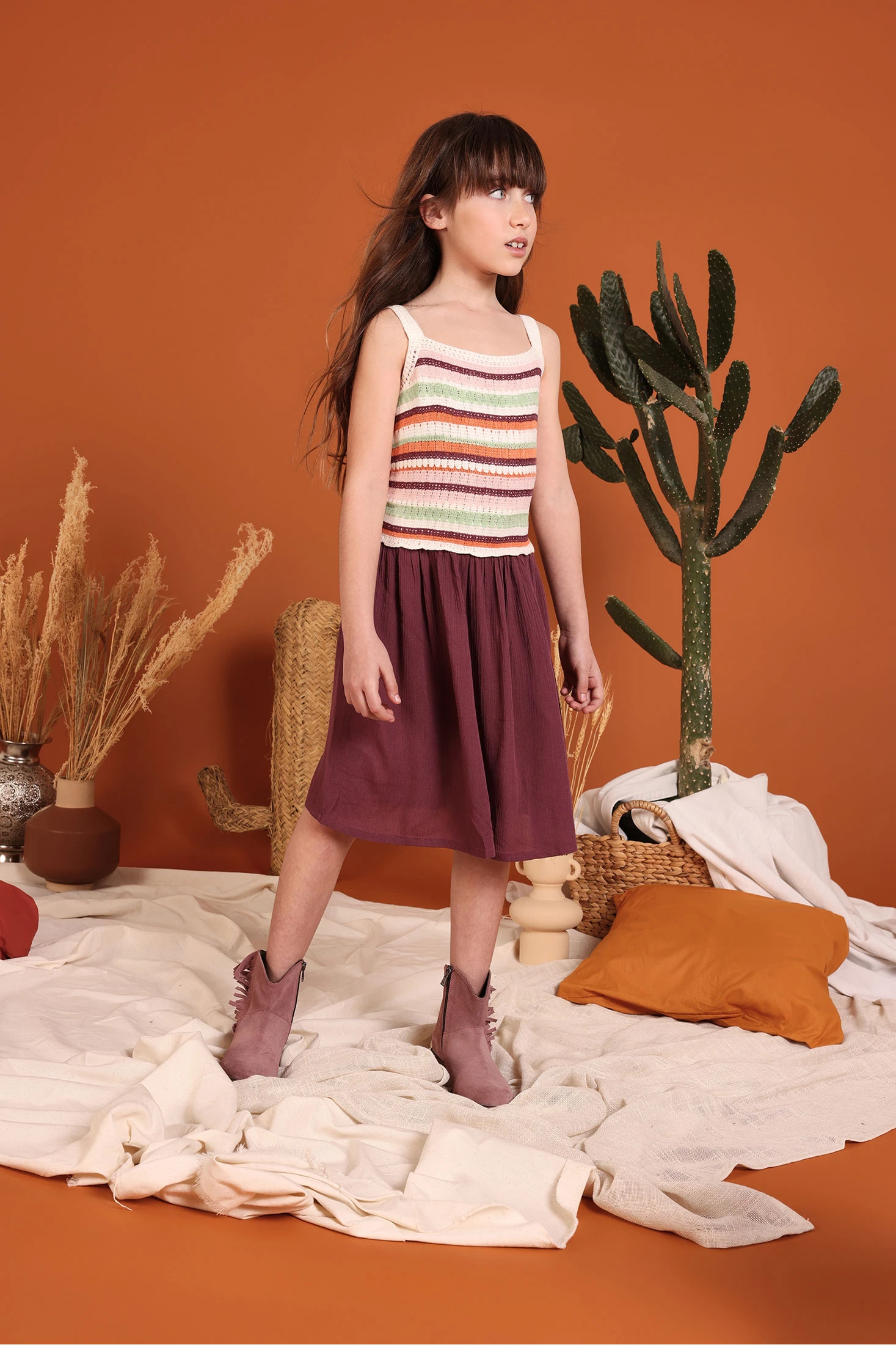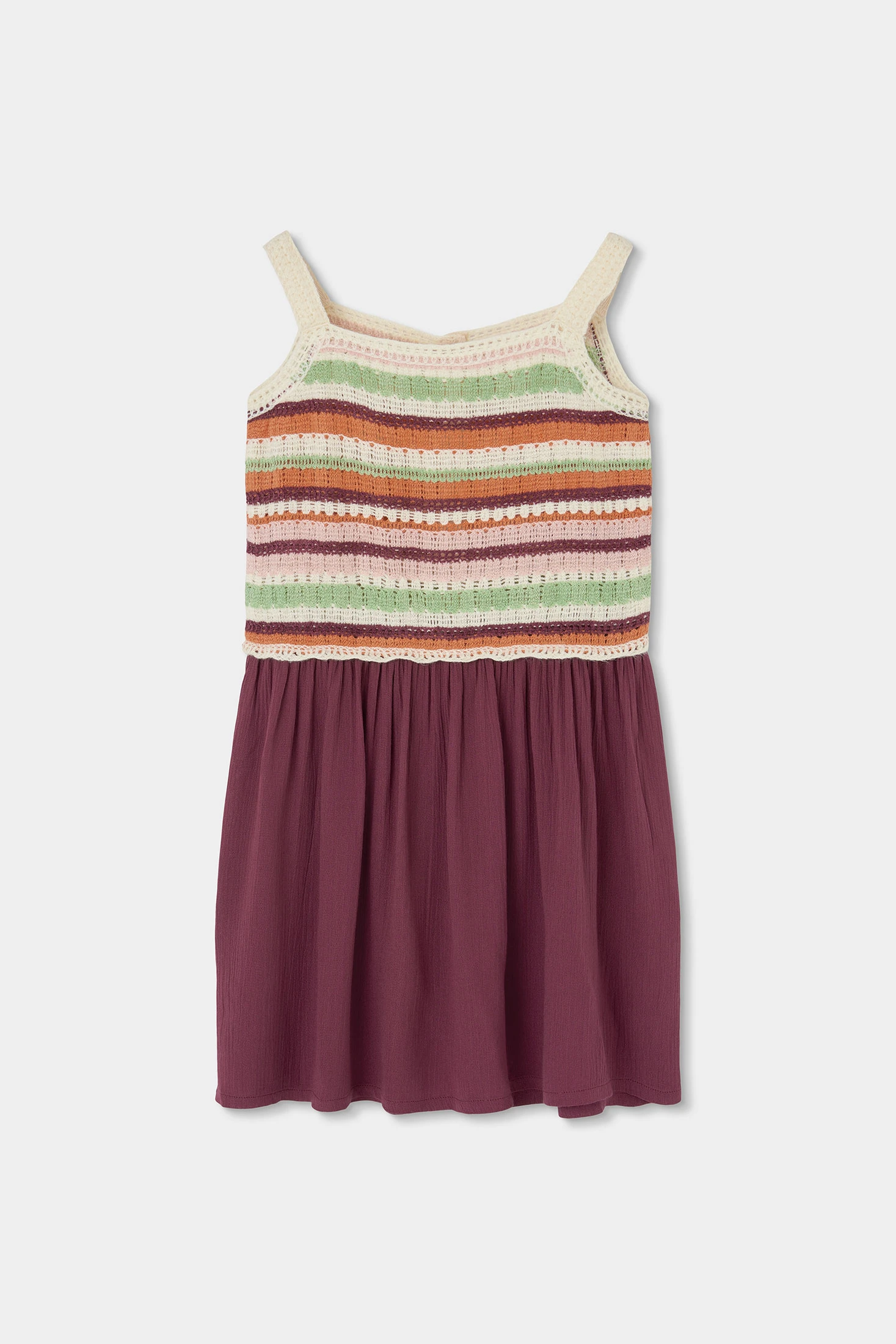 Vestito di maglia ideale per bambine, disponibile in taglie dai 2 ai 14 anni. Il design combina una parte superiore con righe multicolori in tessuto a maglia tipo crochet e una gonna in maglia liscia di colore prugna. Il top ha spalline sottili, perfetto per i giorni caldi, offre comfort e stile. Il materiale leggero e traspirante lo rende ideale per abbinare con giacche leggere o accessori colorati, perfetto per occasioni casual o più formali. Un vestito versatile che aggiunge un tocco colorato al guardaroba di qualsiasi bambina.