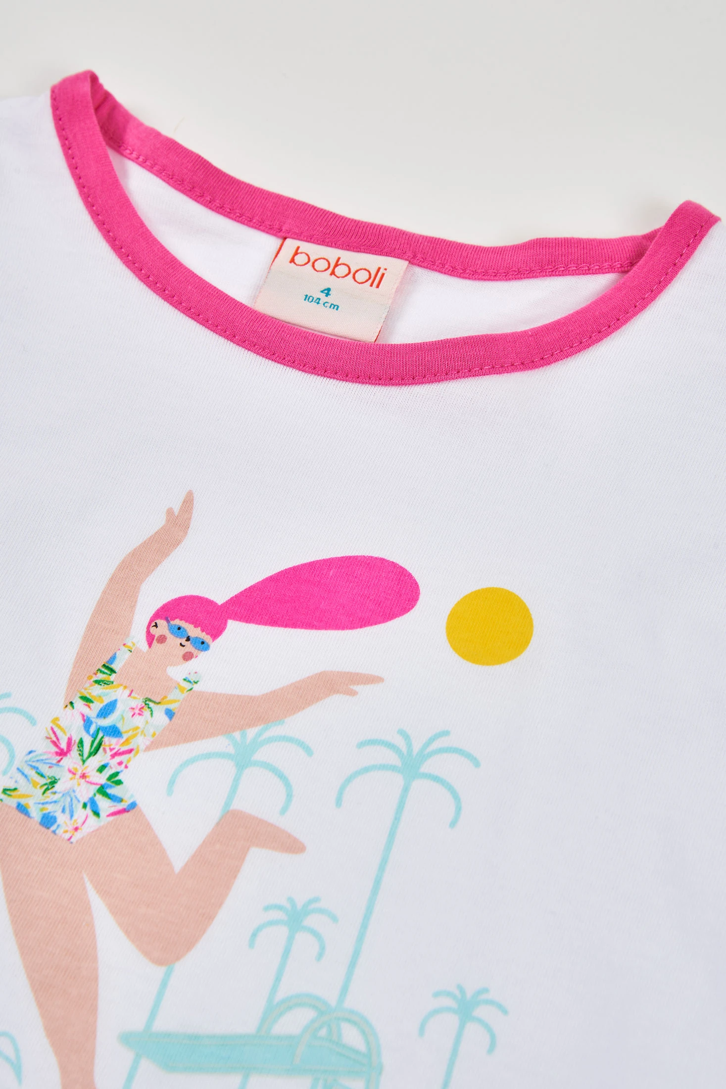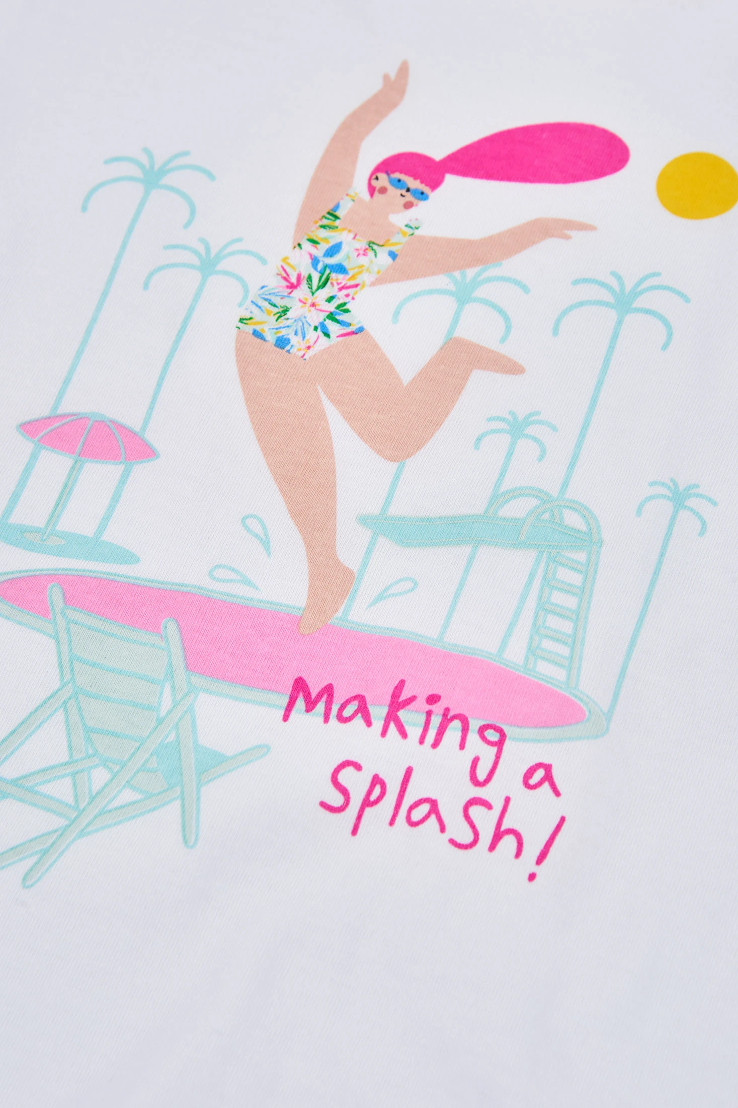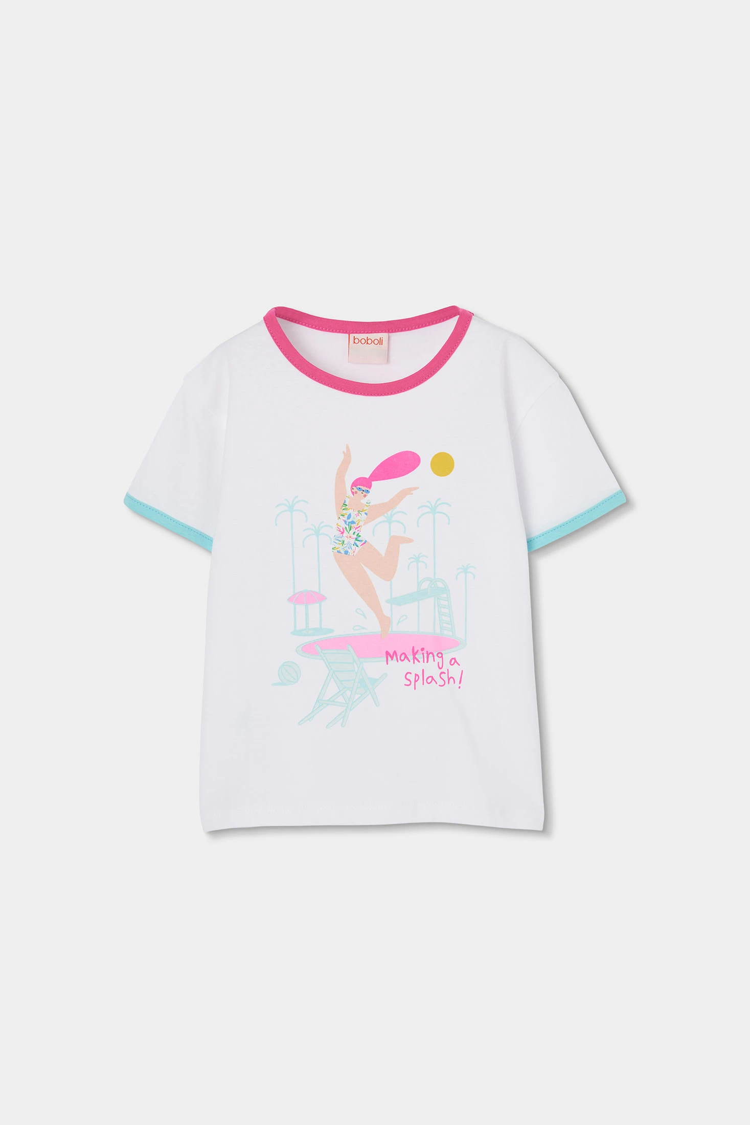 Maglietta in maglia elastica per bambina, perfetta per l'uso quotidiano. Realizzata in cotone bianco, il suo tessuto offre comfort e libertà di movimento. Presenta un design grafico accattivante sul davanti con una scena estiva di una ragazza che fa il bagno in piscina. I colori sono blu e rosa fluo. La maglietta ha il collo rotondo e maniche corte, ed è facile da abbinare con qualsiasi pantalone o gonna. Disponibile in taglie da 2 a 14 anni.