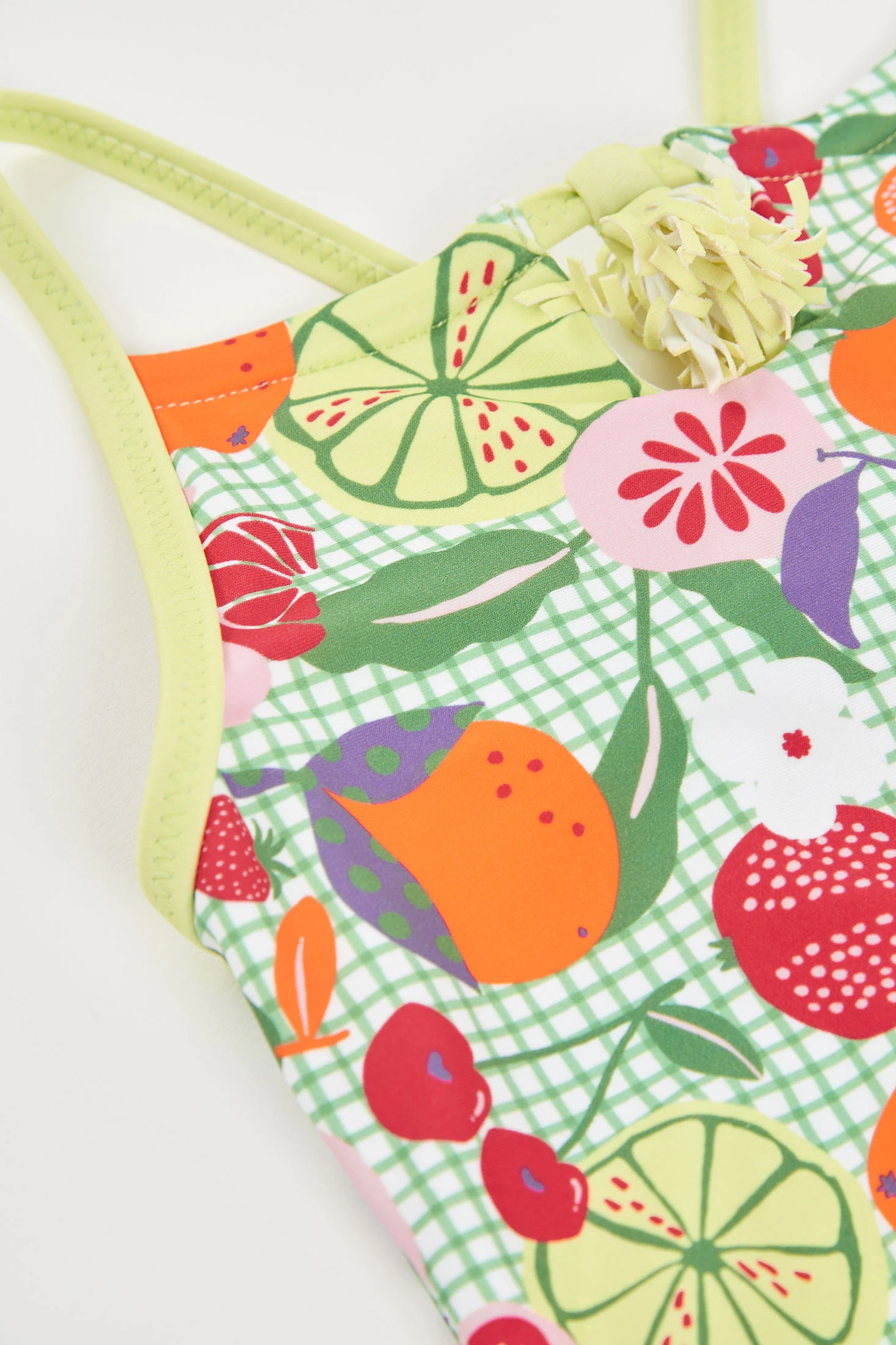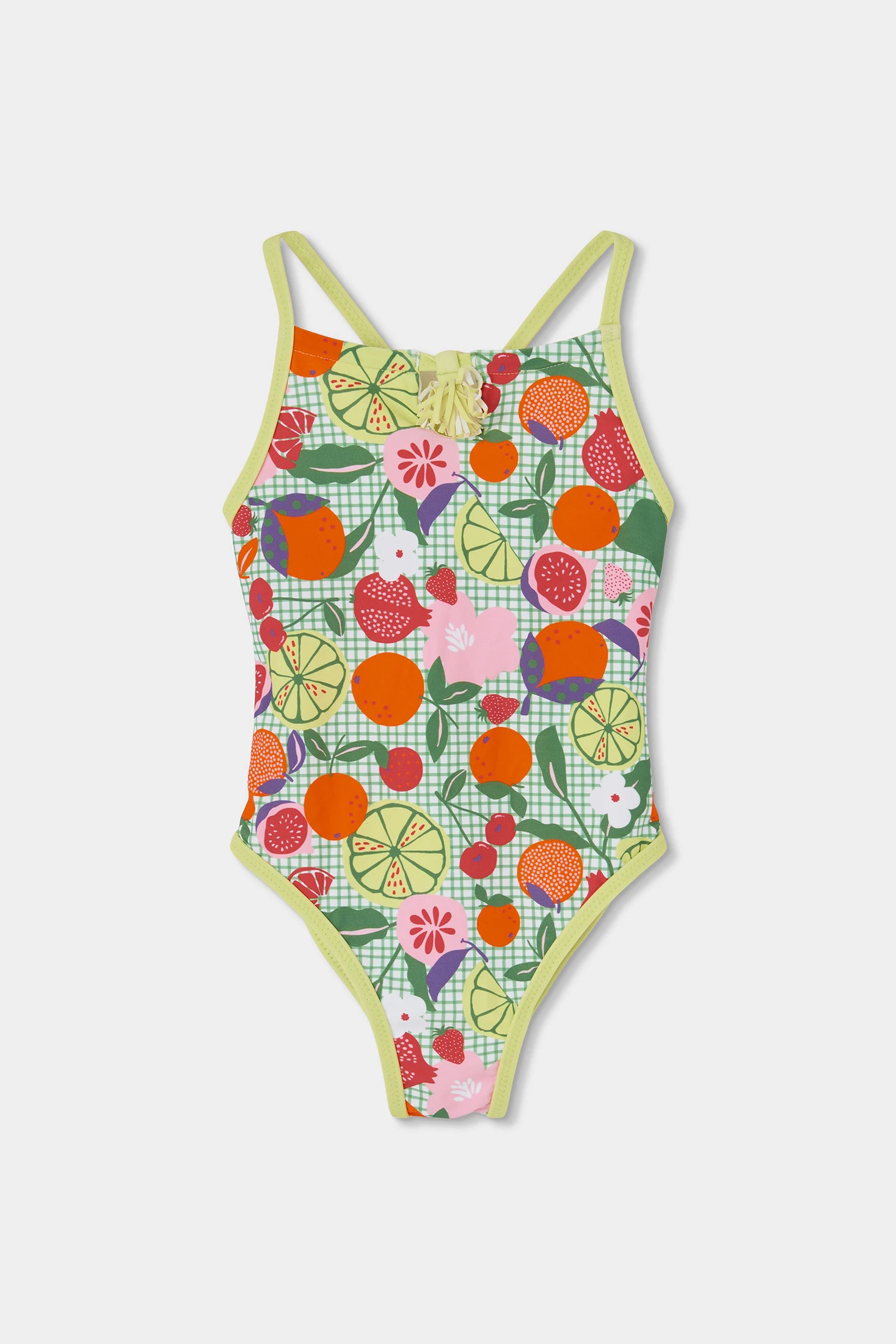 Costume da bagno per bambina che presenta una vivace stampa di frutta in toni vibranti come arancione, rosso e giallo su uno sfondo verde. Realizzato in un tessuto confortevole, con protezione solare UPF50 e resistente all'acqua, è ideale per i giorni in piscina o in spiaggia. Progettato per età da 2 a 14 anni, garantisce una vestibilità perfetta in ogni fase di crescita. Le spalline sottili e il design senza maniche offrono libertà di movimento, mentre il materiale traspirante assicura comfort.