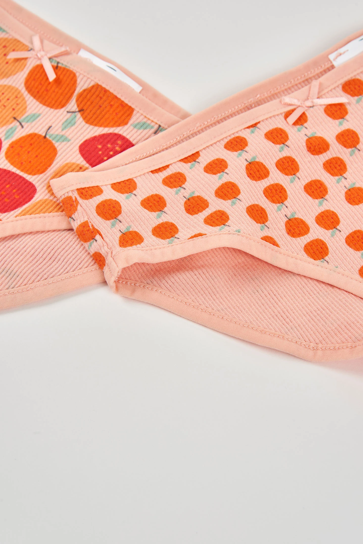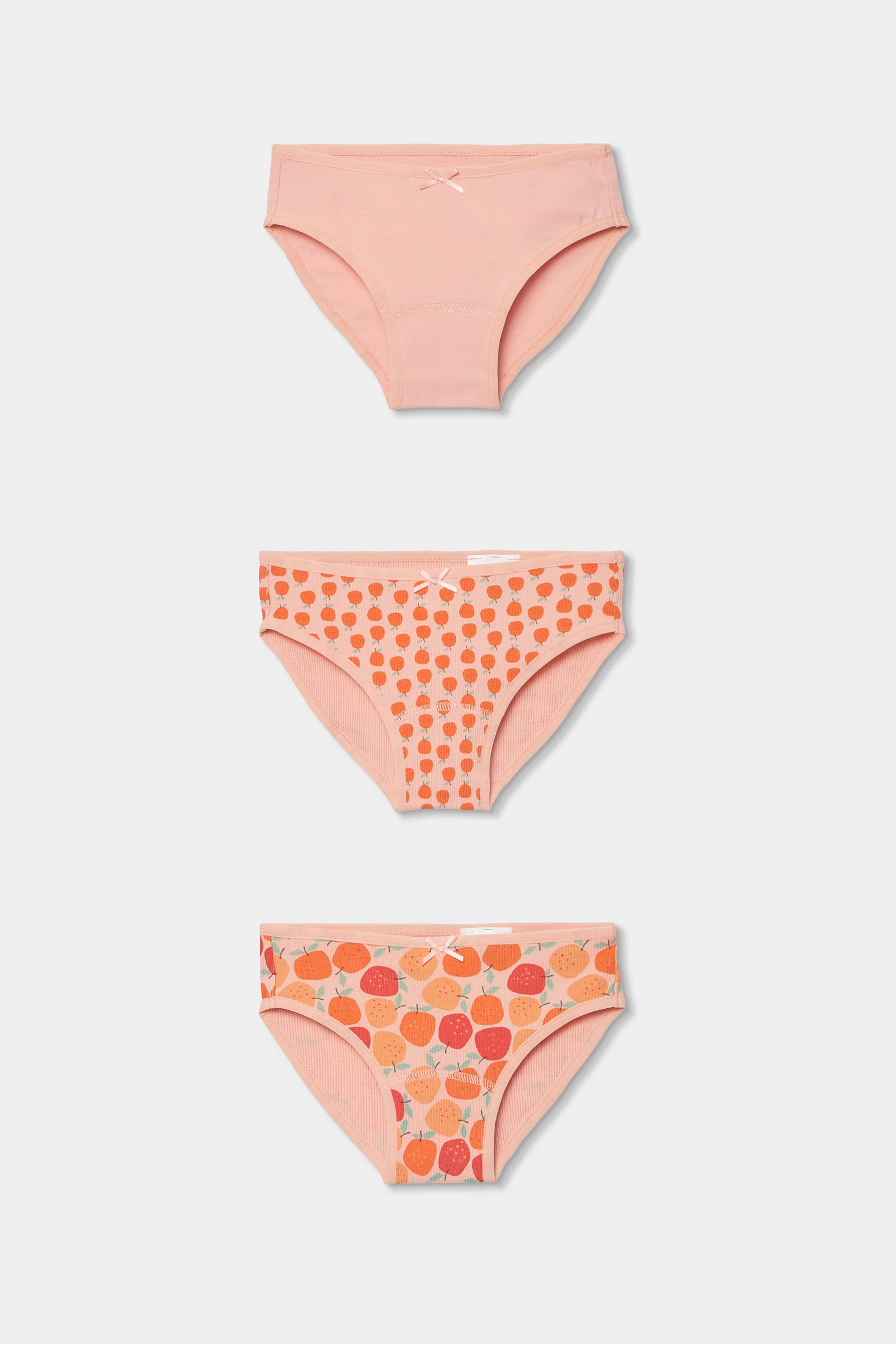 Pacco di 3 mutandine di cotone per bambina che combina comfort e stile per il giorno a giorno. Disponibile in taglie da 2 a 14 anni. Presenta un design attraente: una semplice con piccolo fiocco decorativo e due con stampe fruttate in tonalità arancione e rosso. Il cotone morbido assicura comodità per le pelli delicate. Ideale da abbinare a completi casuali quotidiani, mantenendo sempre una sensazione di freschezza e morbidezza. Il colore e il design le rendono una scelta divertente e pratica per l'intimo delle piccole.