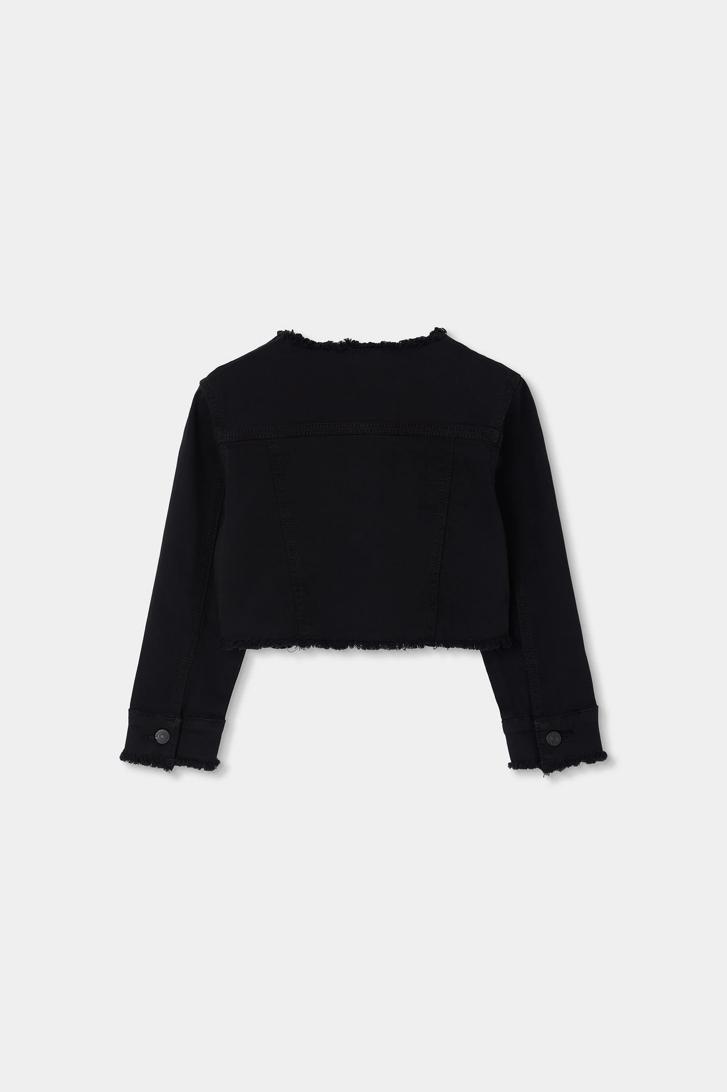 Giacca in denim nero per bambina, ideale per la mezza stagione. Realizzata in un materiale resistente e comodo, offre stile e protezione. Il suo design include bottoni anteriori e maniche lunghe, con dettagli sfrangiati sui bordi che aggiungono un tocco moderno. È disponibile in taglie da 12 mesi a 14 anni, adattandosi alla crescita della bambina. È un capo versatile che si combina perfettamente con magliette e pantaloni casual per un look urbano e attuale.