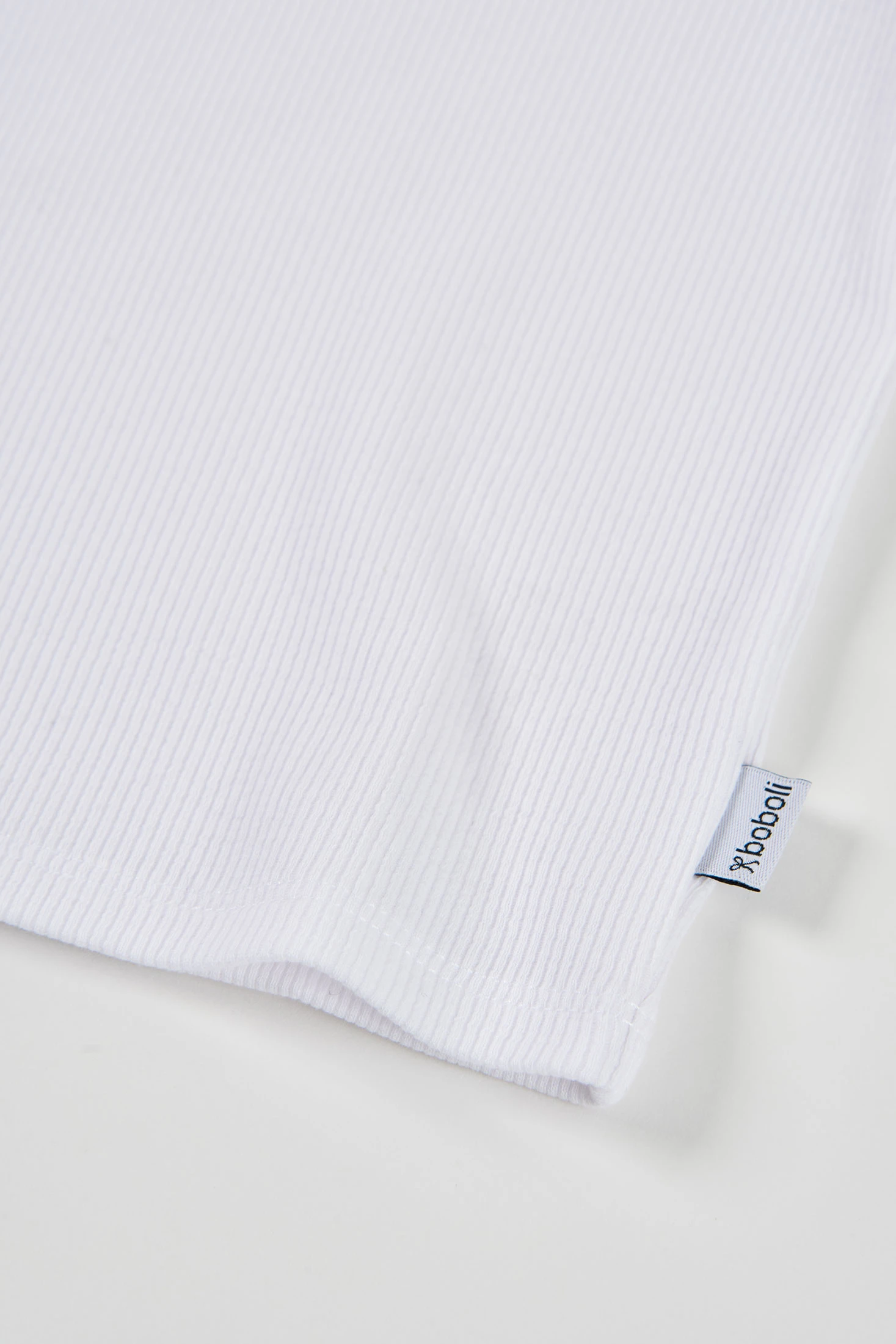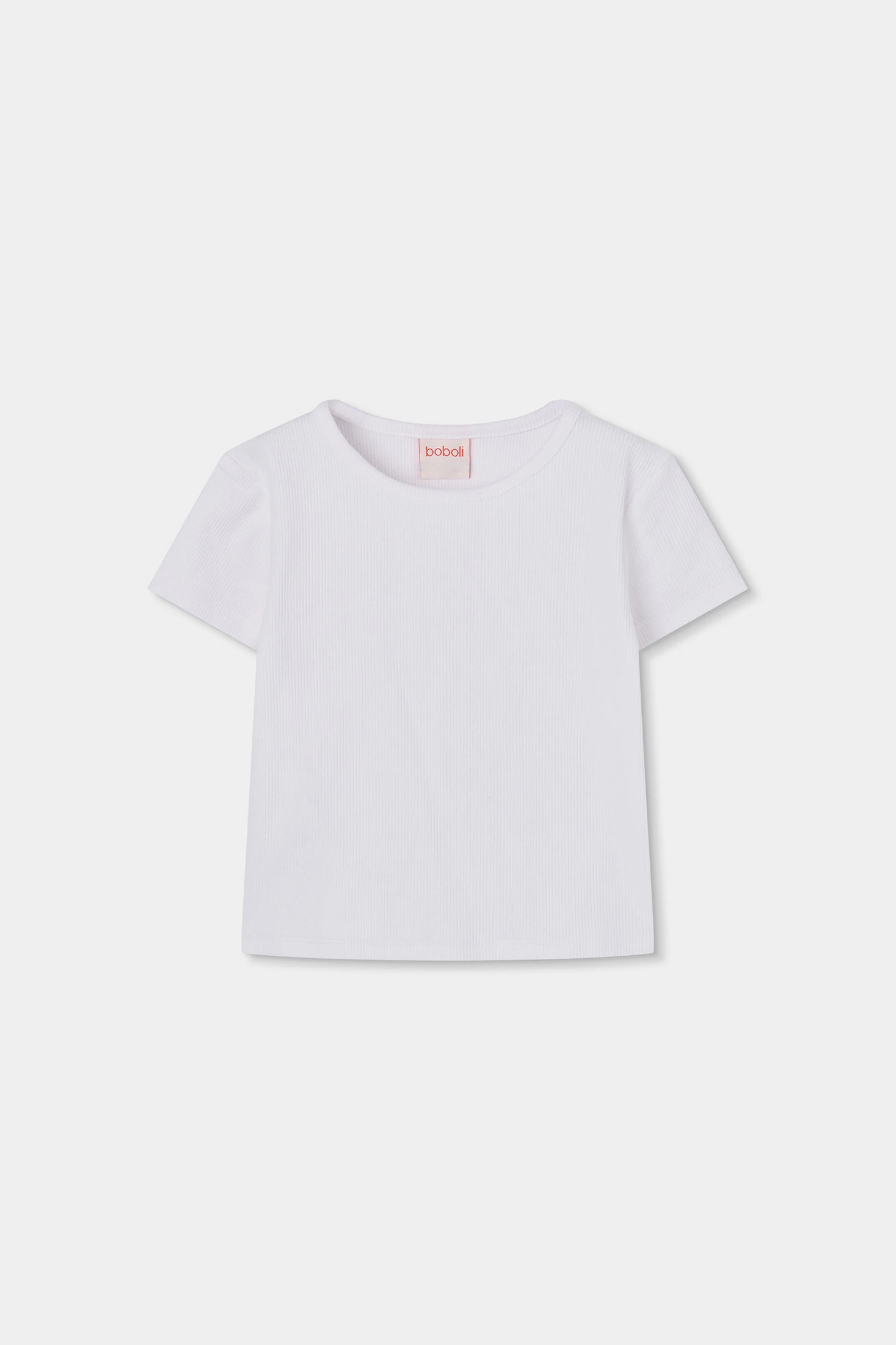 Maglietta a costine per bambina di colore bianco, ideale per ogni stagione. Realizzata con materiale morbido e traspirante, garantisce comfort per tutto il giorno. Il suo design semplice e classico la rende versatile per abbinarsi a diversi outfit. La maglietta ha un collo rotondo e maniche corte, perfetta per uno stile casual. È disponibile in taglie per età da 12 mesi a 14 anni. Un capo di base e pratico che si adatta facilmente al guardaroba della tua piccola, offrendole un look fresco e semplice.