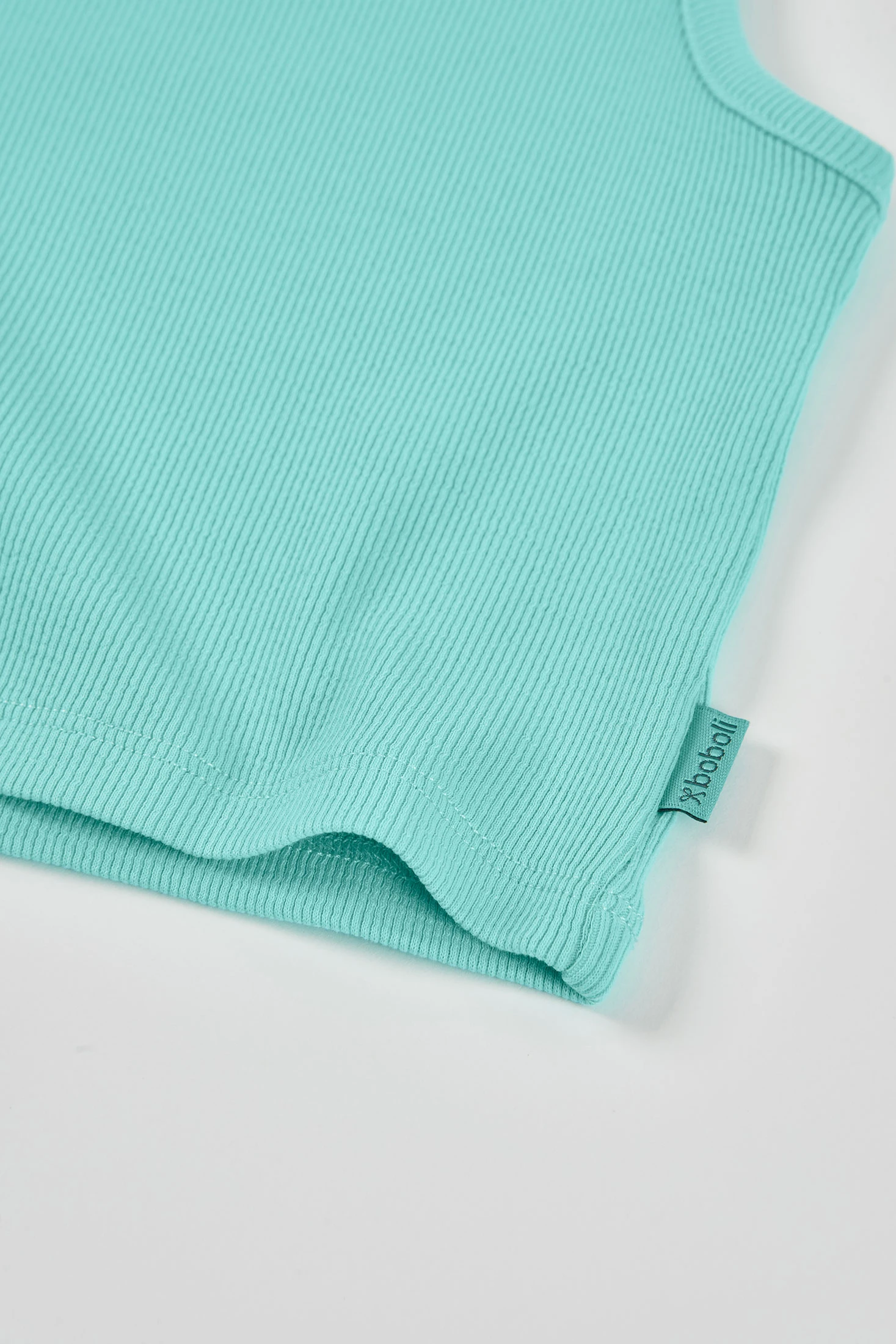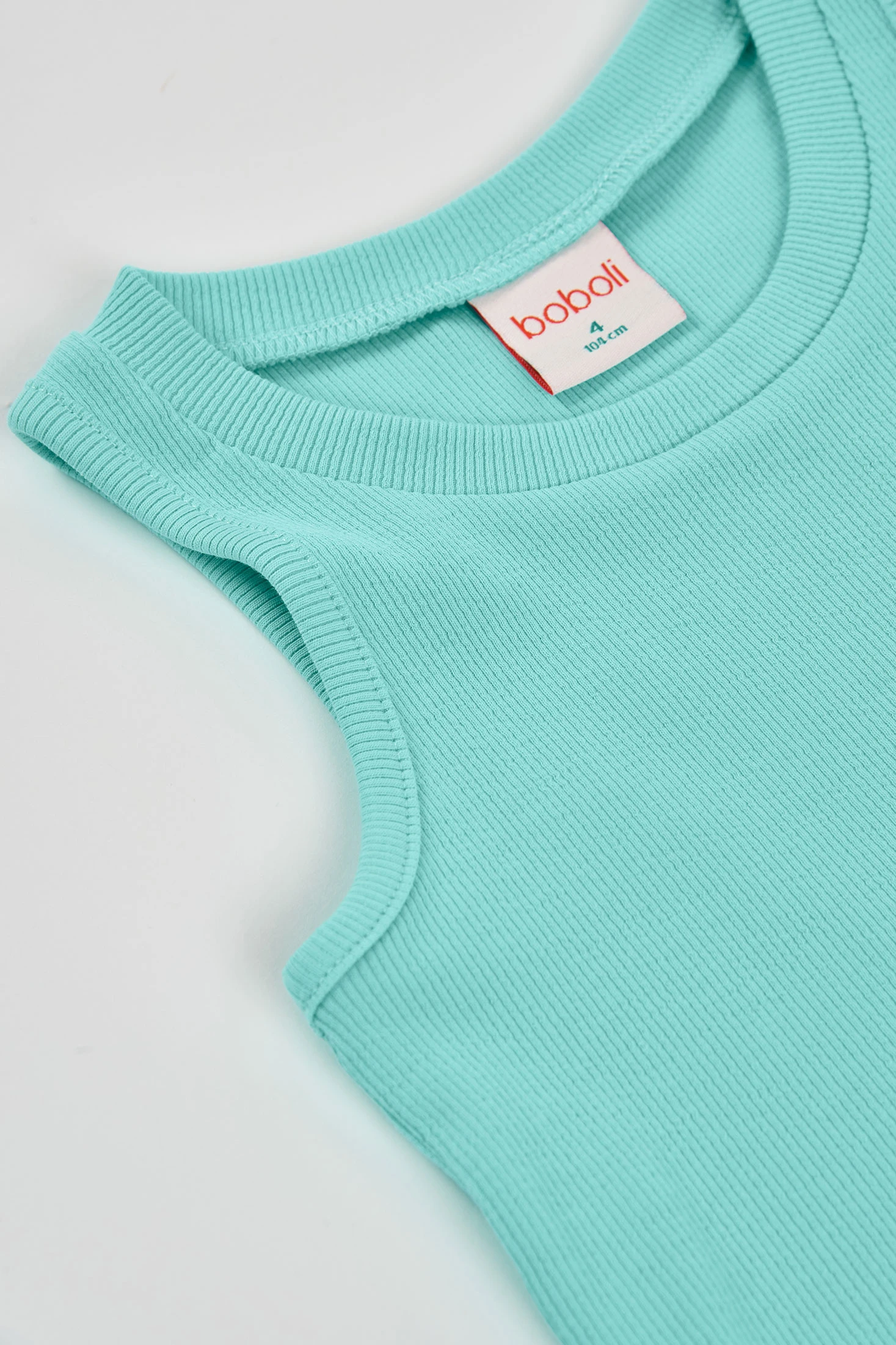 Maglietta a coste per bambina, perfetta per l'estate. Realizzata in un tessuto che offre morbidezza e comfort, presenta un design senza maniche che permette libertà di movimento. Il colore verde menta aggiunge freschezza al guardaroba. Disponibile in taglie per 12M, 18M, 2, 3, 4, 5, 6, 7, 8, 10, 12 e 14 anni, è un'opzione versatile da abbinare a shorts o gonne. Ideale per qualsiasi occasione informale, questa maglietta è un capo essenziale per le giornate calde.