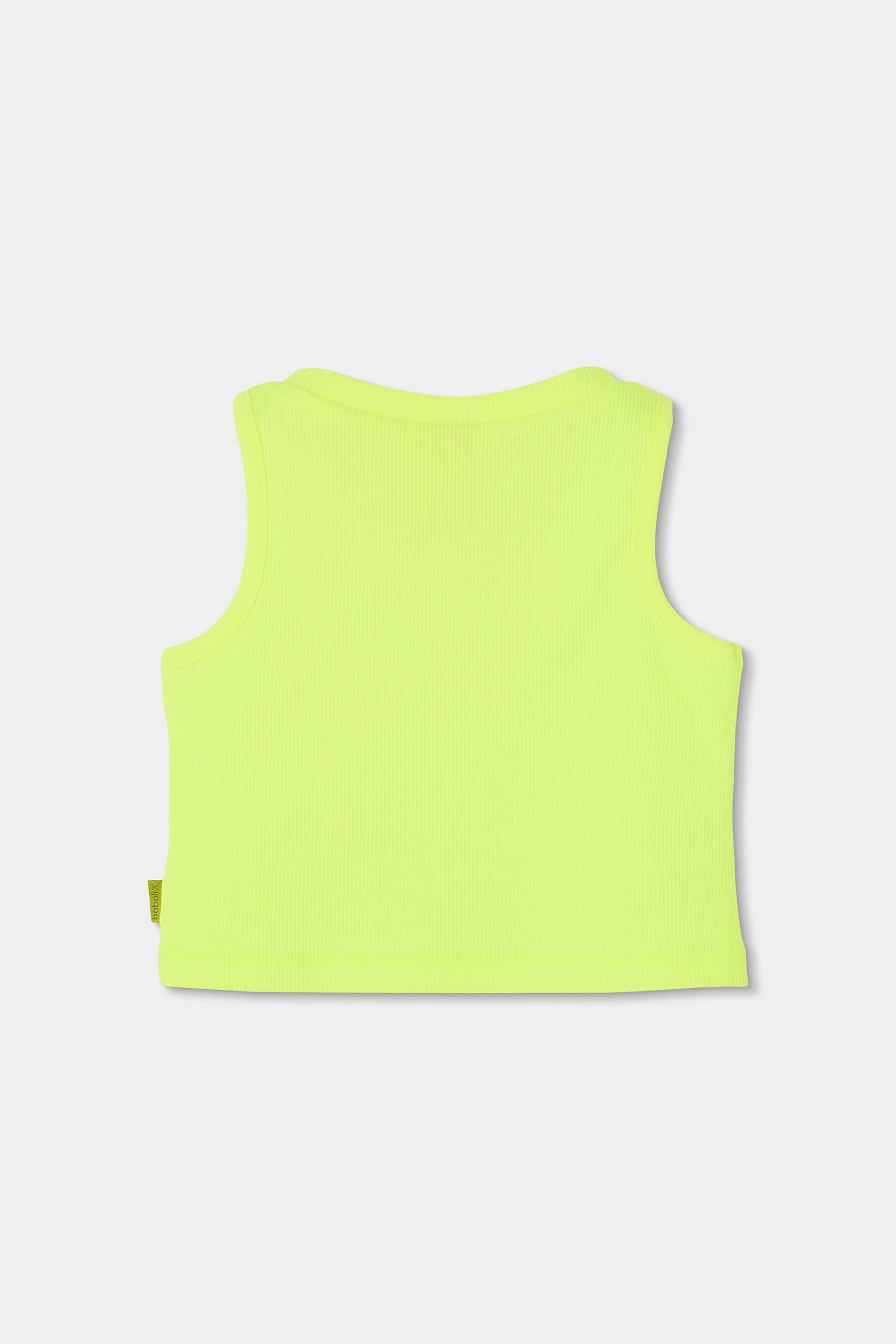 Canotta in maglia a coste di cotone per bambina, ideale per l'estate. Il suo colore verde neon offre uno stile vibrante e moderno. Il materiale in maglia elasticizzata garantisce comfort e freschezza, perfetta per i giorni caldi. Disponibile in taglie da 12 mesi a 14 anni, si adatta a diverse fasi di crescita. Essendo di taglio semplice, è versatile e facilmente abbinabile con pantaloncini o gonne per un look casual e confortevole.
