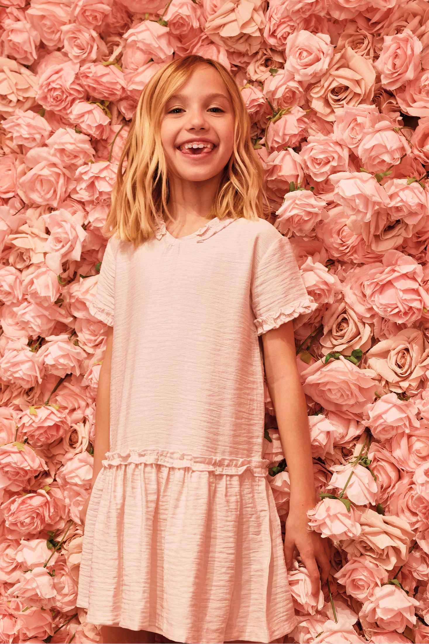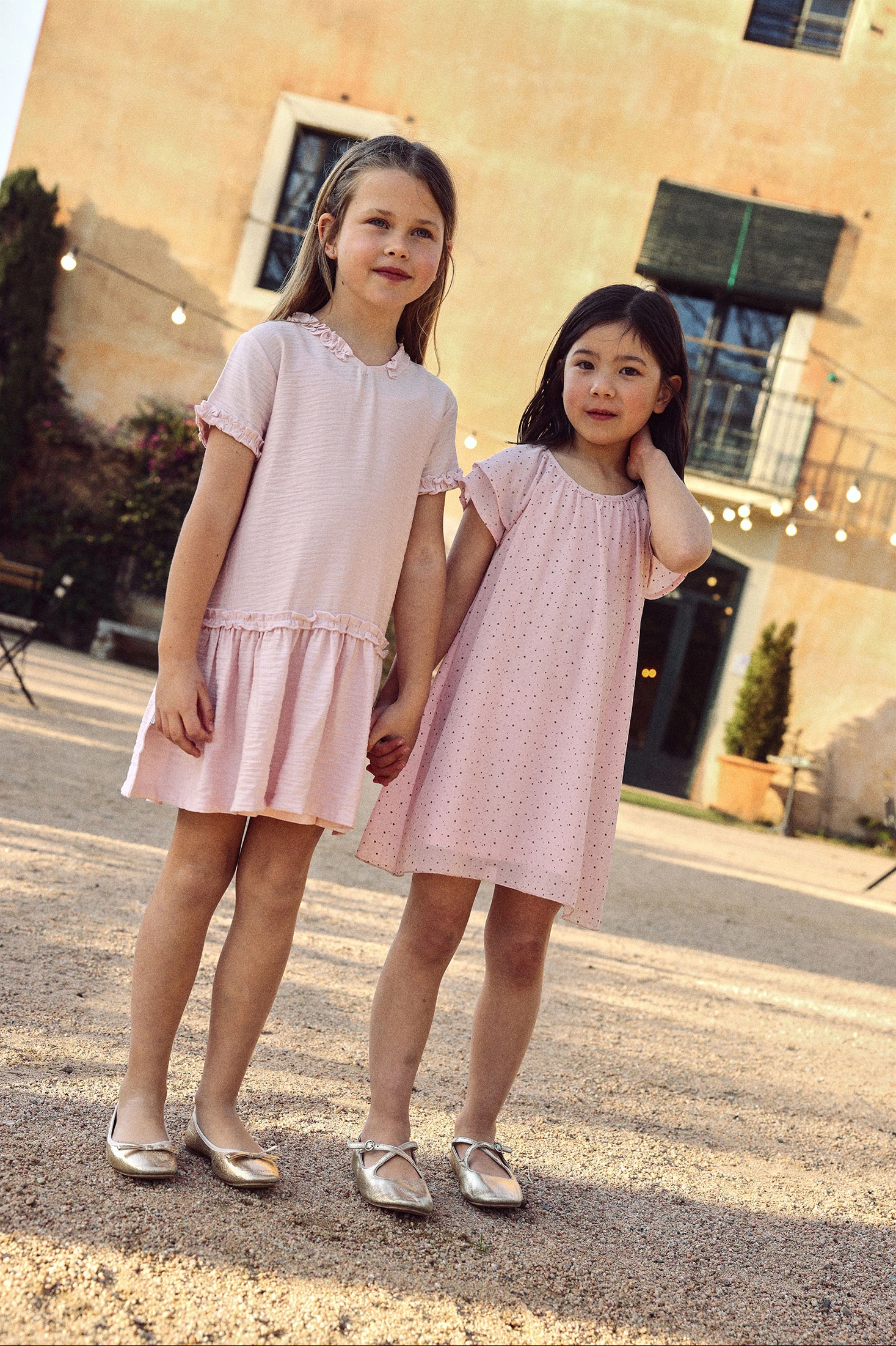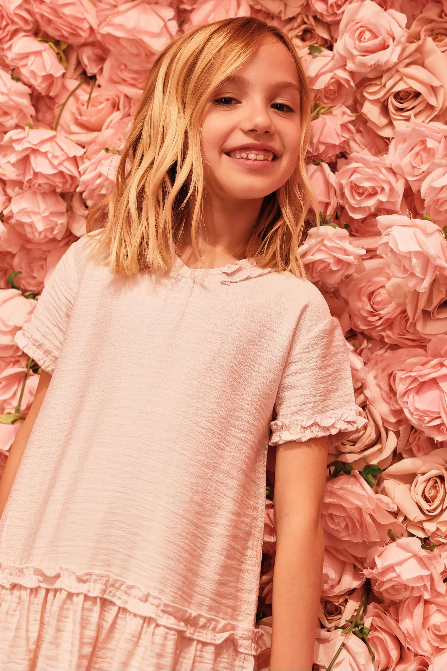 Abito rosa per bambina con un designo incantevole, decorato con dettagli a volant sul collo e sulla vita. Realizzato in un materiale morbido e leggero, è ideale per eventi speciali o giornate estive. Disponibile in taglie da 12 mesi a 8 anni. Il colore rosa pastello aggiunge un tocco dolce e femminile, mentre le maniche corte offrono comfort nei climi caldi. Abbinalo ad accessori semplici per esaltare il suo delicato design.