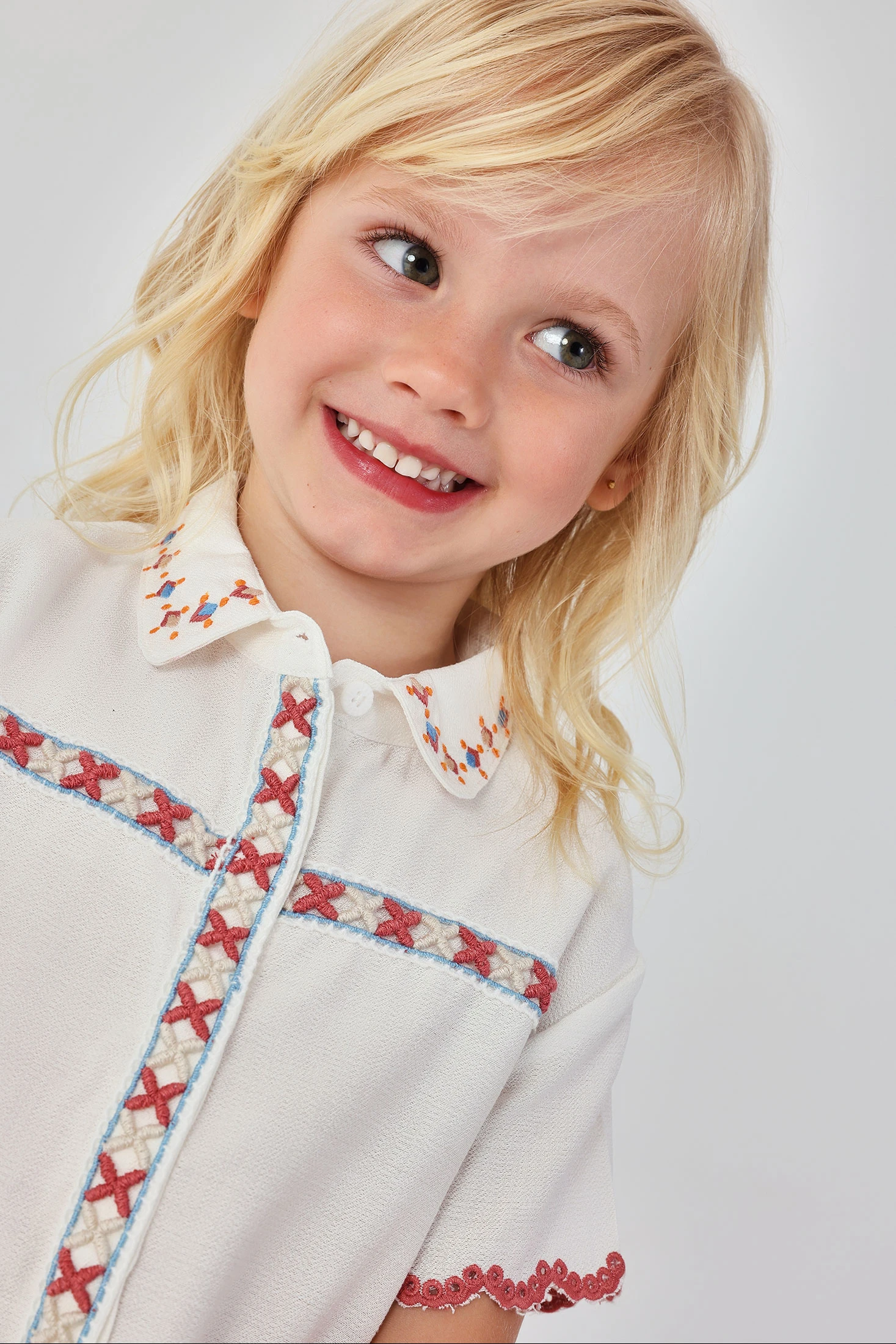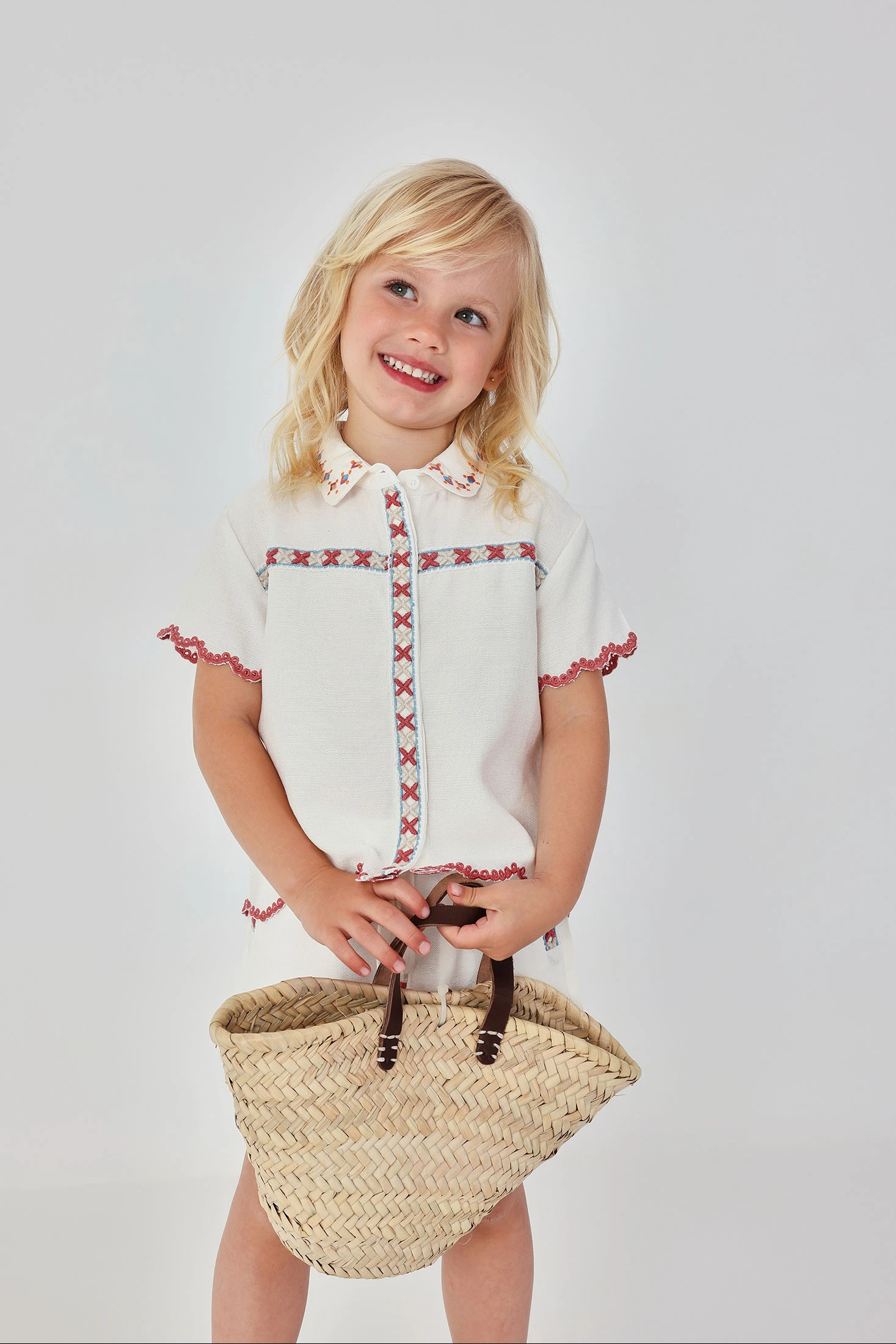 Camicia di tessuto fantasia bianca per bambina, perfetta per occasioni speciali. Presenta dettagli di ricamo colorato sul collo e intorno ai bordi, con una delicata finitura ondulata. Le maniche corte la rendono ideale per climi caldi. Disponibile in taglie dai 12 mesi ai 10 anni, adattandosi alla crescita delle piccole. Il suo design elegante permette di abbinarla a gonne o pantaloni per un look raffinato e chic. Un tocco di stile e freschezza per il guardaroba di ogni bambina.