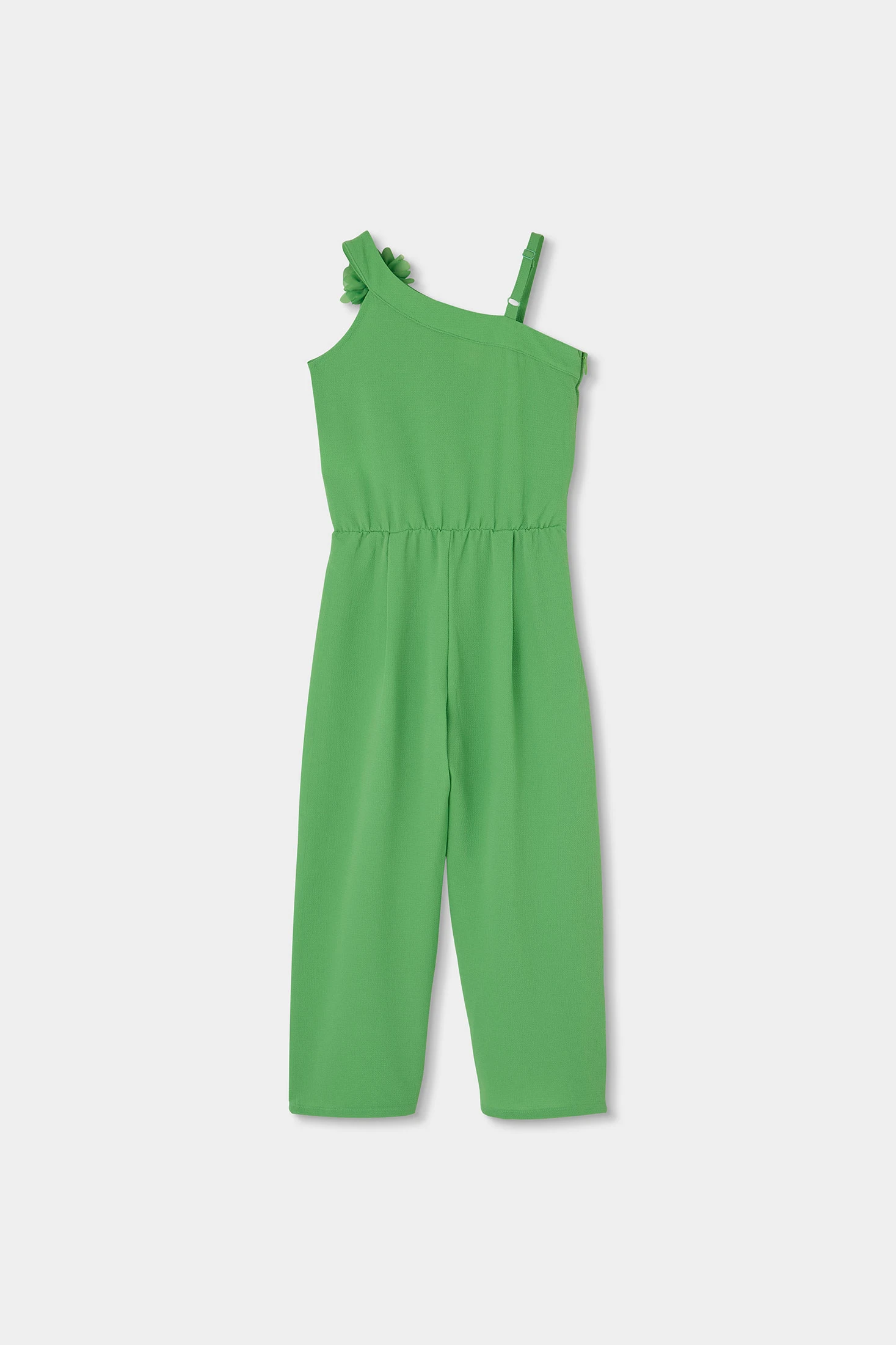 Tuta verde per bambina, scelta chic e moderna, presenta un design con un unico spallino adornato con un fiore decorativo nello stesso tessuto crepe verde, offrendo uno stile unico e fresco. Realizzata in un materiale di crepe morbido e confortevole, è ideale per l'uso quotidiano. Adatta per età dai 2 ai 14 anni. La vita elastica assicura una vestibilità perfetta, mentre le gambe ampie offrono libertà di movimento. Perfetta da abbinare con accessori colorati, è un capo versatile per diverse occasioni.