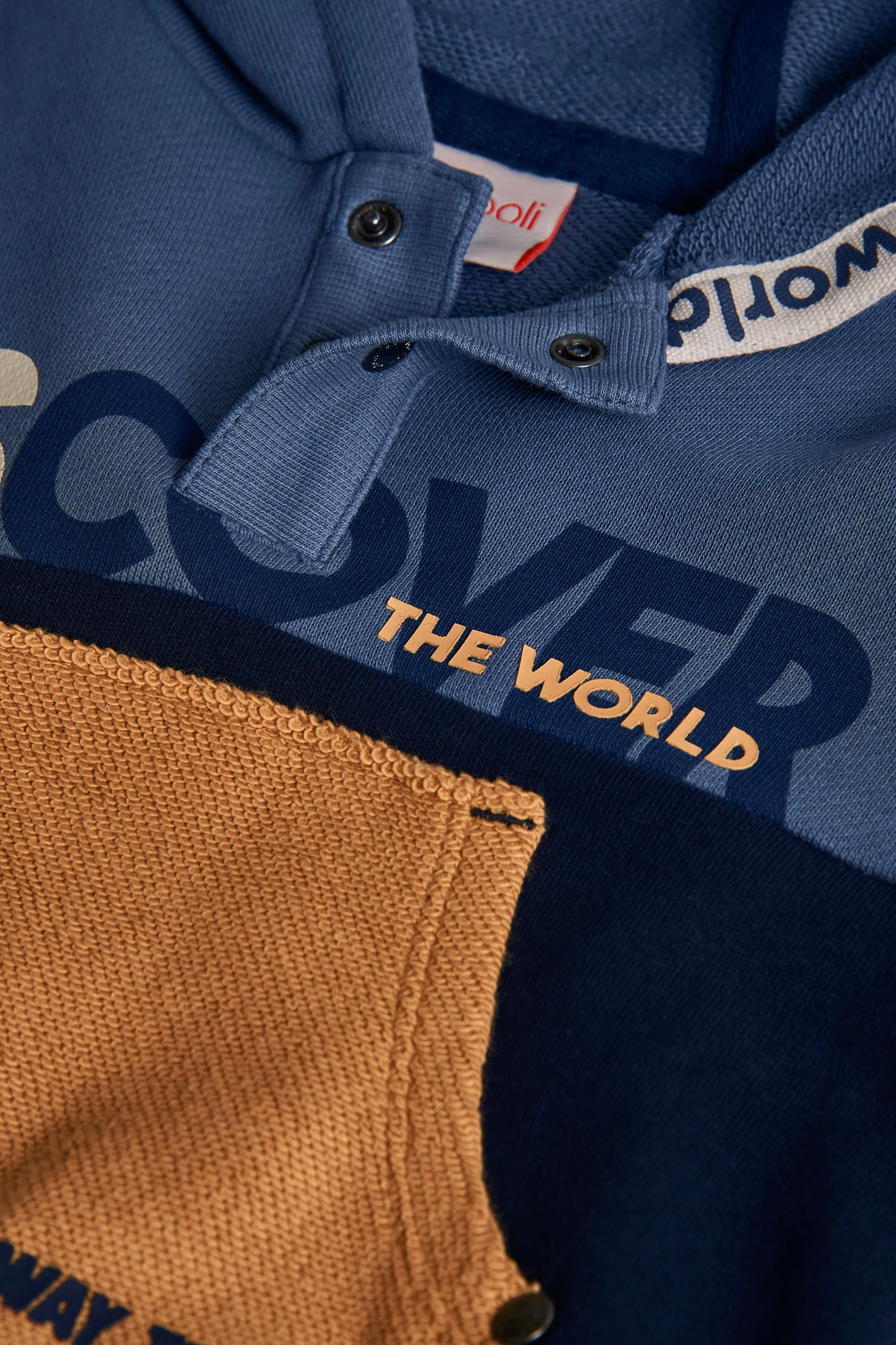 Felpa per bambino in blu, perfetta per le stagioni autunnali e invernali grazie al suo tessuto caldo e accogliente. Progettata con una pratica tasca anteriore e la frase "DISCOVER THE WORLD" sul petto, offre un'aria avventurosa e moderna. Disponibile in taglie da 12 mesi a 10 anni per adattarsi a tutte le fasi di crescita. Ideale da abbinare a pantaloni di jeans o sportivi, offrendo uno stile casual e pratico per tutti i giorni.