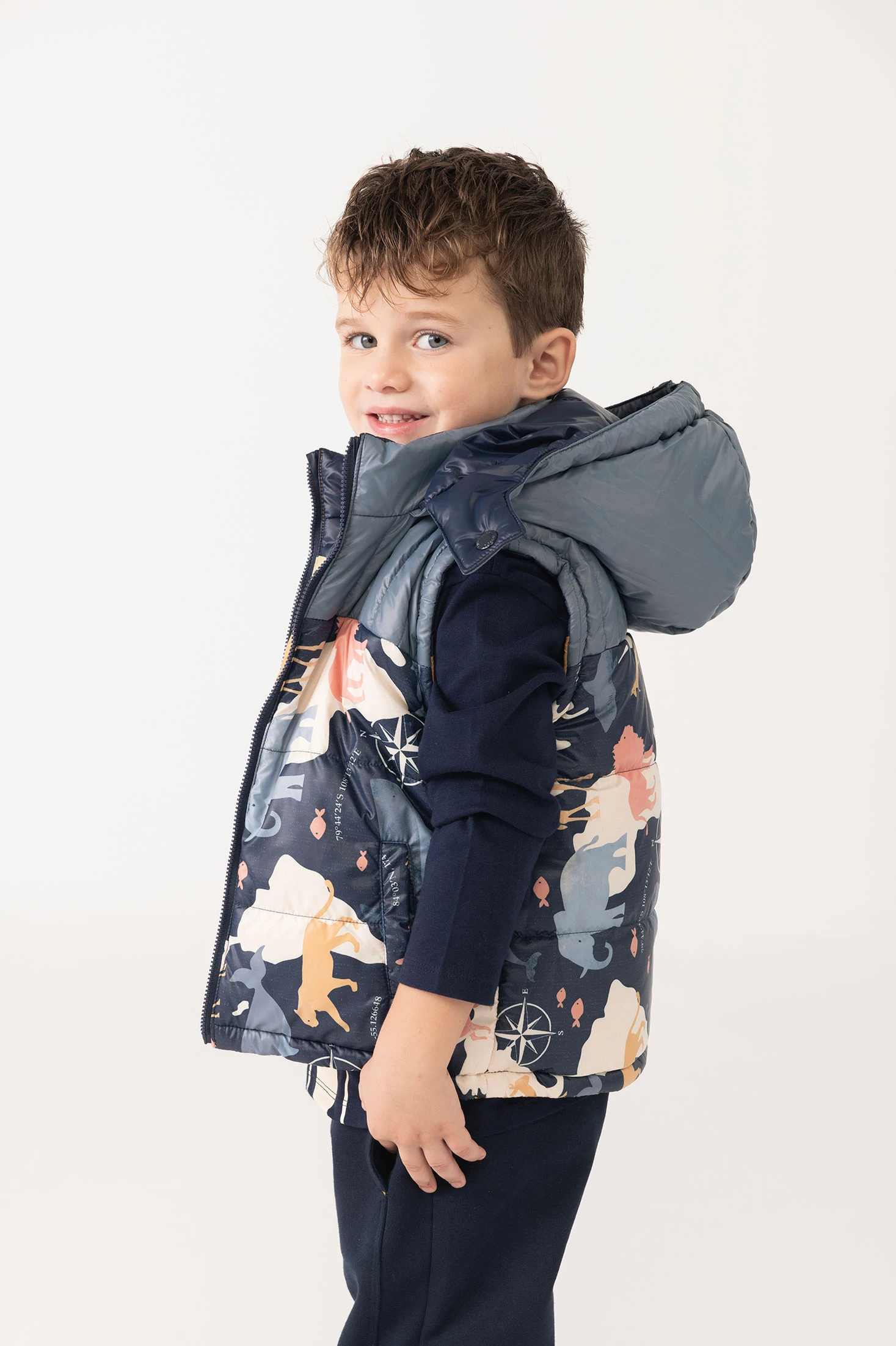 Gilet reversibile per bambino realizzato in tessuto tecnico color senape, ideale per le stagioni autunnali e invernali. Presenta un lato con un design vivace di animali in tonalità multicolori, mentre l'altro lato è in un elegante giallo uniforme, offrendo due opzioni di stile in un solo capo. La sua cerniera facilita un utilizzo rapido e sicuro. Disponibile in taglie da 12 mesi a 10 anni, questo gilet versatile è perfetto da abbinare a maglioni o magliette a maniche lunghe, offrendo calore e un accattivante tocco ludico al guardaroba infantile.