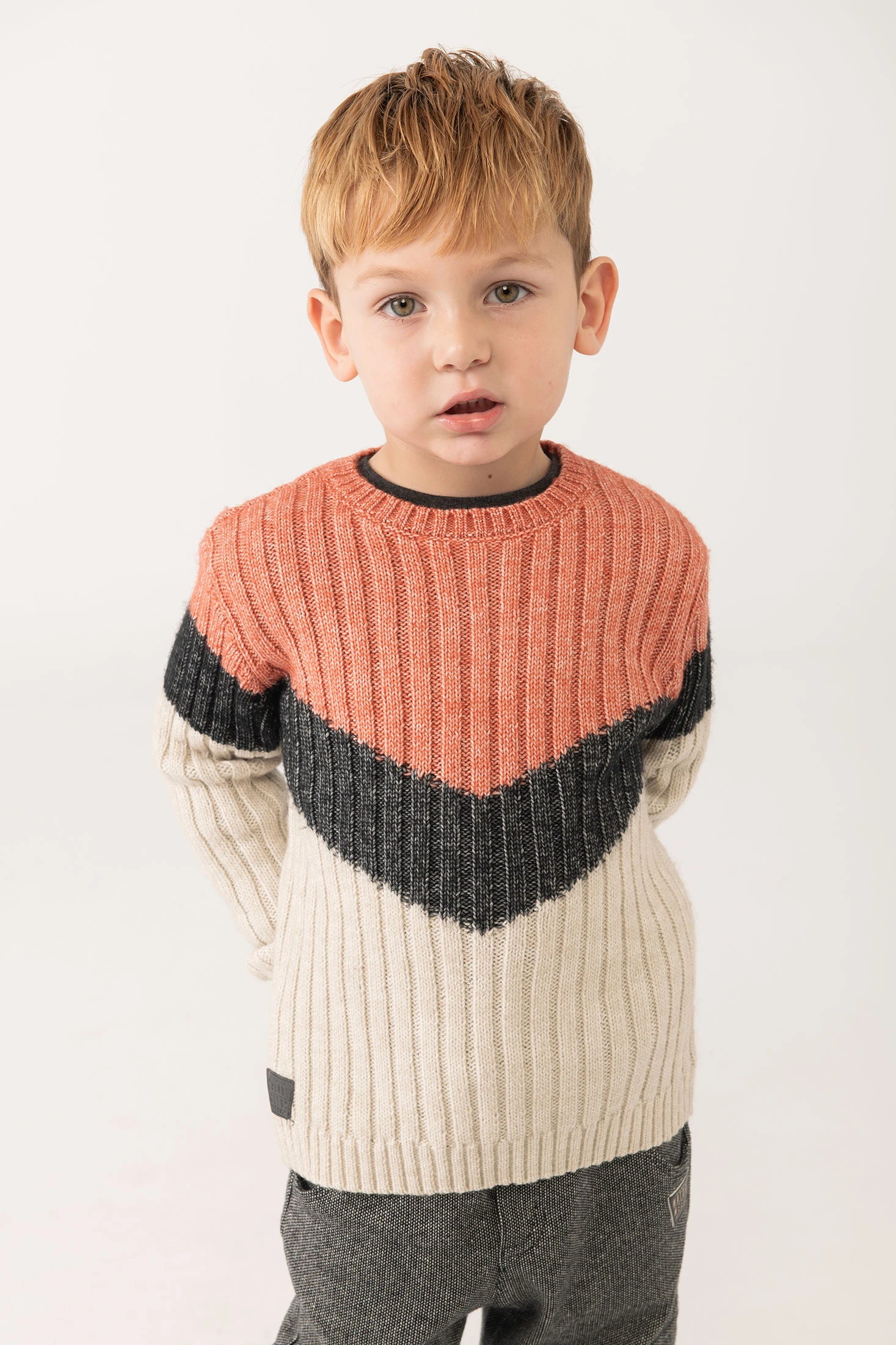 Maglione lavorato a maglia per bambino in colore arancione, ideale per l'autunno e l'inverno grazie al suo tessuto morbido che offre comfort e calore. Il design in tonalità terracotta, nero e crema dona uno stile moderno e distintivo al guardaroba infantile. Le sue maniche lunghe e il collo rotondo offrono ulteriore protezione nei giorni freddi. Disponibile in taglie dai 12 mesi ai 10 anni, rende possibile versatilità e stile in ogni occasione. Perfetto da abbinare a jeans o joggers, creando un look casual e moderno per il tuo piccolo.