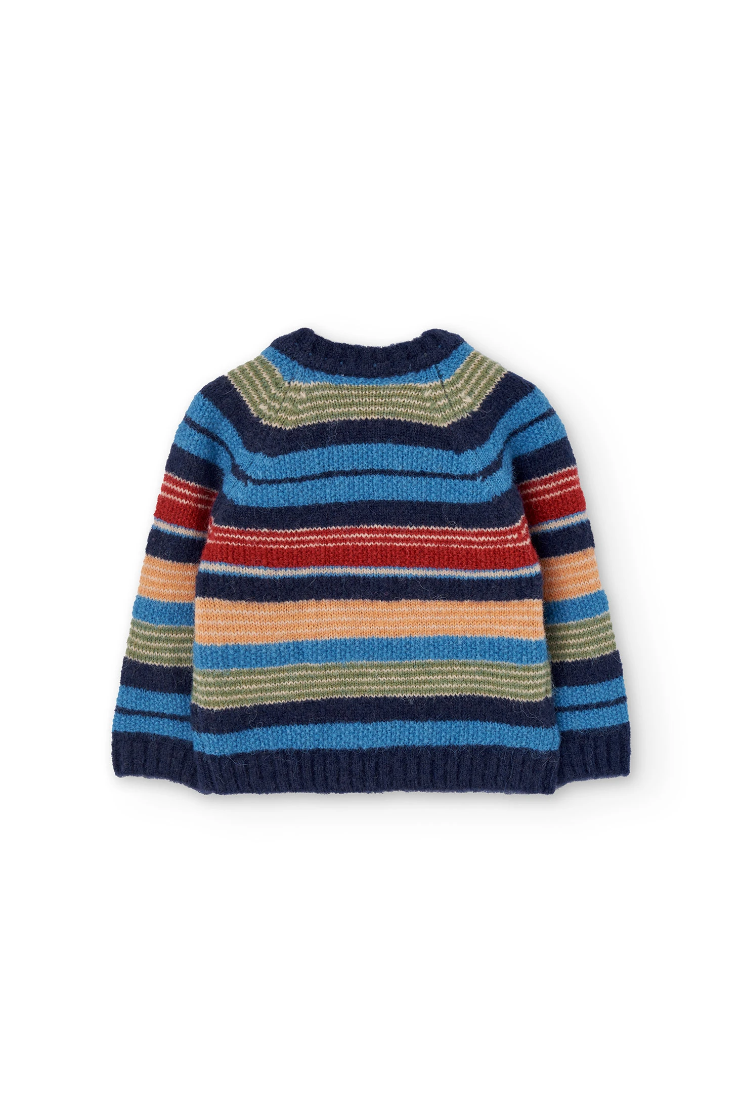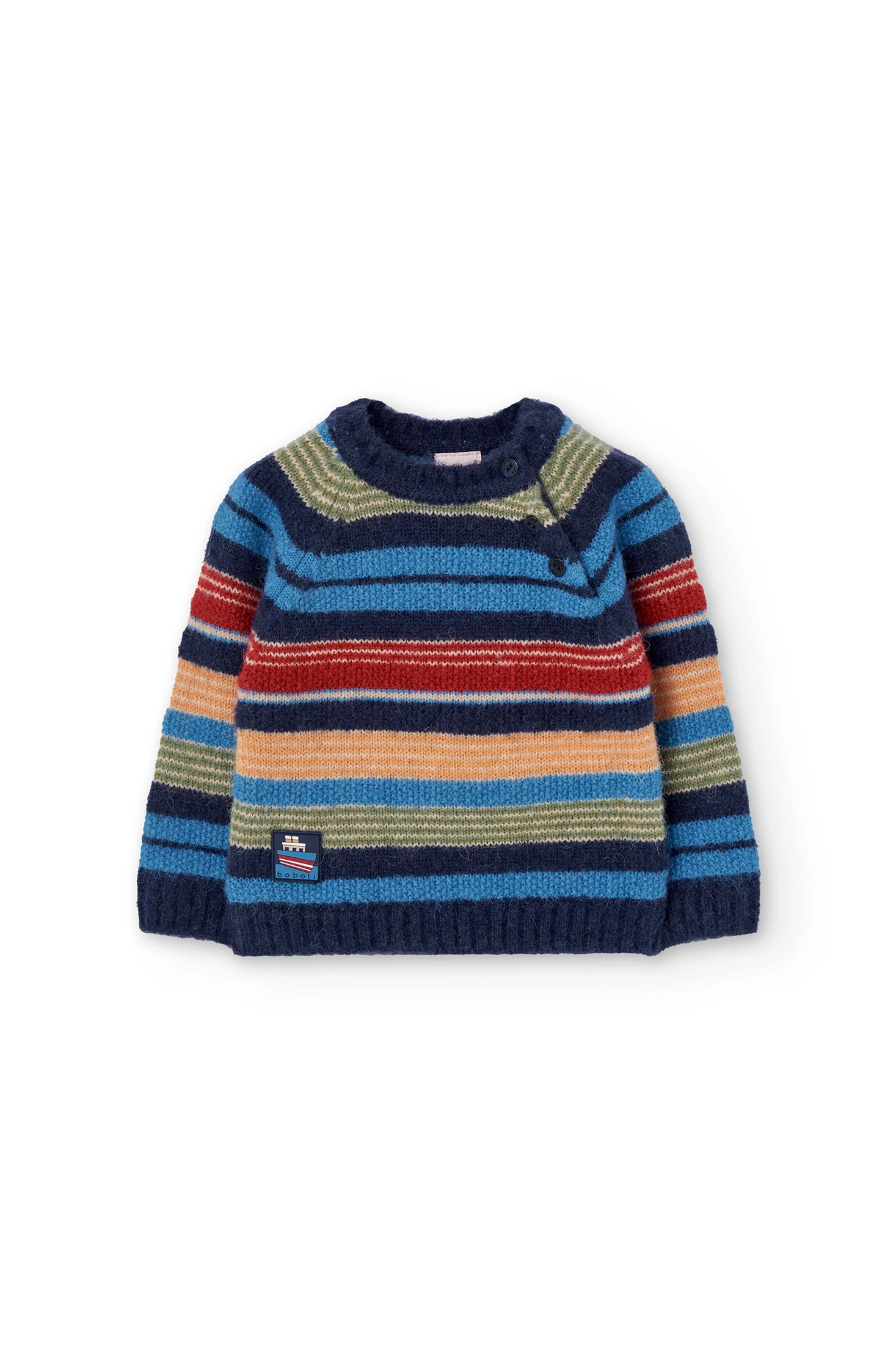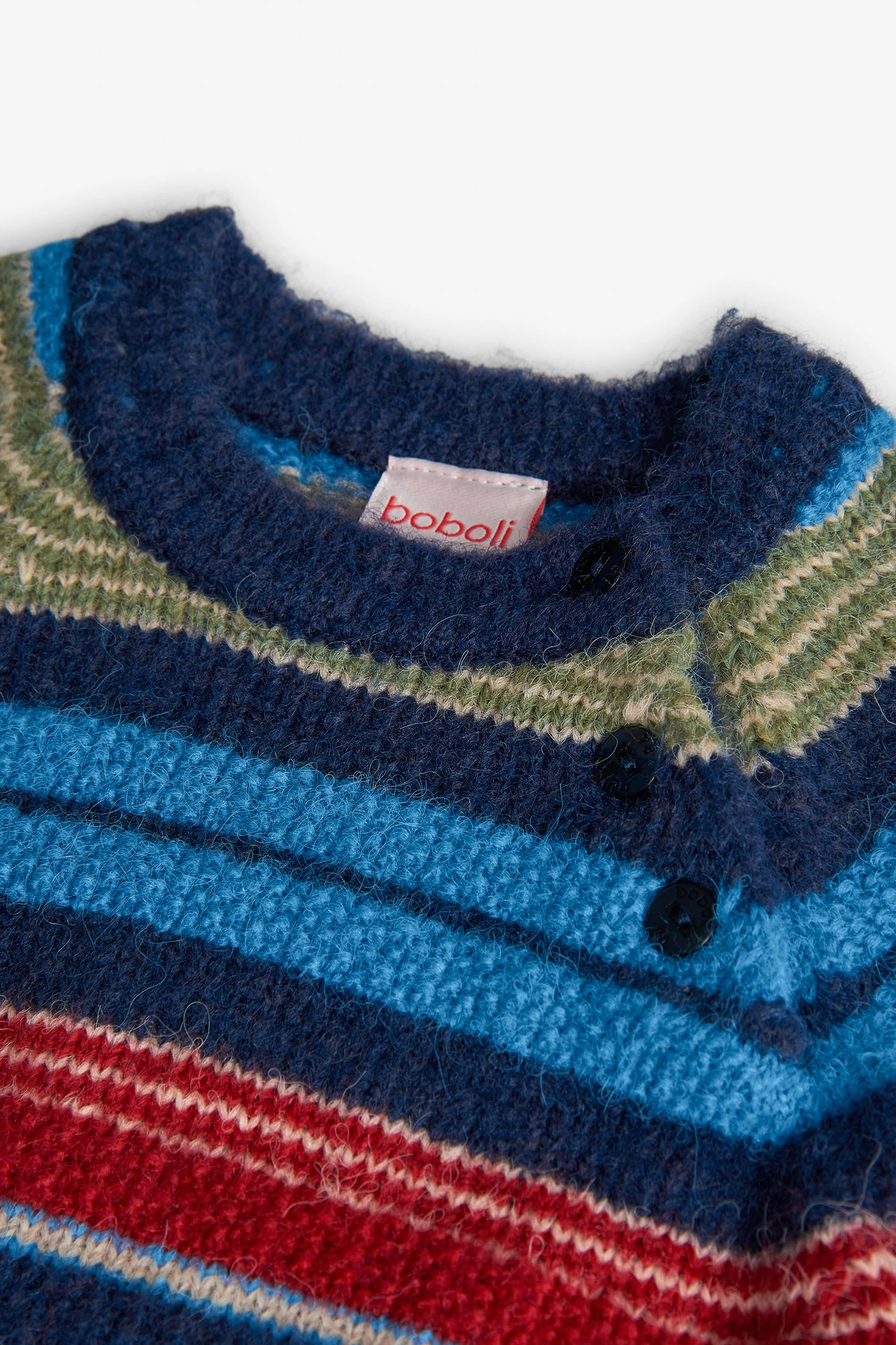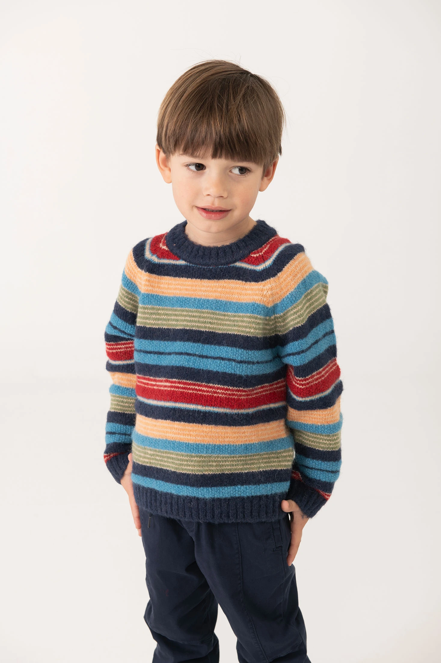 Maglione a maglia per bambino in blu navy con righe offre un'opzione elegante e versatile per le stagioni autunnali e invernali. Il design incorpora un classico motivo a righe, offrendo uno stile senza tempo che incanta genitori di entrambi i sessi. Realizzato in un tessuto morbido e caldo, assicura comfort e benessere per i più piccoli durante tutta la giornata. Il suo girocollo e le maniche lunghe offrono una protezione ottimale contro il freddo. Disponibile nelle taglie da 12 mesi a 10 anni.