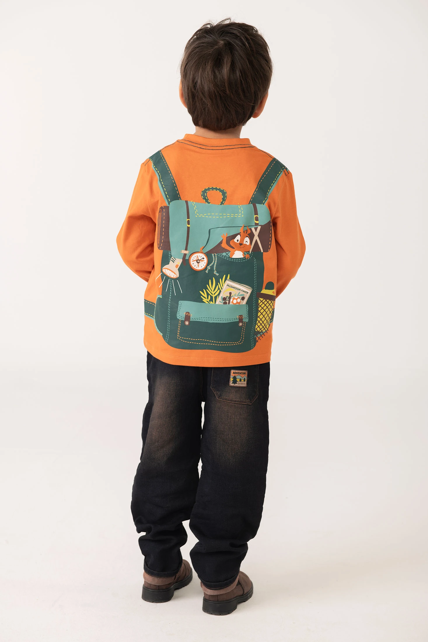 Maglia a maniche lunghe per bambino in vibrante colore arancione, ideale per i piccoli avventurieri. Realizzata in un morbido tessuto a maglia, offre comfort e calore durante l'autunno e l'inverno. Disponibile in taglie da 12 mesi a 10 anni, si abbina comodamente con jeans o pantaloni casual per un look divertente e disinvolto. Dettagli avventurosi come stampe ed etichette aggiungono un tocco distintivo, rendendola un capo essenziale nel guardaroba infantile.