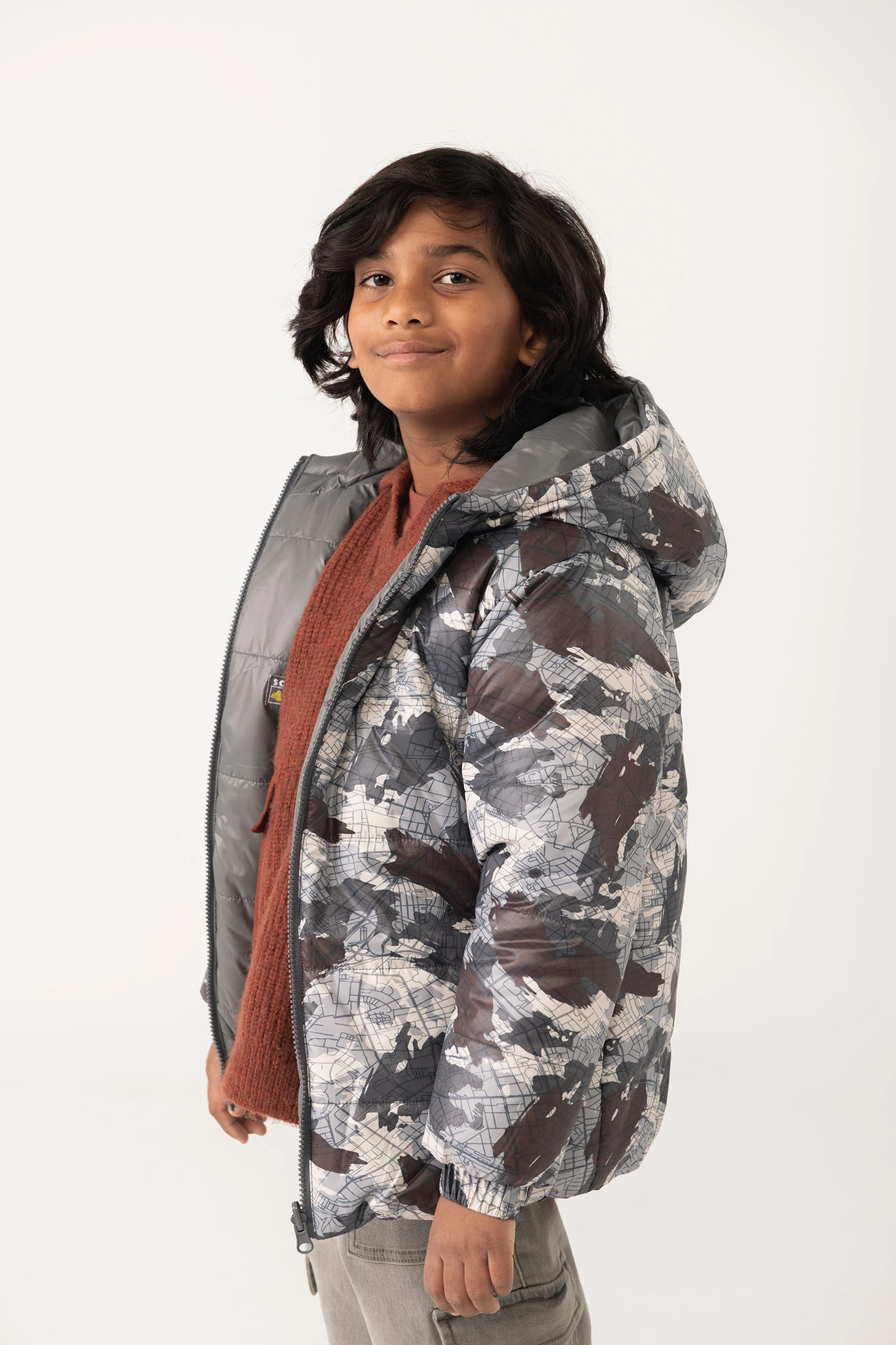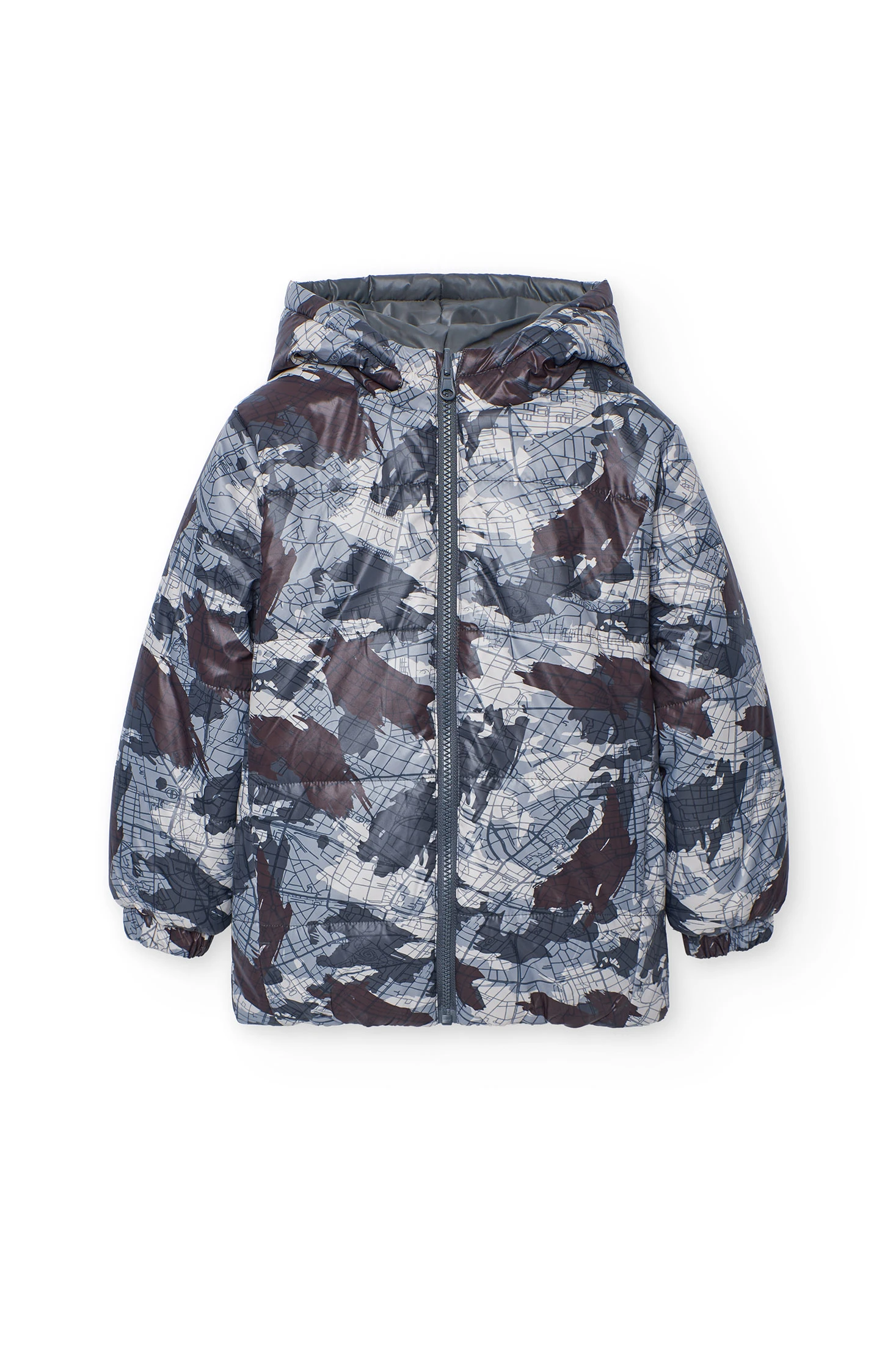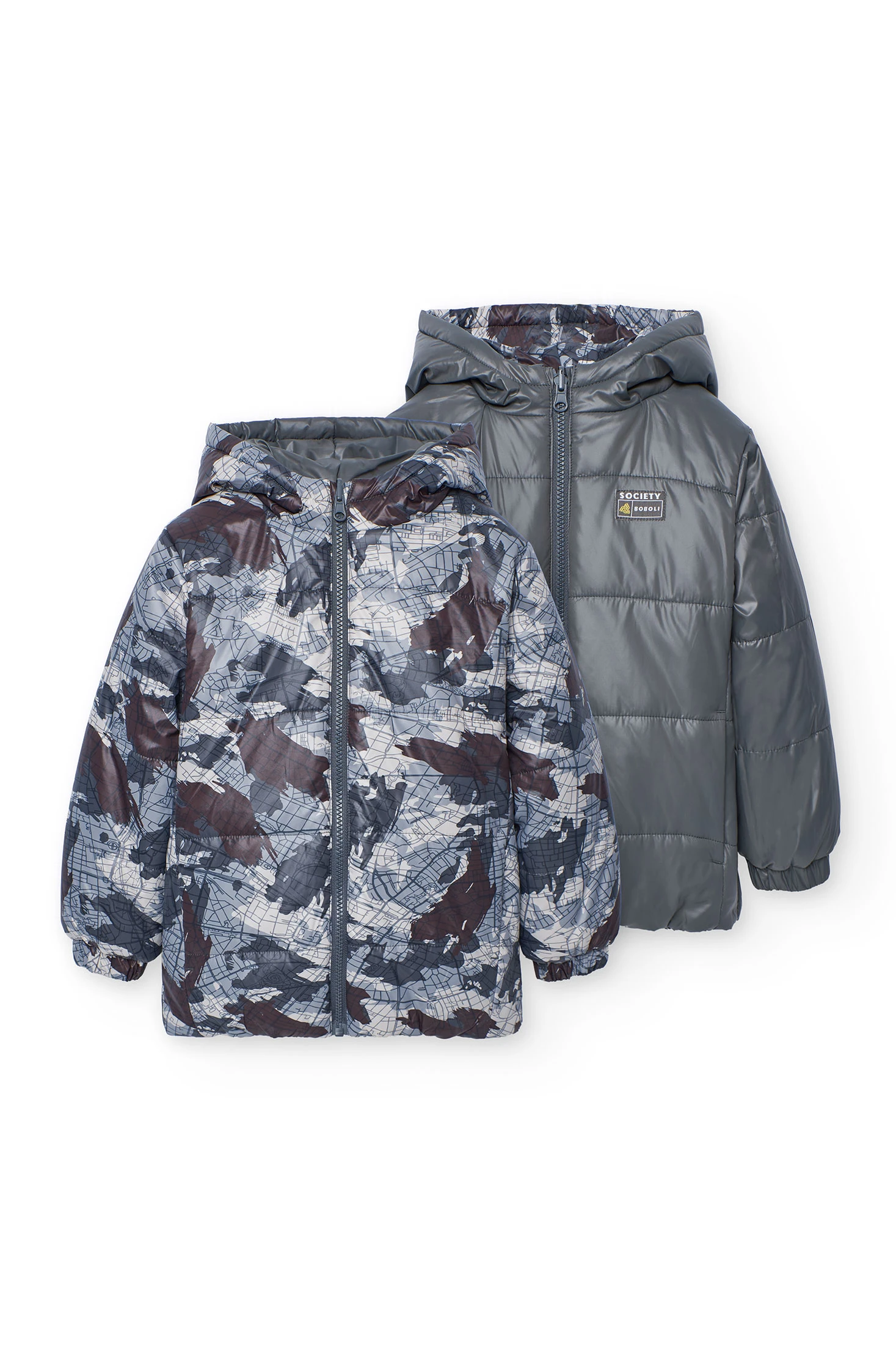 Parka tecnica reversibile per bambino con elegante stampa astratta in tonalità grigie, perfetta per la stagione invernale. Progettata con materiali resistenti e caldi, offre un'eccellente protezione contro il freddo, ideale per attività all'aperto. Dotata di cappuccio integrato e chiusura a zip che assicura maggiore comodità e praticità. Disponibile in taglie da 2 a 14 anni, si abbina facilmente con pantaloni sportivi o jeans per un look invernale completo. Il suo design moderno e funzionale la rende un'opzione imprescindibile per il guardaroba dei più piccoli.