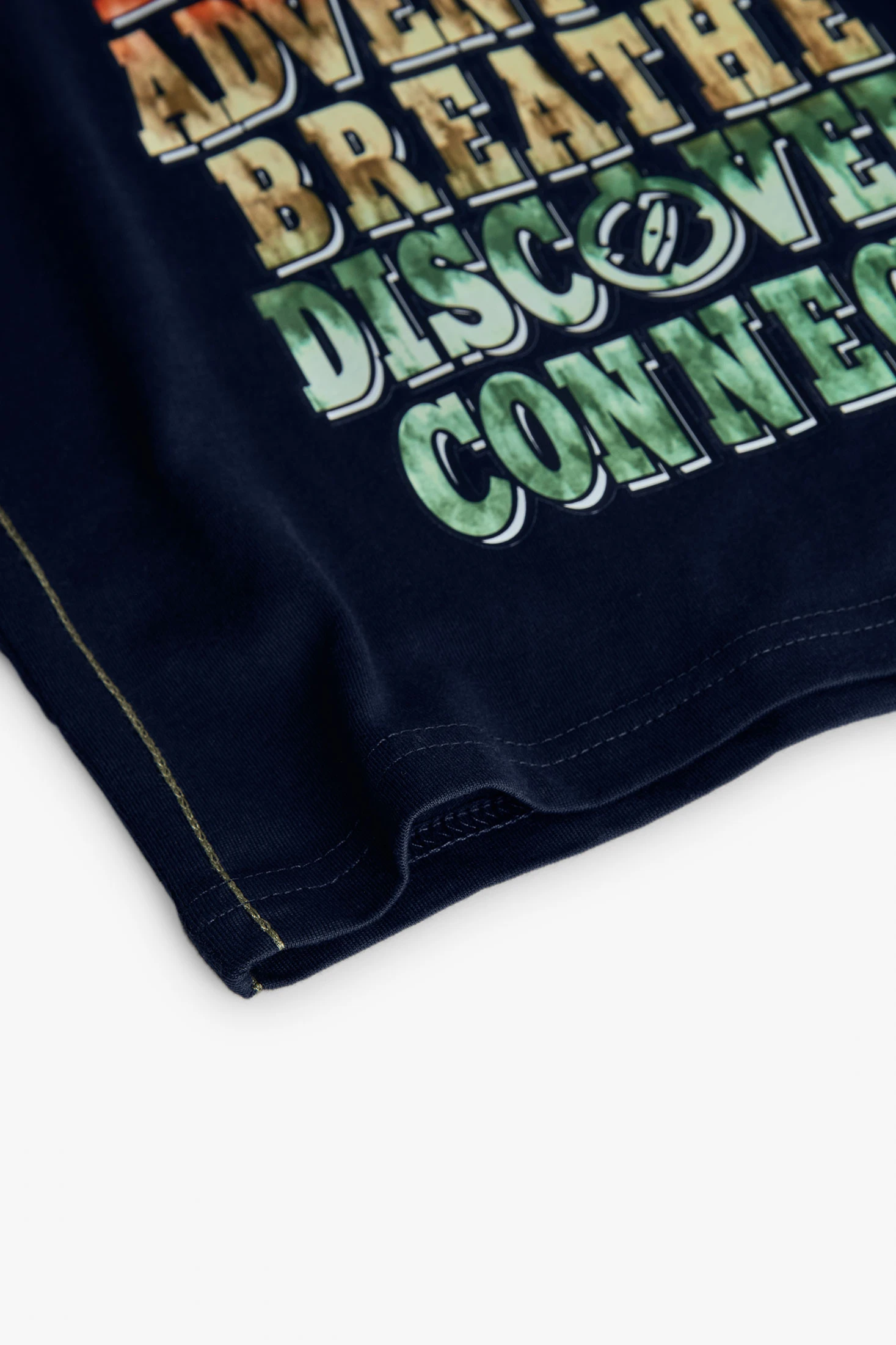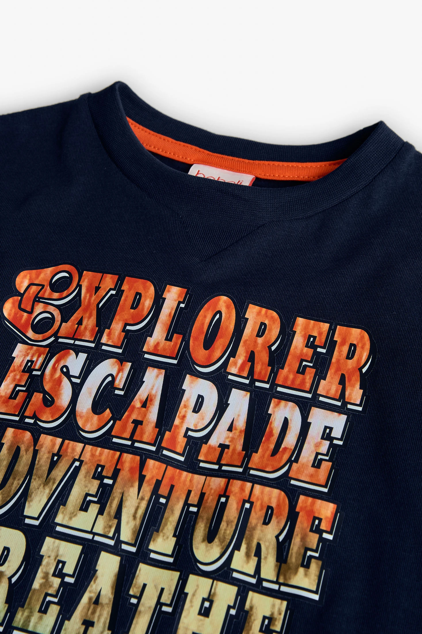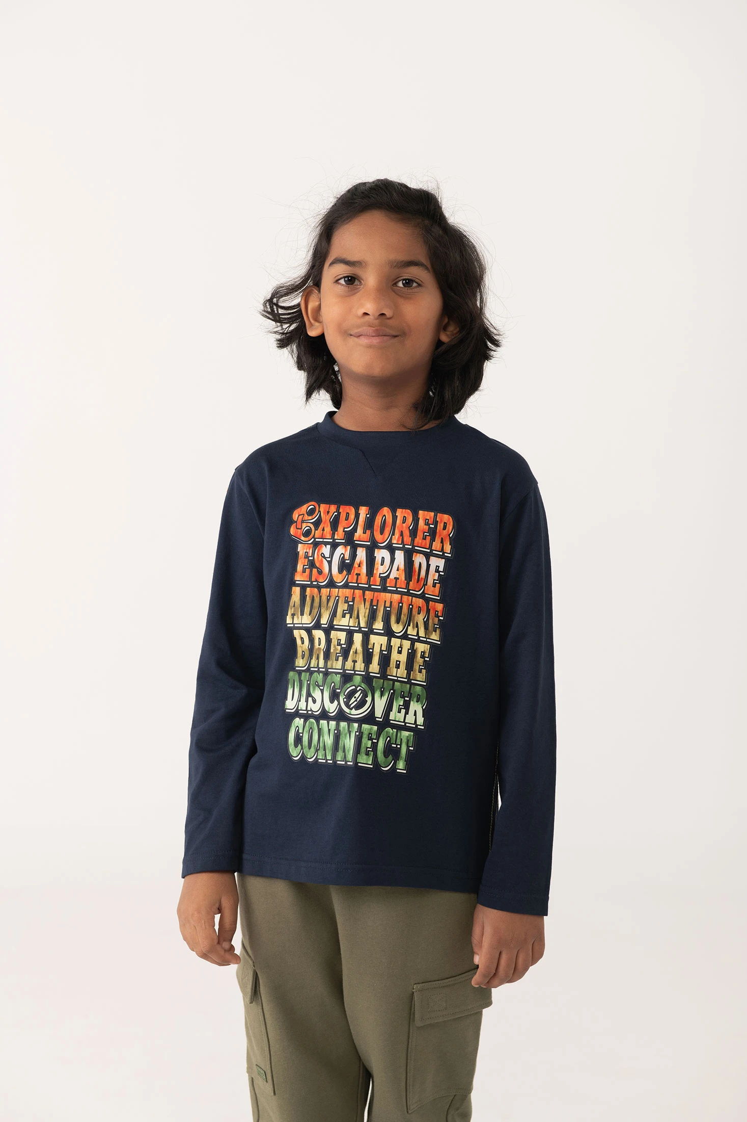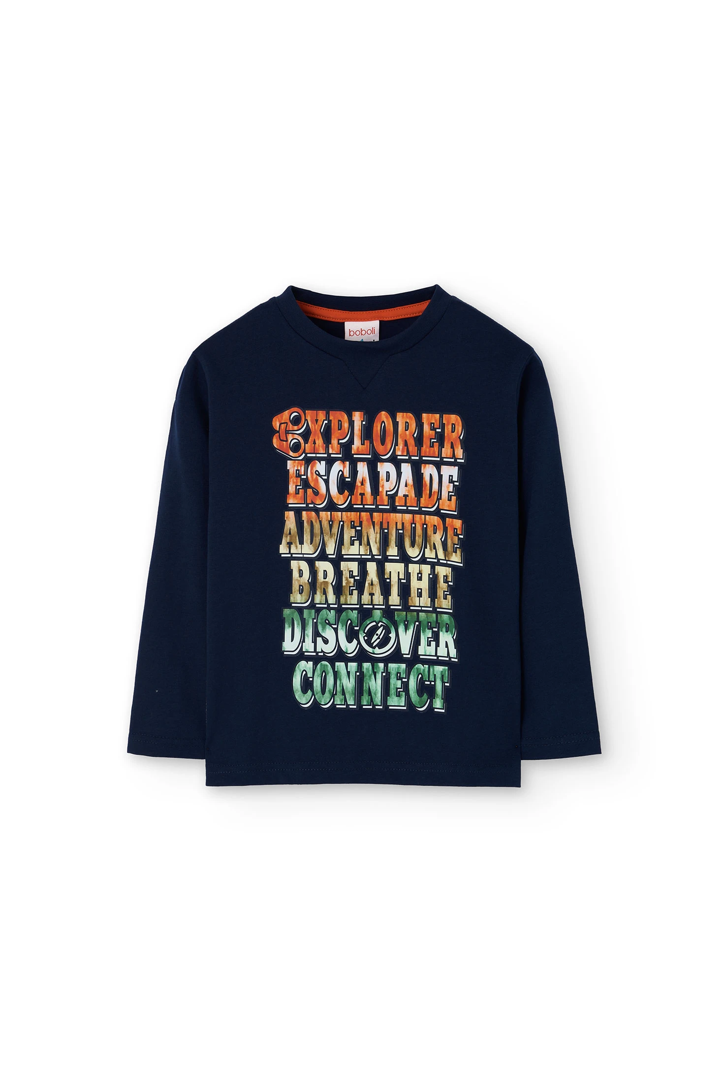 Maglietta per bambino in blu navy, ideale per l'autunno e l'inverno grazie al suo tessuto che offre comfort e flessibilità. Design moderno con una stampa di parole ispiratrici che catturano l'attenzione. Presenta un collo rotondo e maniche lunghe, adatta per i giorni freddi. Disponibile in taglie da 2 a 14 anni, è un capo versatile che si può abbinare facilmente con jeans o pantaloni da tuta, perfetta per i piccoli avventurieri.