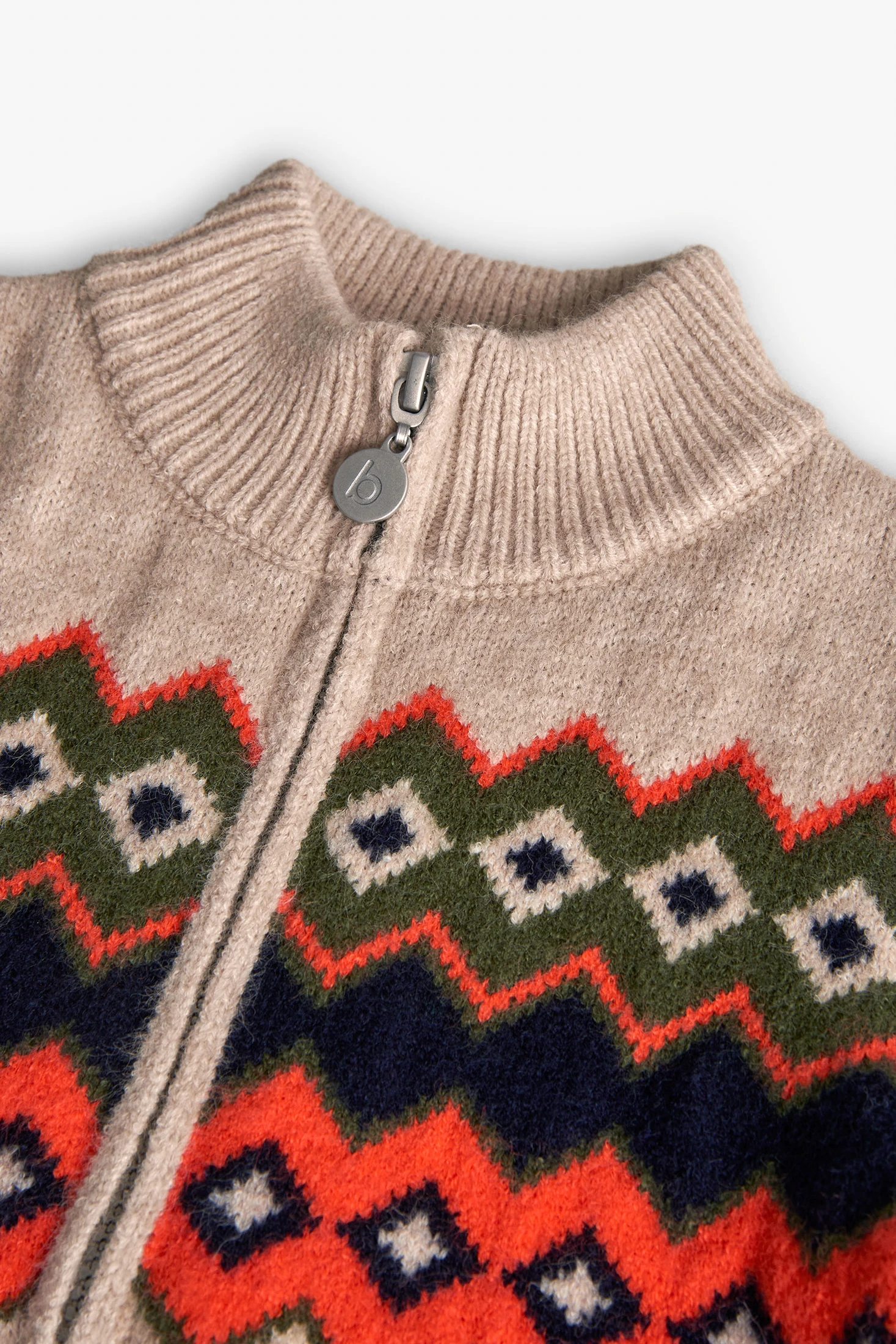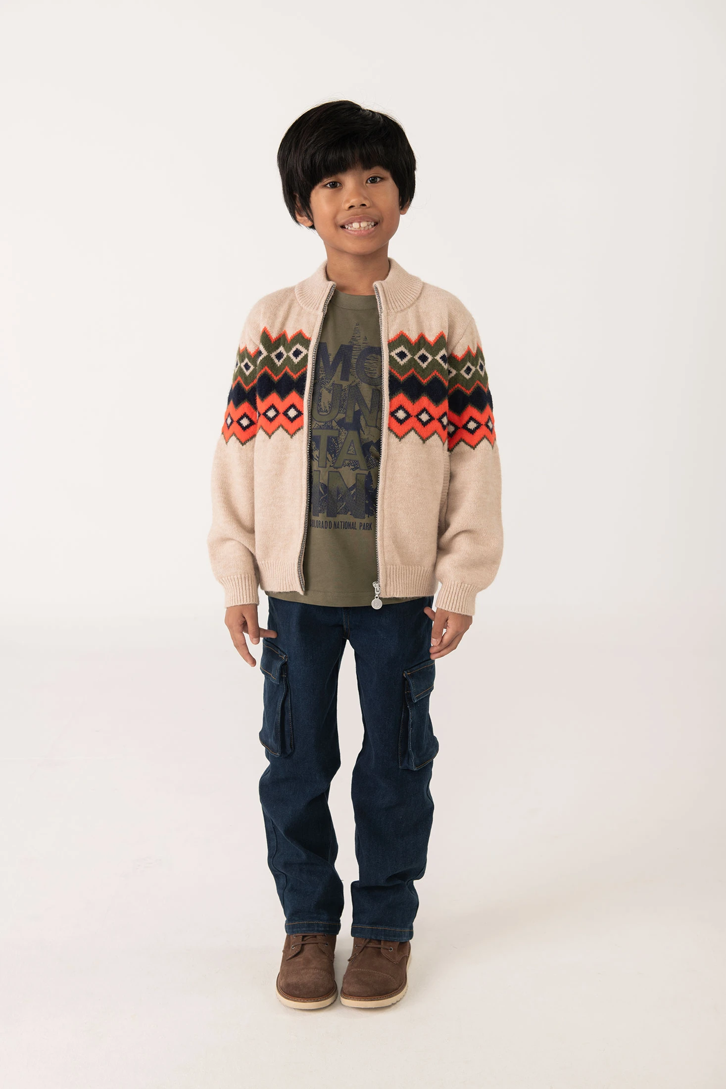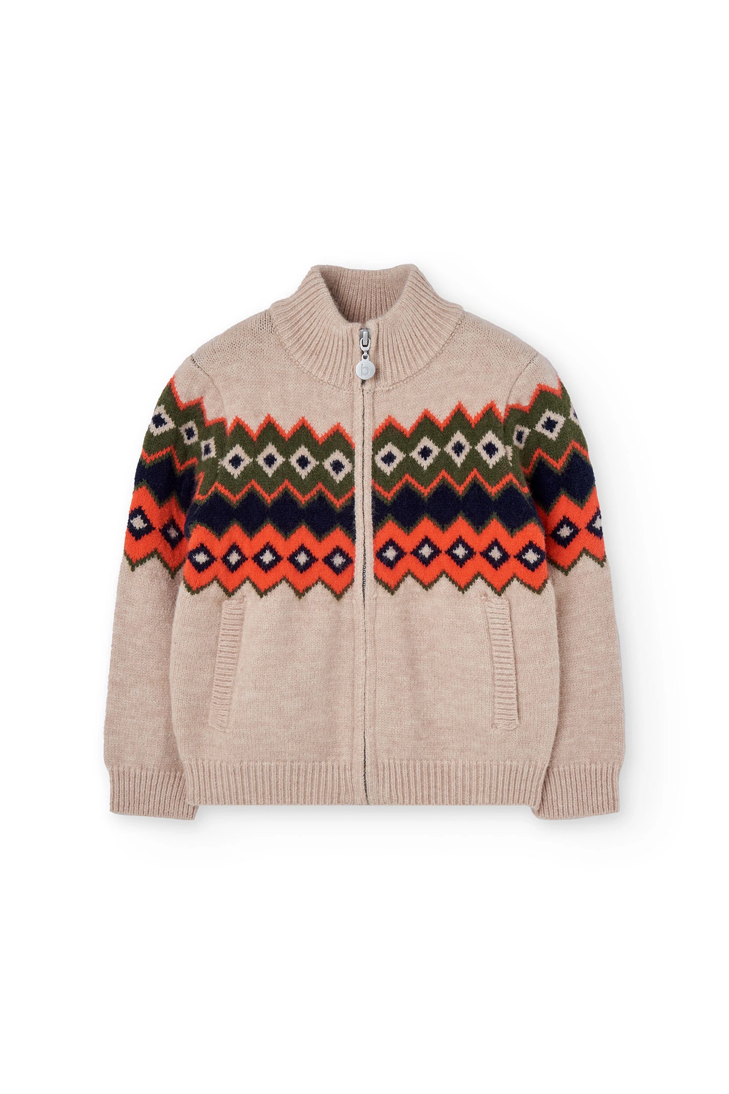 Giacca di maglia per bambino in colore beige, ideale per le stagioni autunnali e invernali. Realizzata con un tessuto caldo e morbido, presenta un elegante design geometrico in tonalità marroni e grigie che risaltano sul fondo beige. Dotata di chiusura a zip per facilitarne l'uso quotidiano, dispone di un collo alto che offre maggiore protezione contro il freddo. Disponibile in taglie dalla 2 alla 14 anni, questa giacca versatile e moderna completa qualsiasi outfit casual, apportando stile e comfort ai più piccoli.
