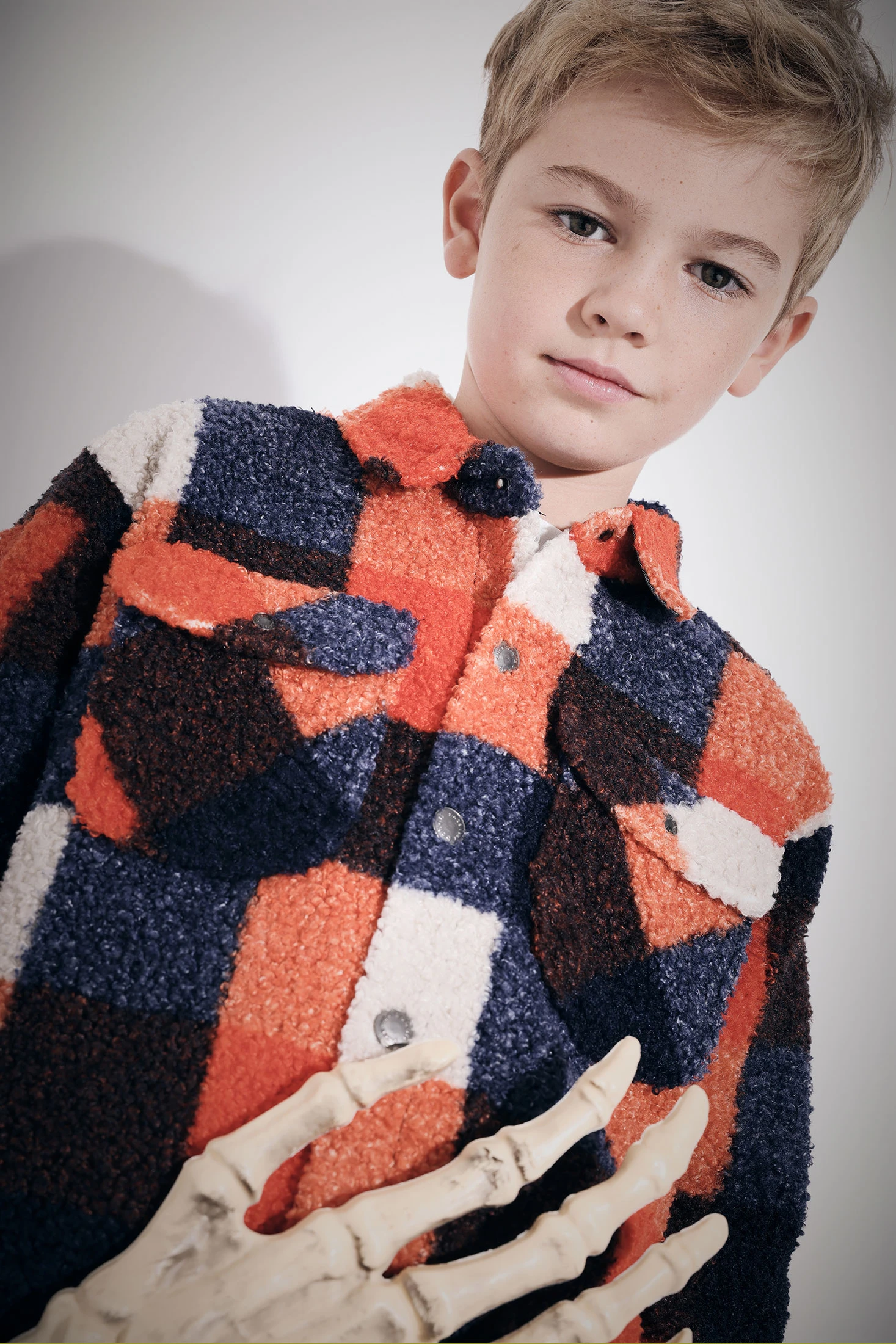 Giacca in montone perfetta per la stagione autunnale e invernale, offrendo calore e uno stile unico. La stampa a quadri nei toni del blu, arancione e bianco offre un design moderno e attraente. Dotata di un colletto classico e chiusura frontale con bottoni a pressione, è ideale per varie occasioni. Le maniche lunghe garantiscono protezione nei giorni freddi, e il materiale in montone morbido assicura il massimo comfort. Disponibile in taglie che vanno dai 2 ai 14 anni, questa giacca diventa un complemento colorato del guardaroba infantile.