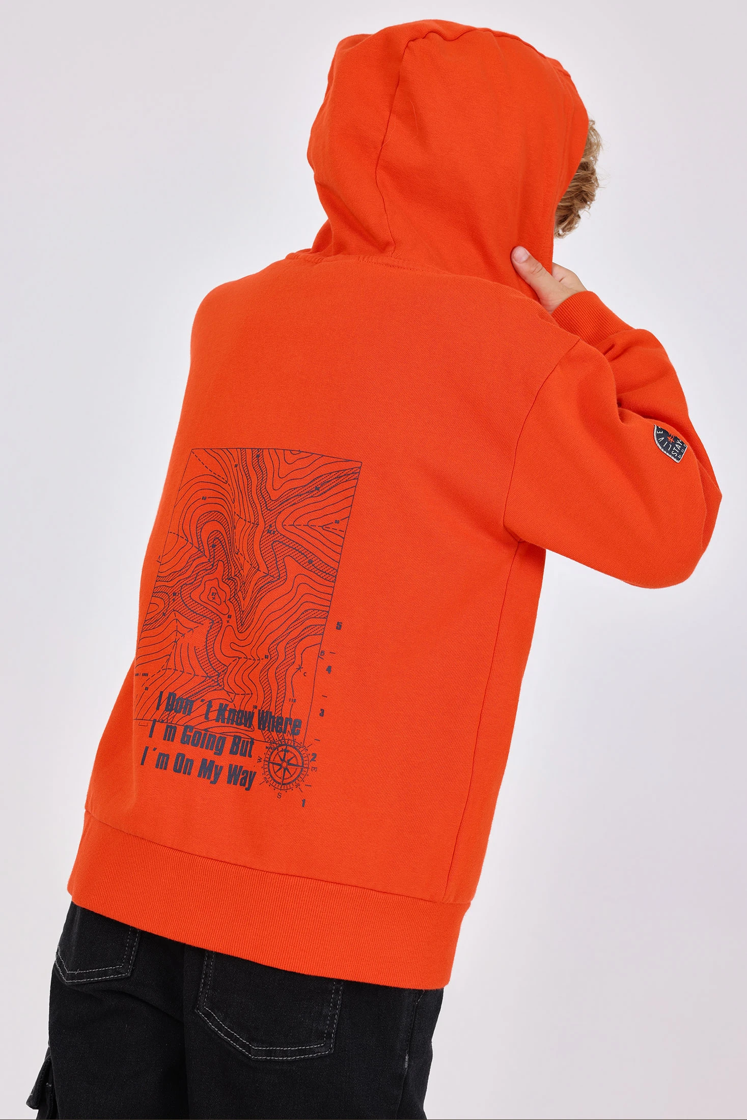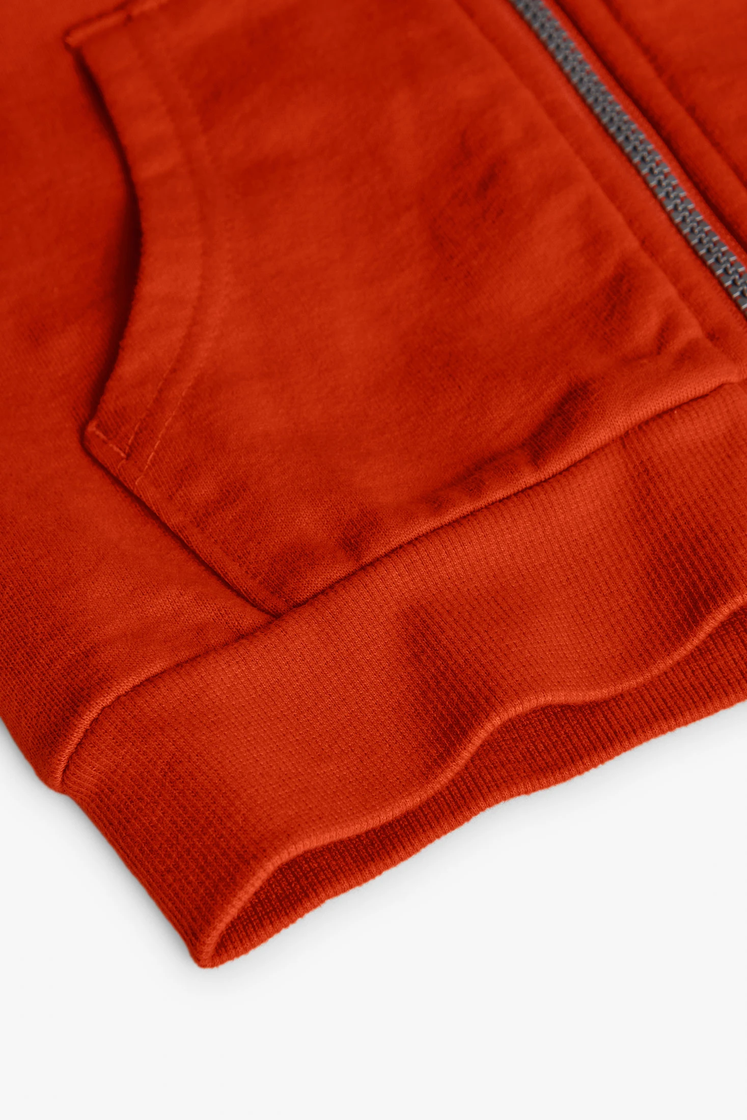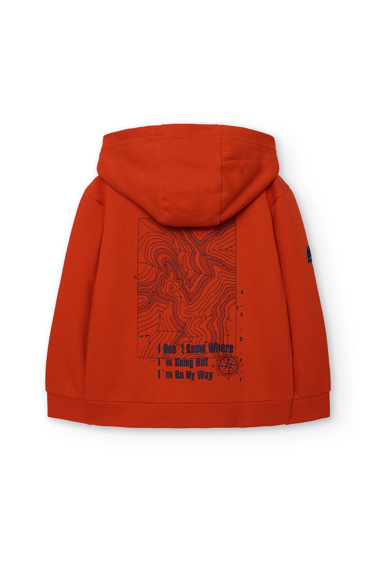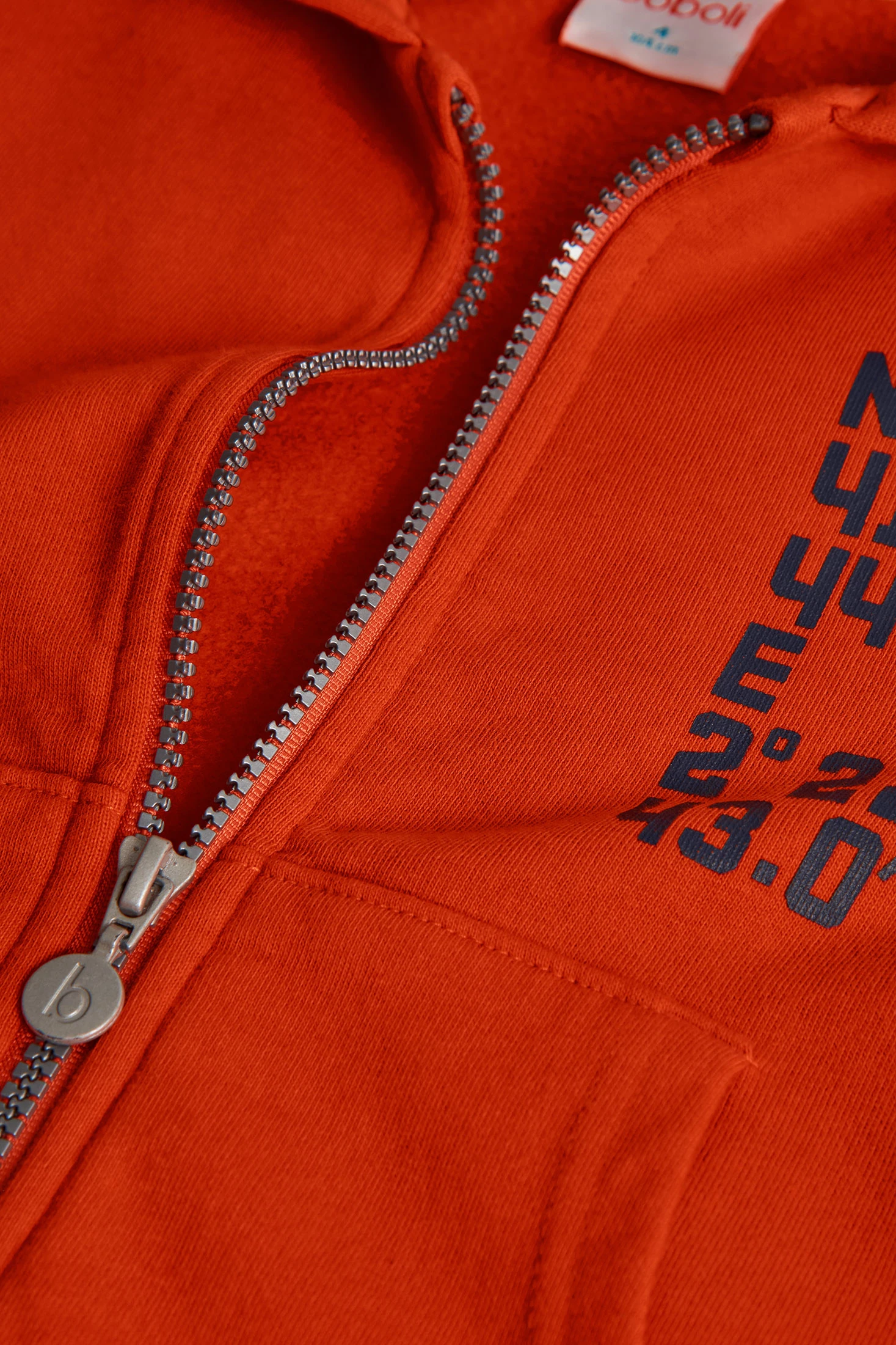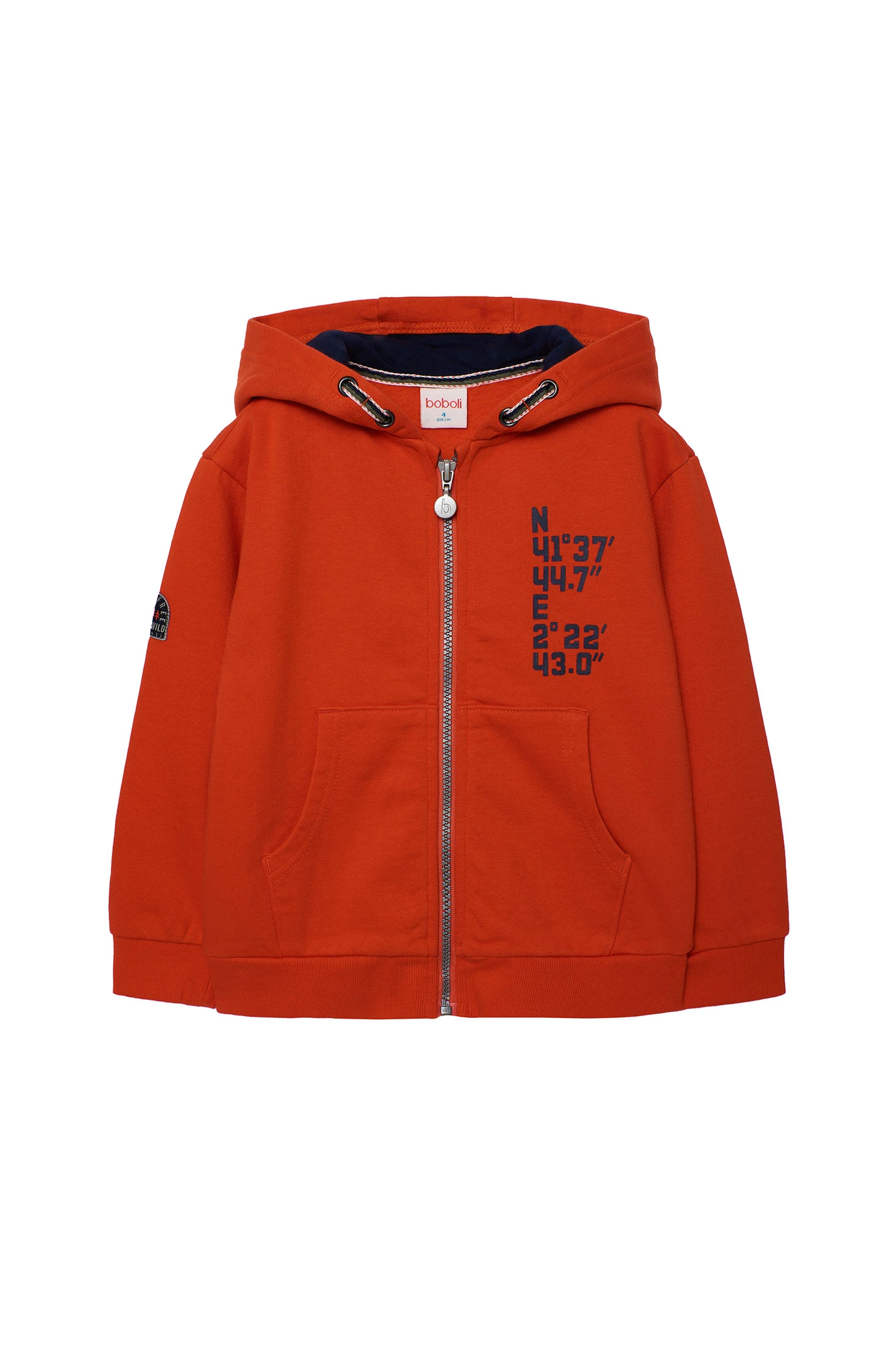 Giacca in felpa per bambino di colore arancione, ideale per i mesi autunnali e invernali grazie al suo tessuto morbido che offre comfort e calore. Si distingue per il suo design moderno con una stampa accattivante di coordinate sul petto in blu. Presenta una pratica chiusura frontale con cerniera e una tasca tipo marsupio perfetta per mantenere le mani calde. Disponibile in taglie da 2 a 14 anni, questa giacca si abbina facilmente con jeans o pantaloni per un look casual e accogliente.