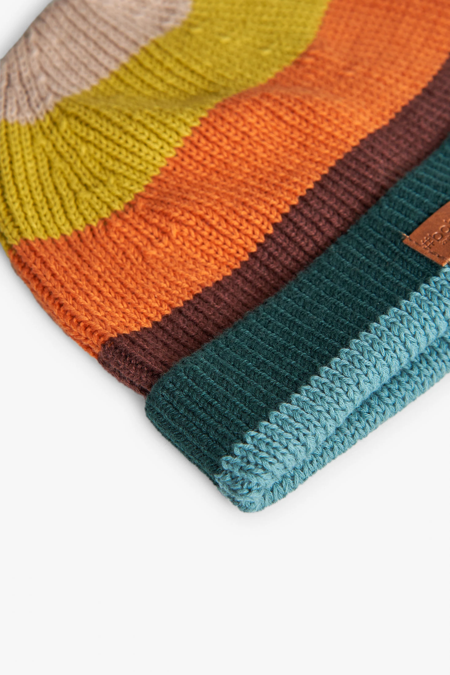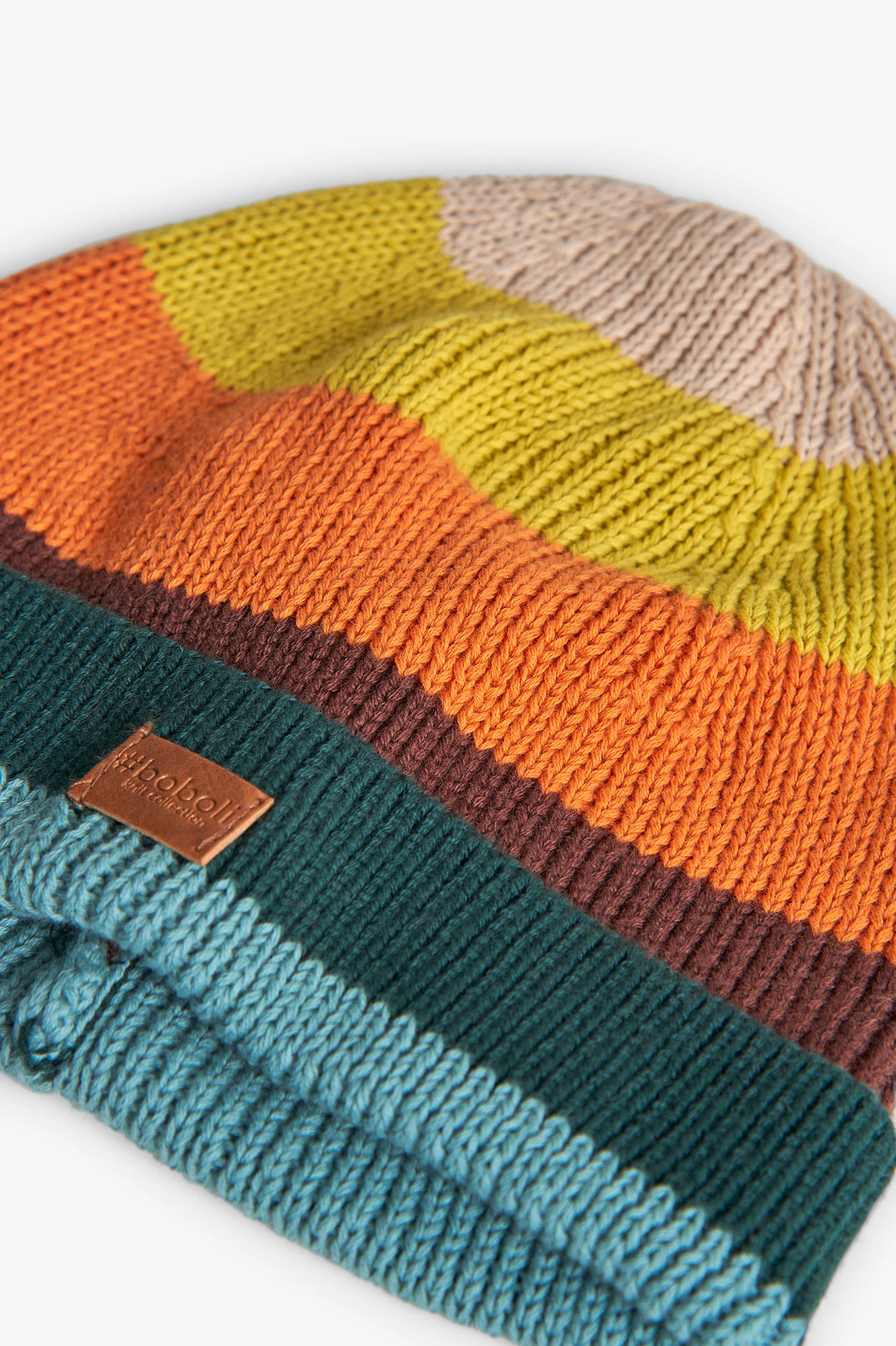 Berretto a maglia beige con strisce multicolori, perfetto per mantenere i bambini al caldo nei mesi più freddi. Il suo design combina tonalità beige, giallo, arancione, marrone e verde, aggiungendo un tocco divertente e colorato all'abbigliamento invernale. Realizzato con un tessuto morbido e caldo, garantisce comfort e protezione contro il freddo. Disponibile nelle taglie dalla M alla XXL, è ideale per bambini dai 2 anni in su. La sua versatilità permette di abbinarlo facilmente a cappotti e giacche, completando qualsiasi outfit invernale con stile e calore.
