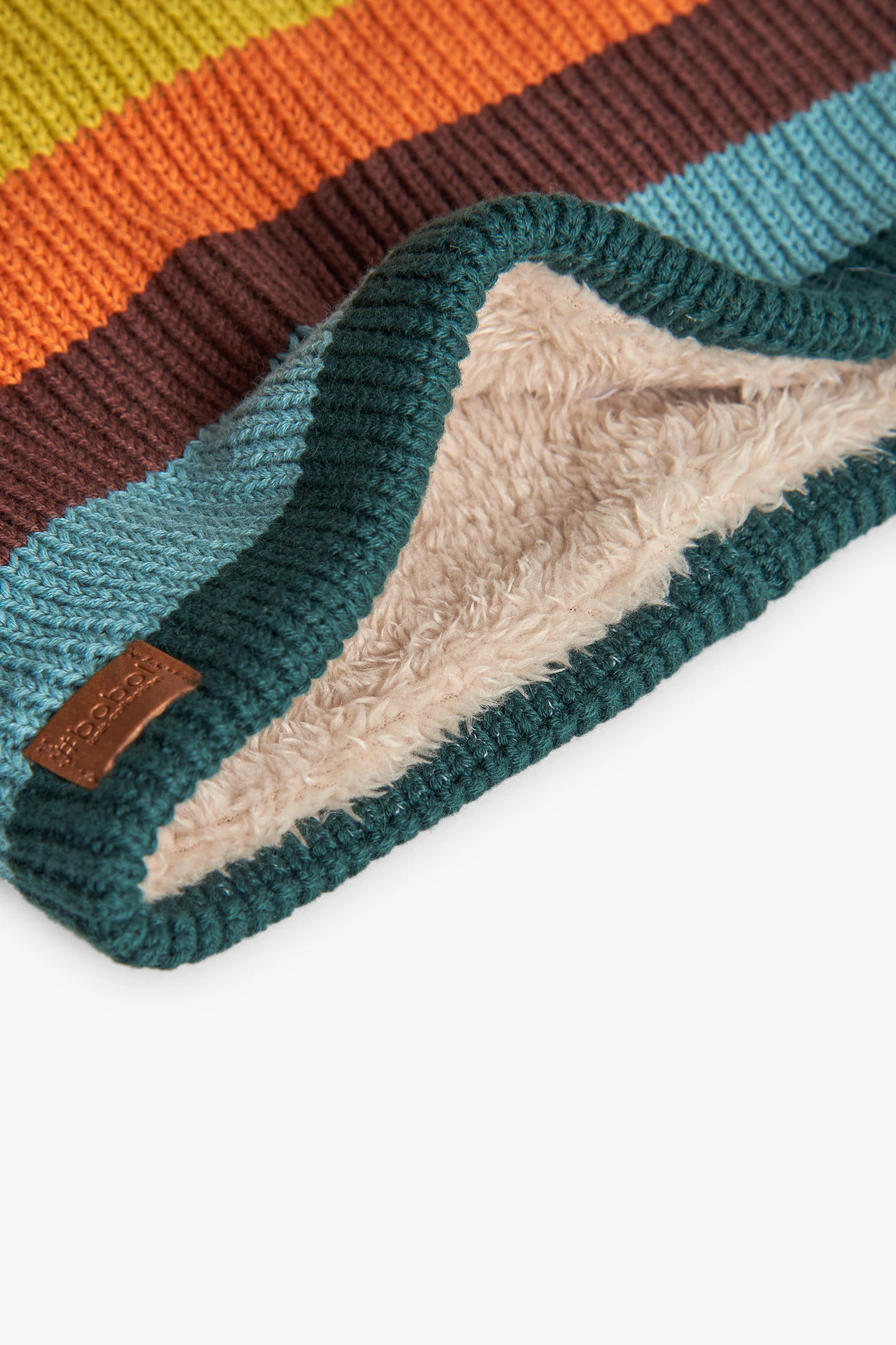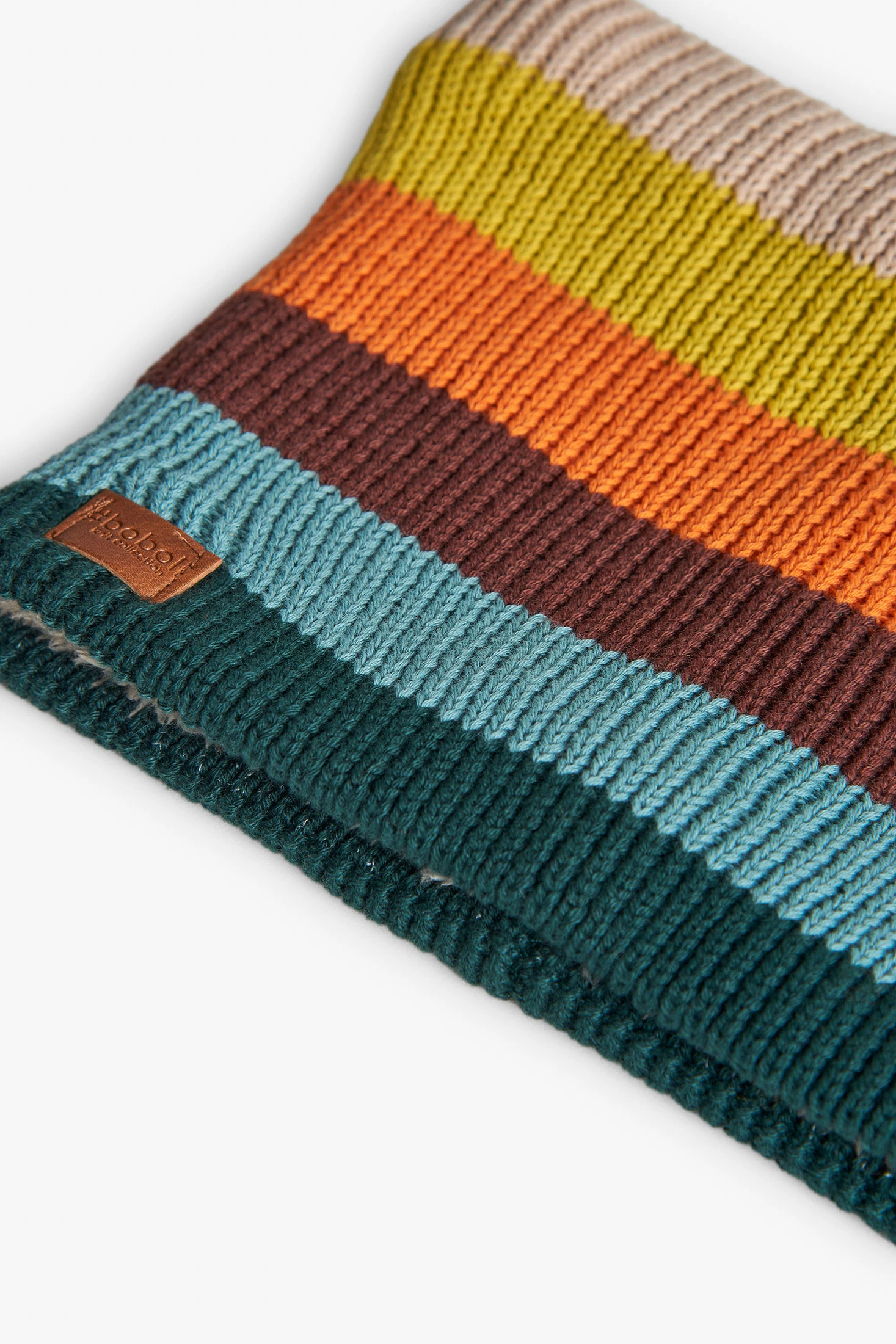 Sciarpa a maglia per bambino progettata per i mesi più freddi dell'anno. Realizzata in morbido tessuto a maglia, assicura calore e comfort, mentre il motivo a strisce nei toni del beige, giallo, arancione, marrone e blu aggiunge un tocco allegro e versatile. Facile da abbinare con giacche e maglioni in colori neutri, offre uno stile moderno e accogliente. Perfetta per proteggere il collo dal freddo durante le attività all'aperto, questo accessorio si presenta come un'opzione pratica e di stile.