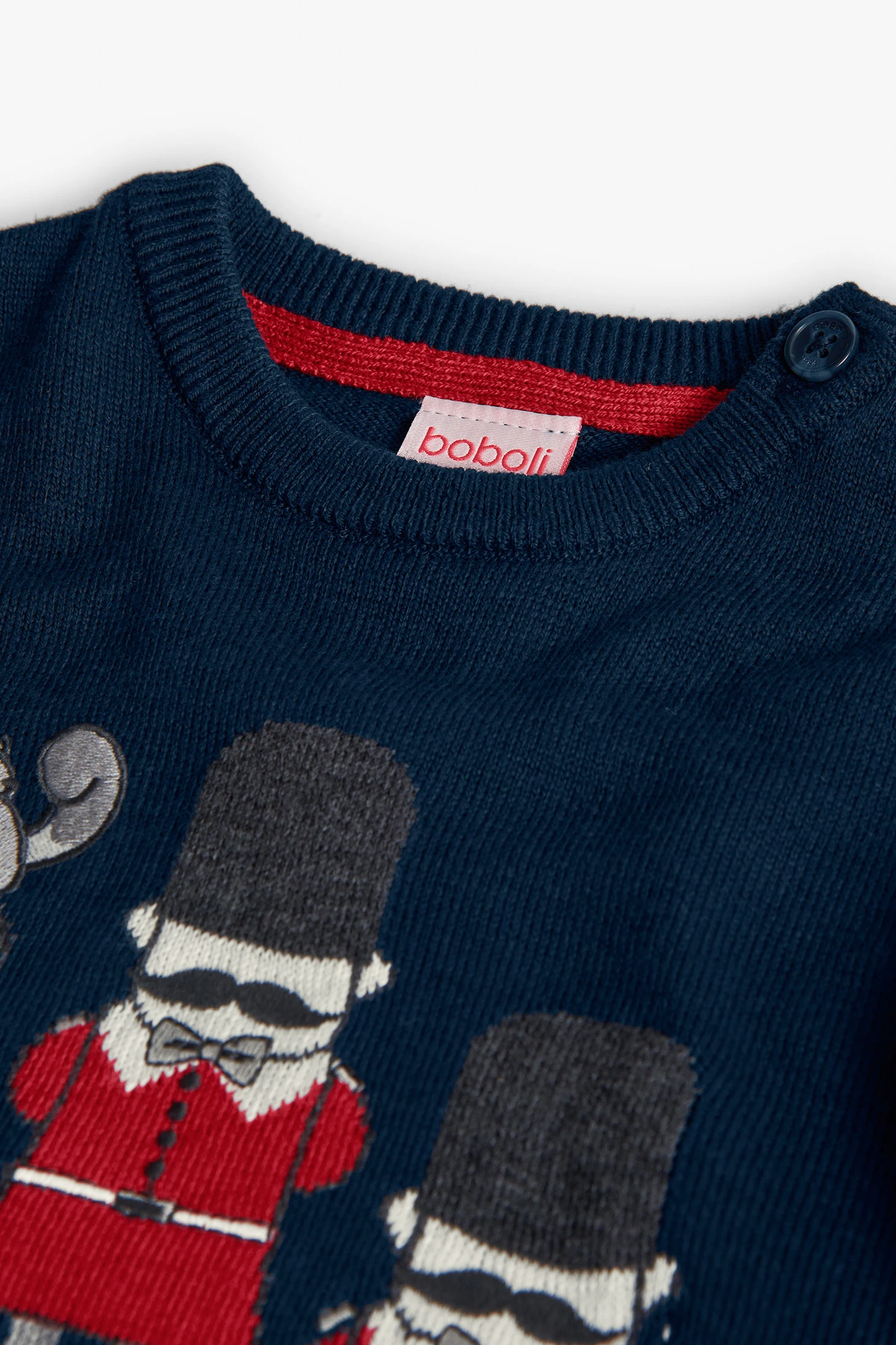 Maglione di maglia per bambino in blu navy, con un adorabile design di guardie e un animale su una di esse, perfetto per le stagioni autunnali e invernali. Realizzato in un tessuto morbido e caldo, offre comfort per l'uso quotidiano del tuo bambino. Presenta un collo rotondo e maniche lunghe, oltre a due bottoni sulla spalla che ne facilitano l'indossamento. Disponibile in taglie a partire da 12 mesi, è ideale per mantenere i più piccoli al caldo e con stile durante i giorni più freddi. Abbinalo a pantaloni o gonne in tonalità neutre per un look classico ed elegante.